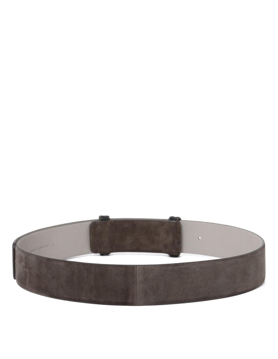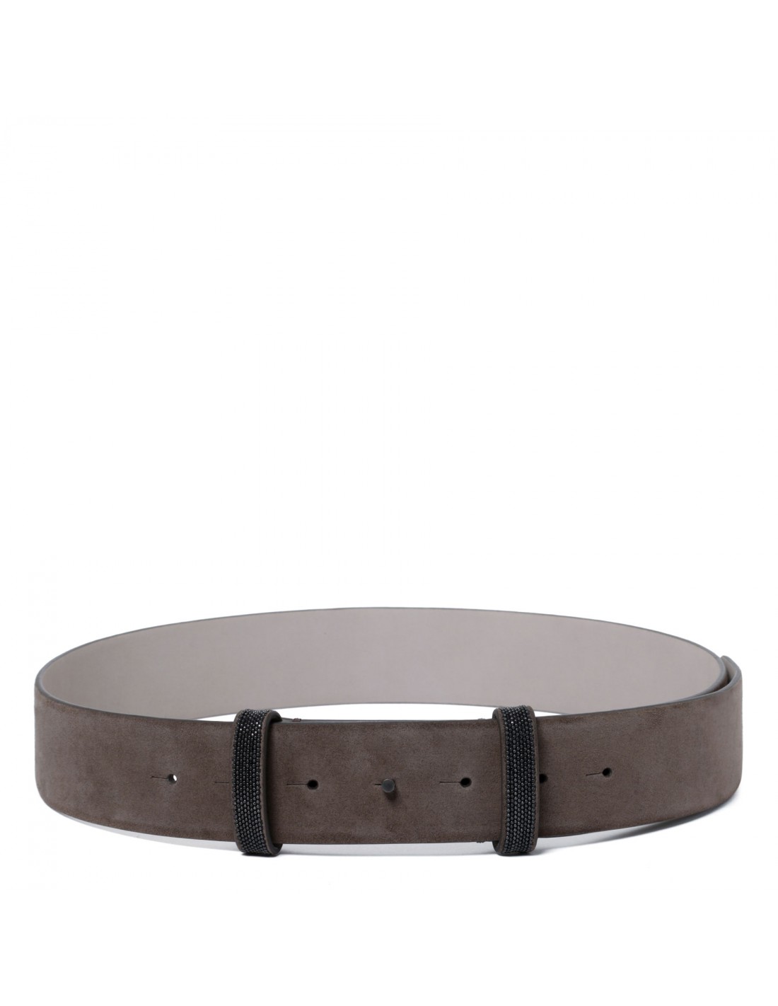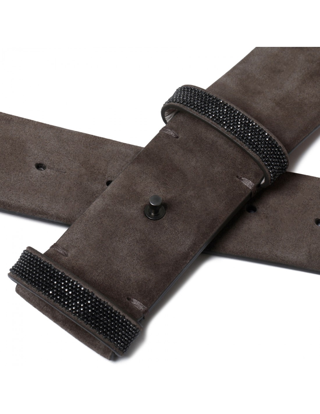 Suede leather belt from Brunello Cucinelli featuring double leather loop with monili embellishment, press stud closure.
