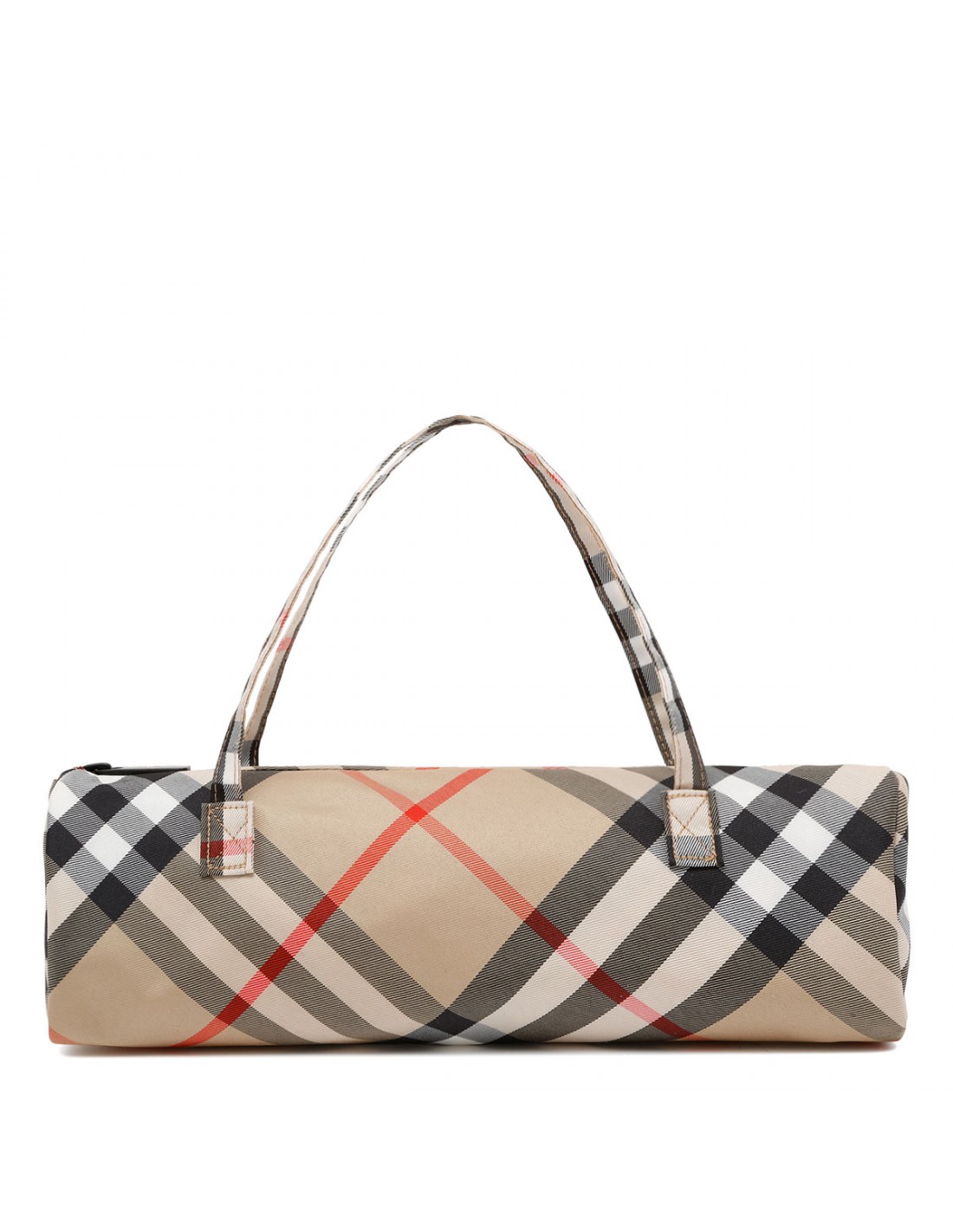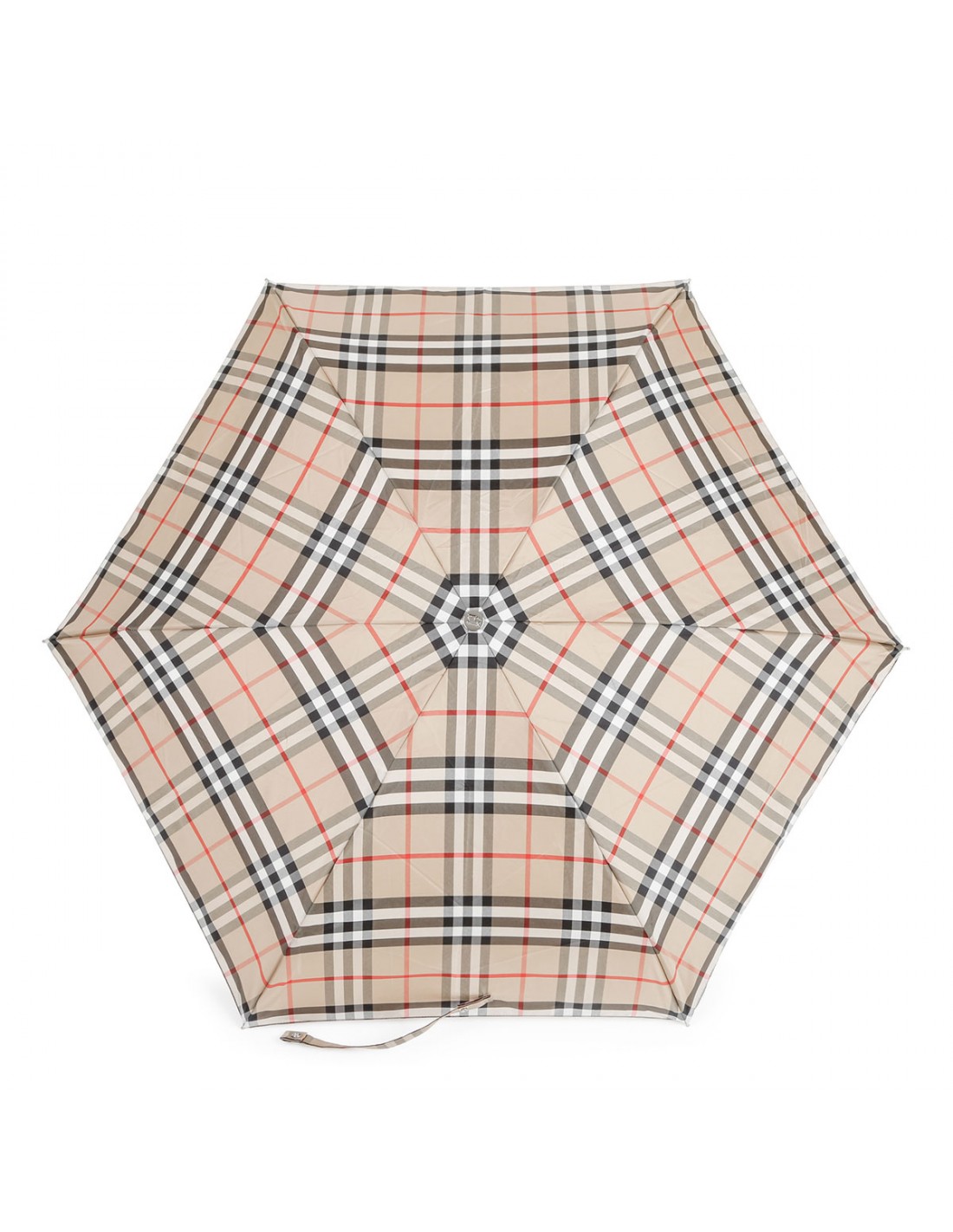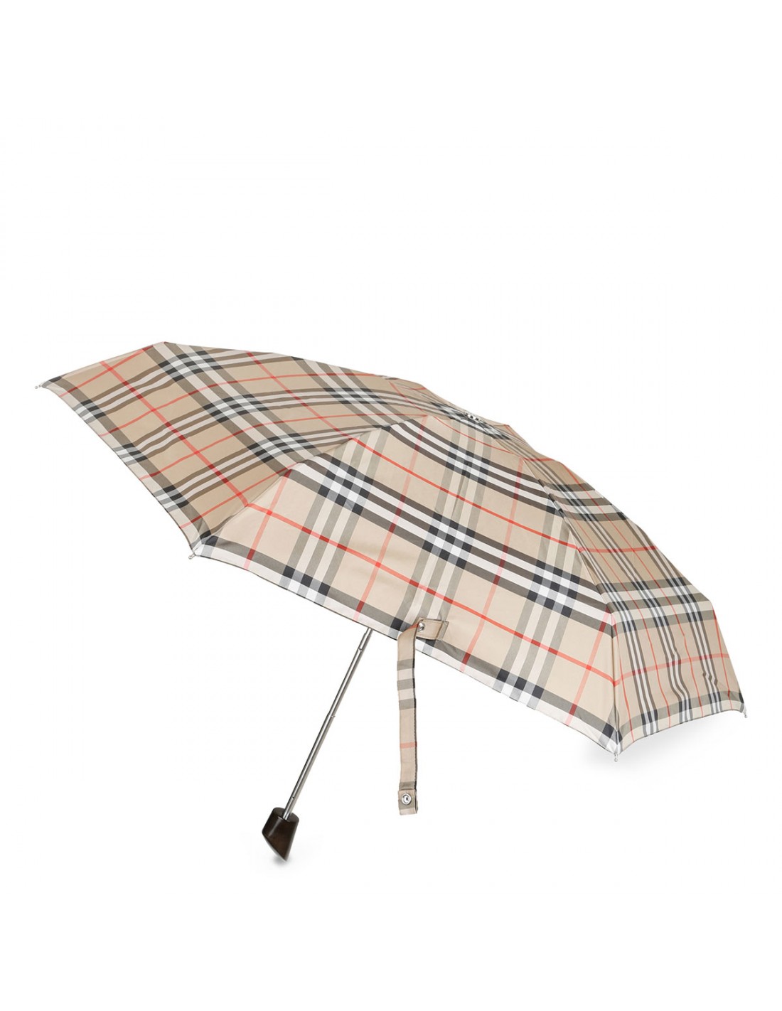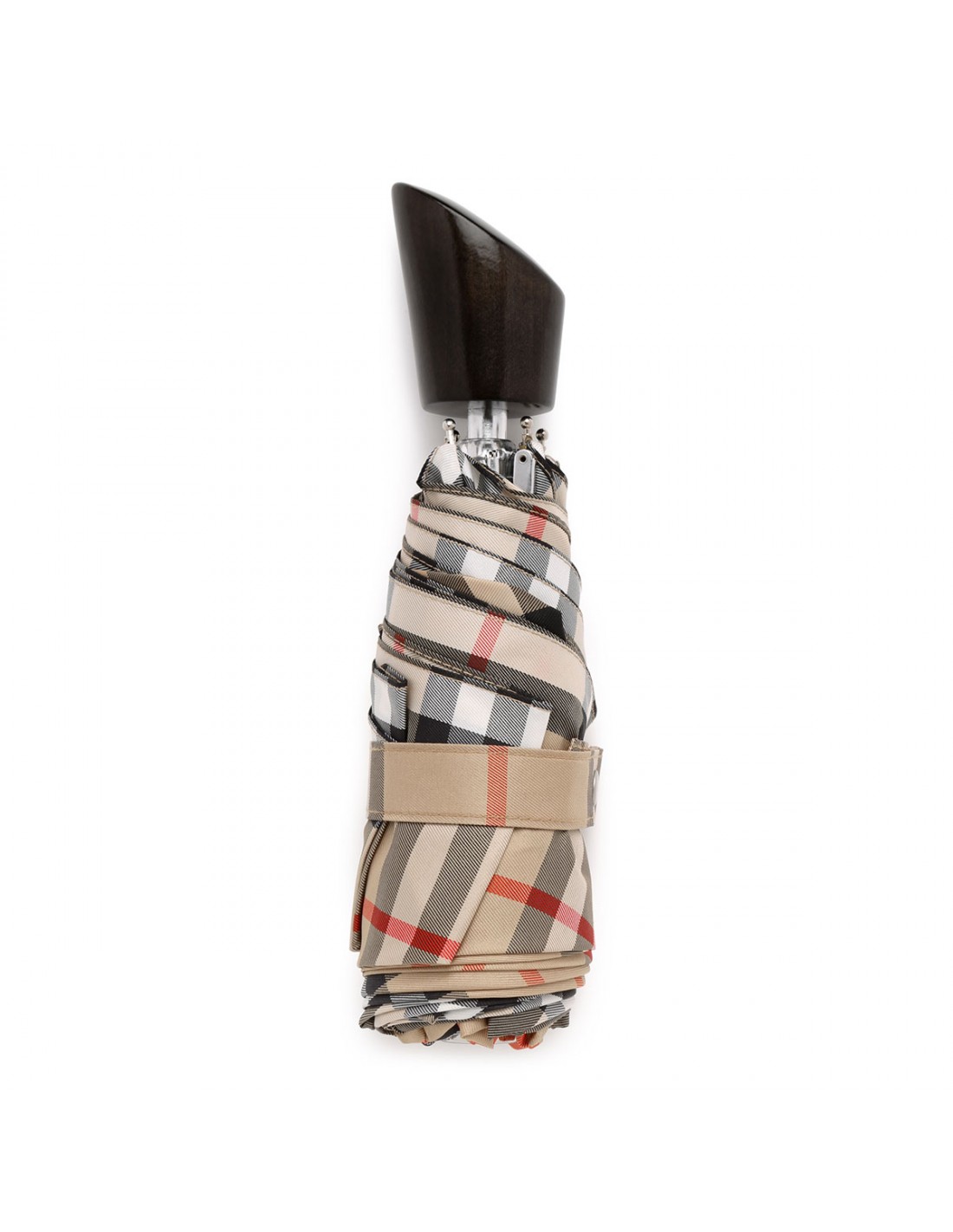 Burberry Check folding umbrella from Burberry featuring smooth wooden handle, metal cap engraved with Equestrian Knight Design, press-stud closure. Comes with coordinating zipped pouch.