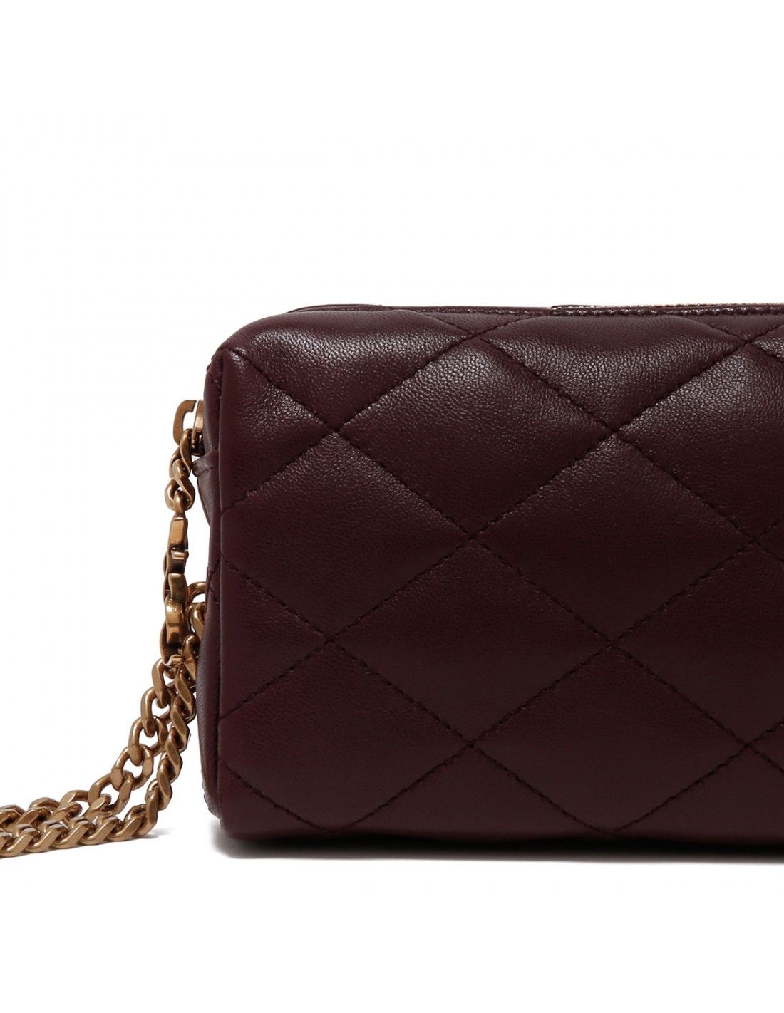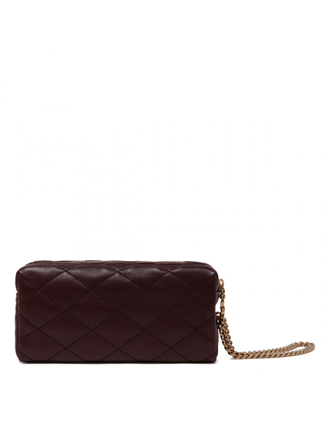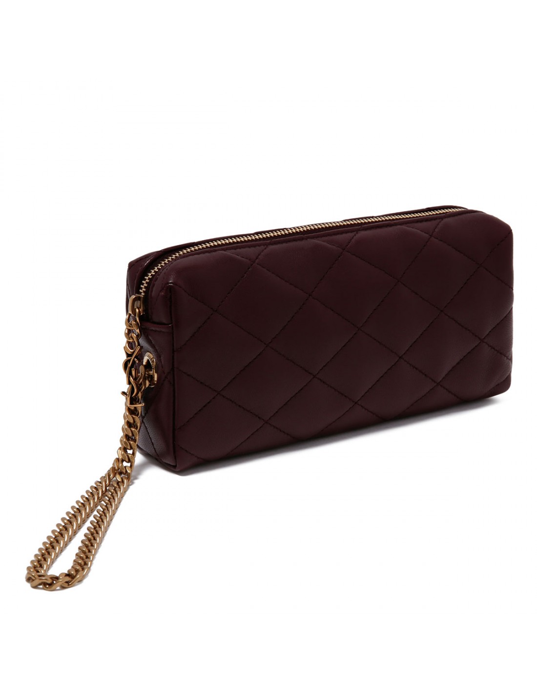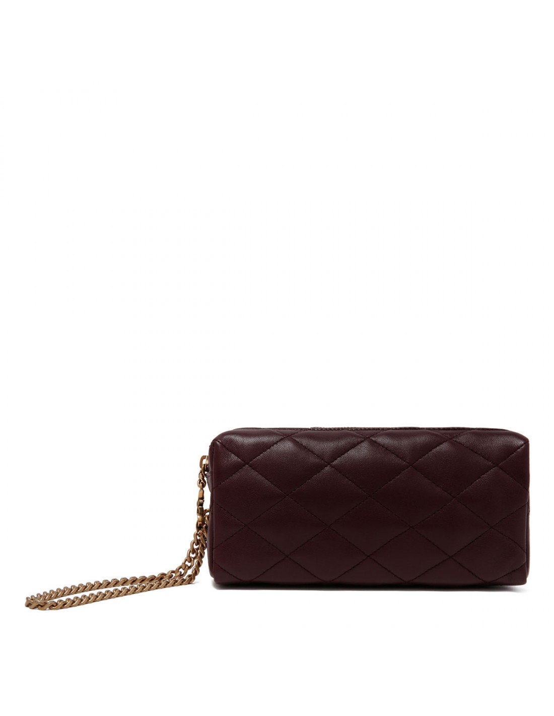 Cabernet red hue matelassé leather Cassandre bijou pouch from Saint Laurent featuring Cassandre jewelry chain wrist strap, diamond quilting, zip closure, bronze-tone hardware, cotton lining and internal flat pocket.