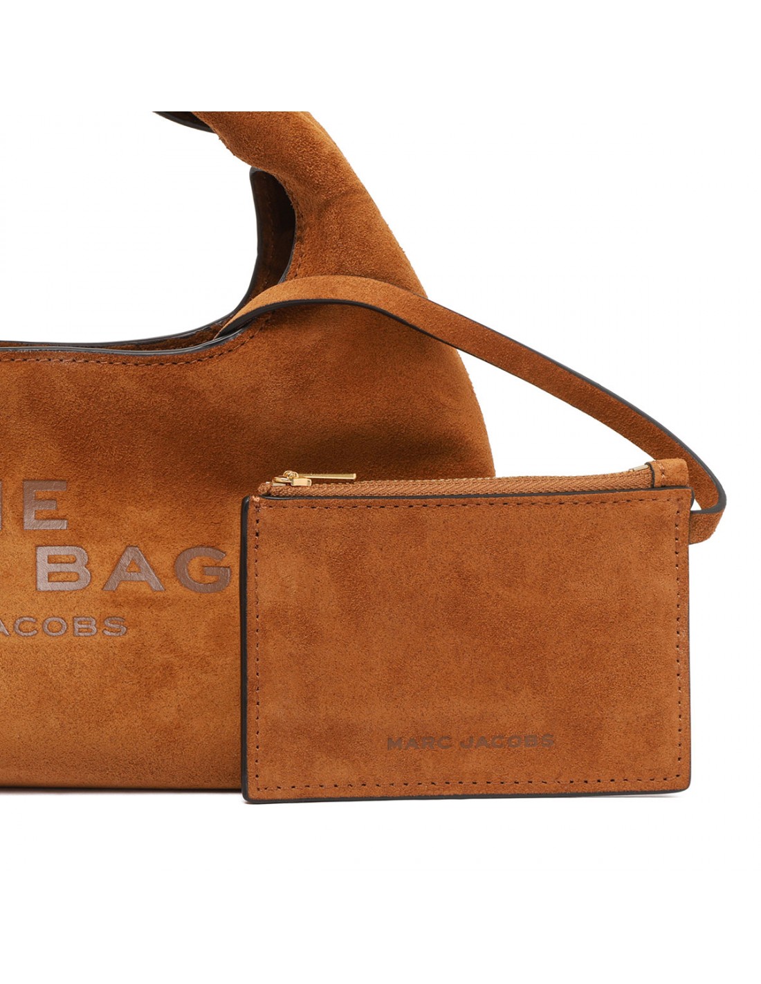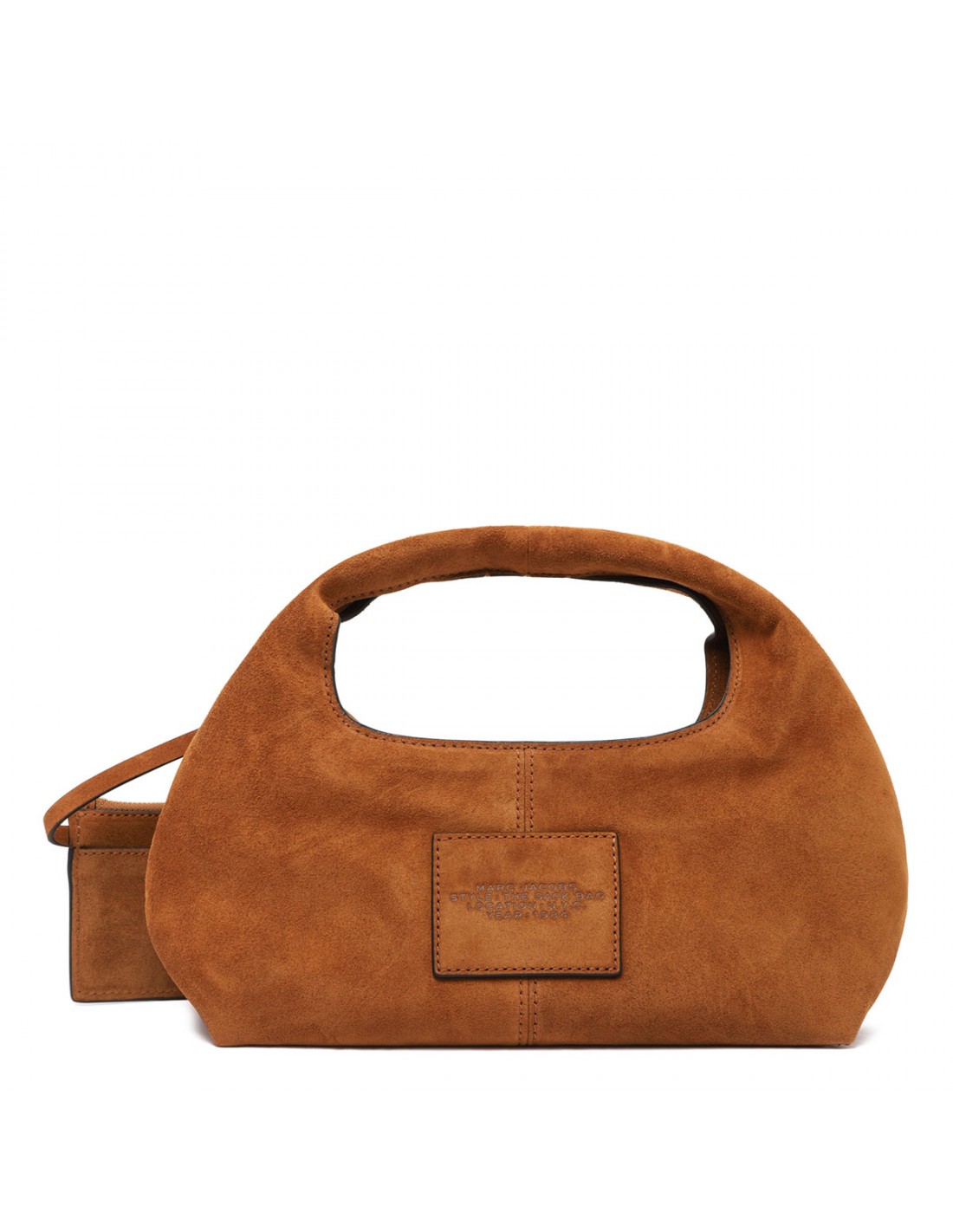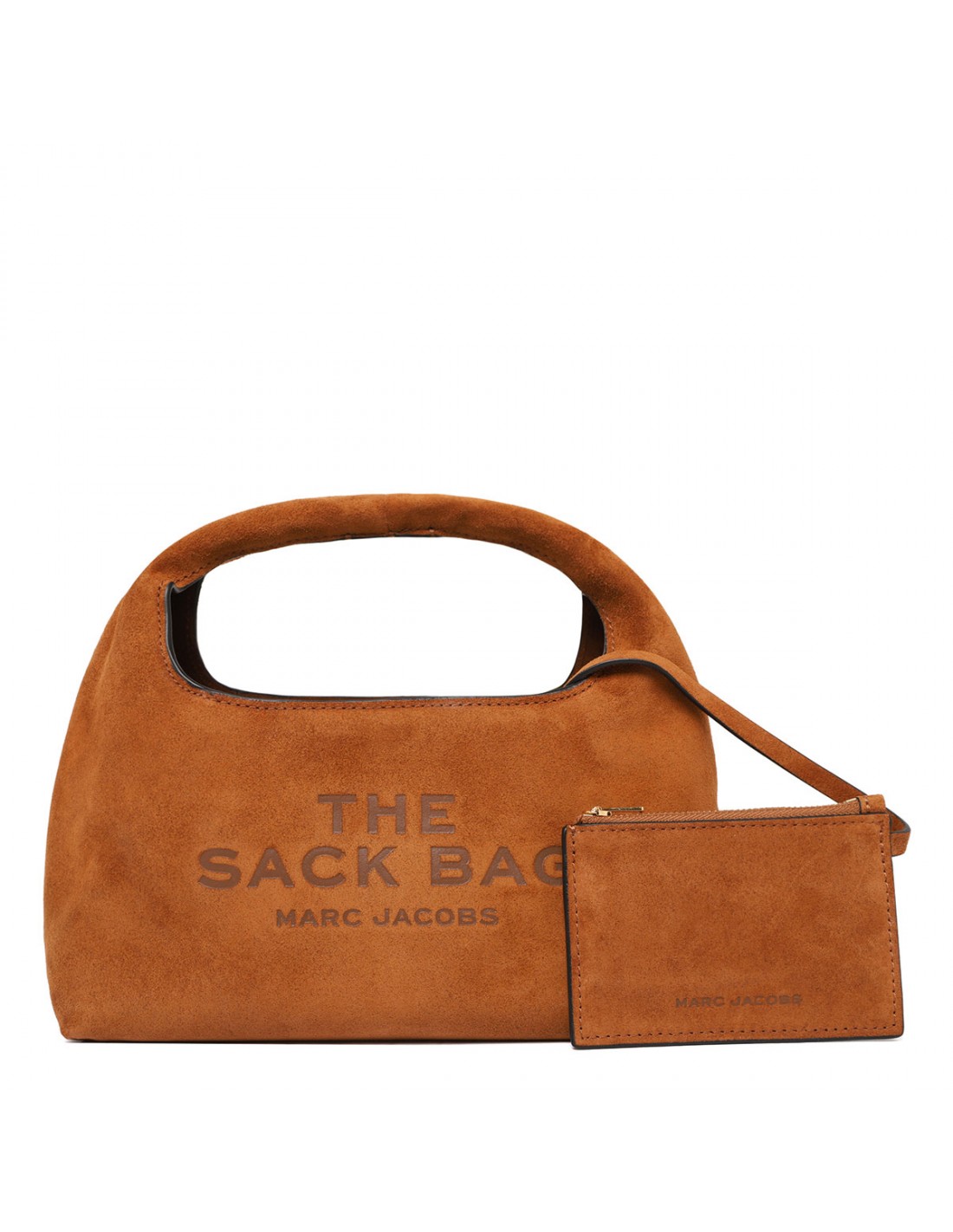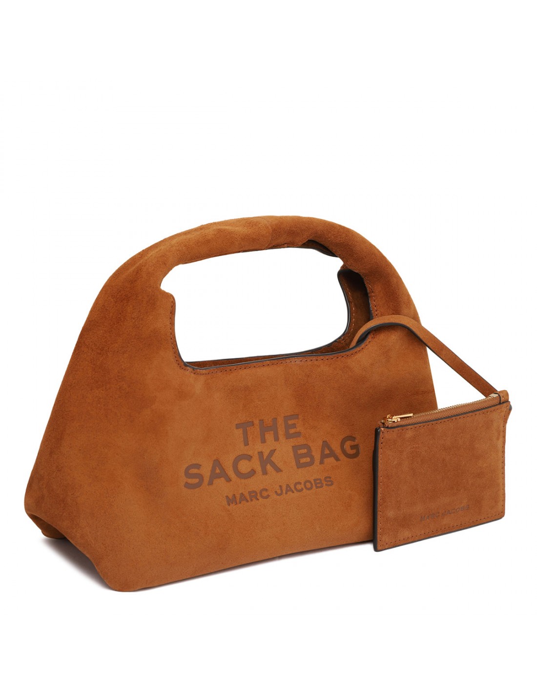 Copper hue suede leather The Mini Sack Bag from Marc Jacobs featuring logo embossed, magnetic closure, detachable inner pouch with zip closure, top handle, twill lining.