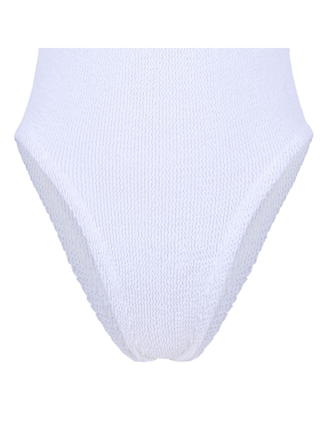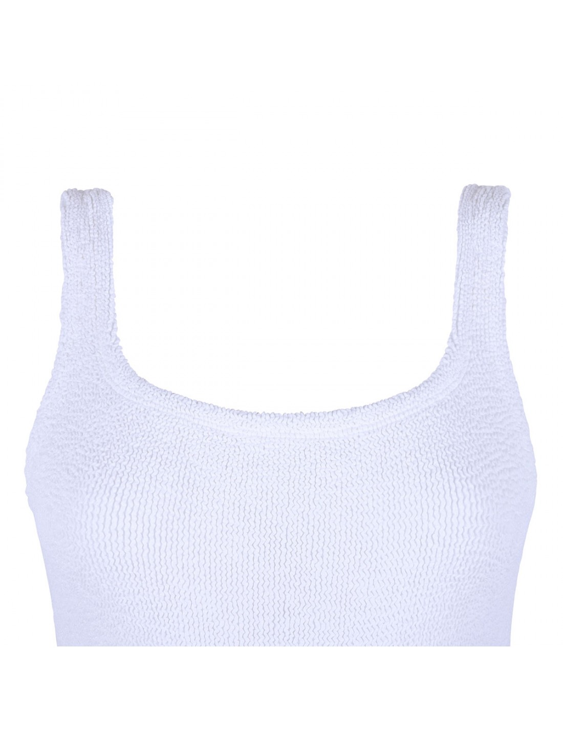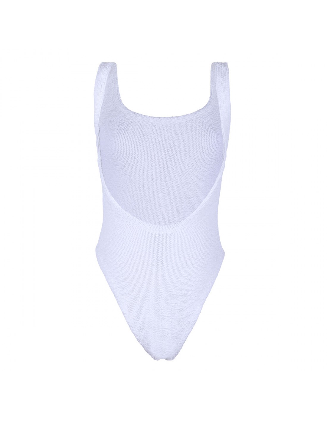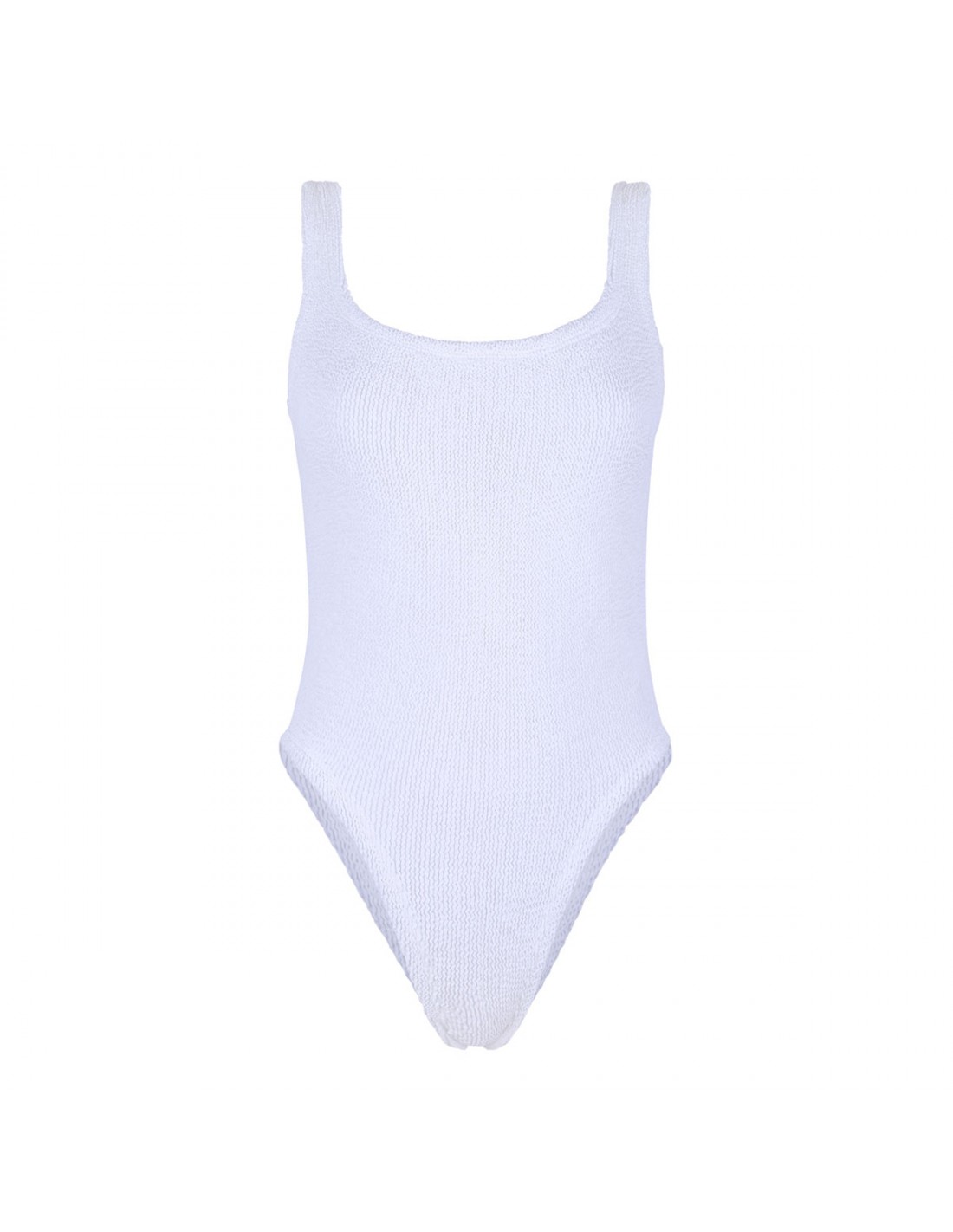 White crinkle tech fabric swimsuit from Hunza G featuring square neckline, low-cut back, high cut leg, moderate coverage bottom.