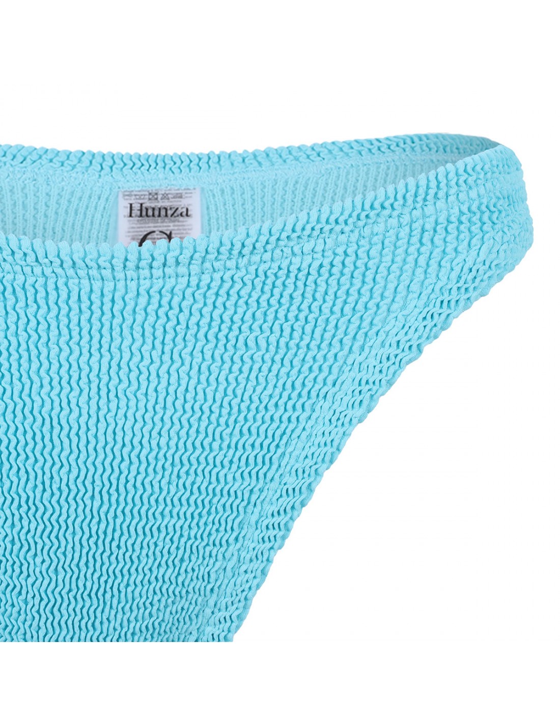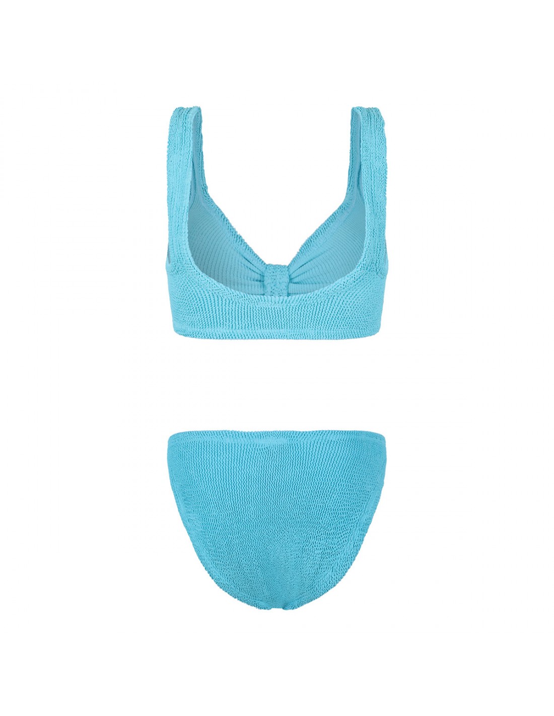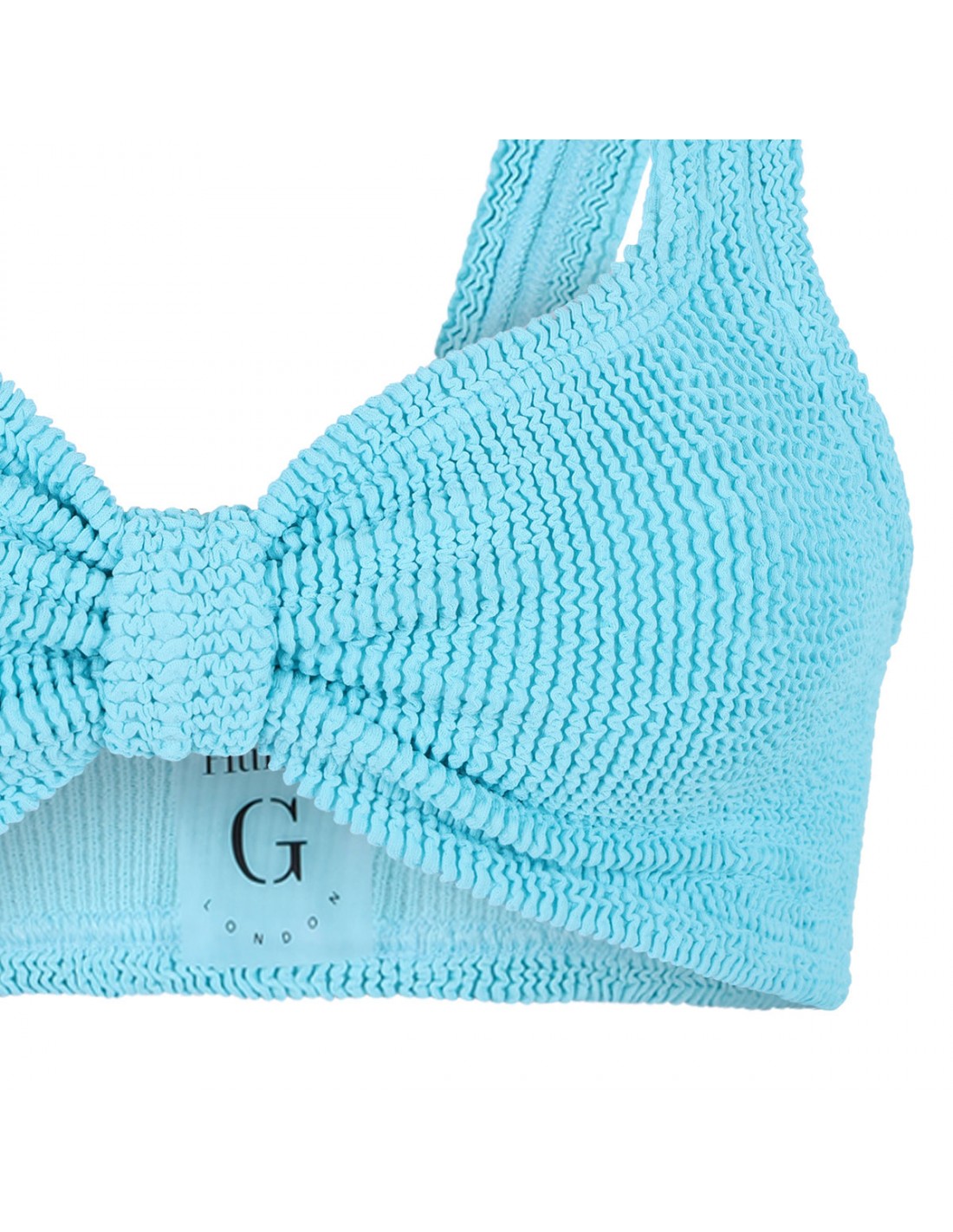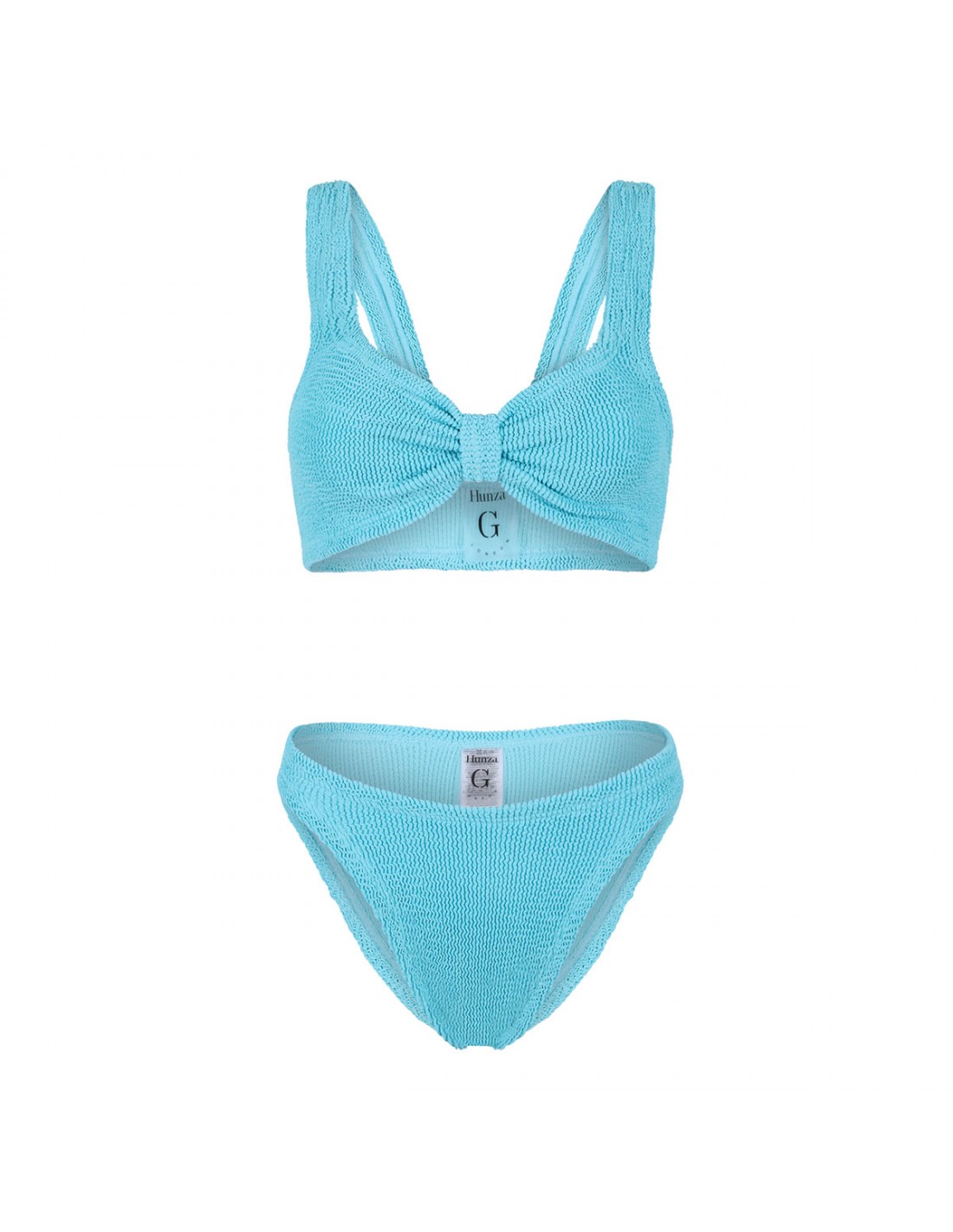 Aqua blue crinkle tech fabric Bonnie bikini set from Hunza G featuring bralette with gathered bow-effect detailing, high rise, high cut leg, moderate coverage bottom.