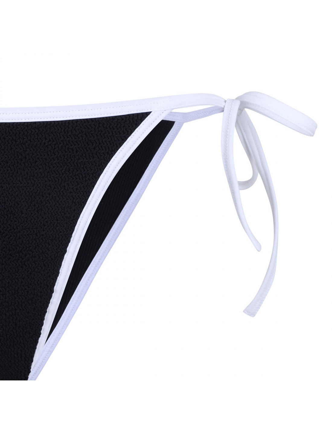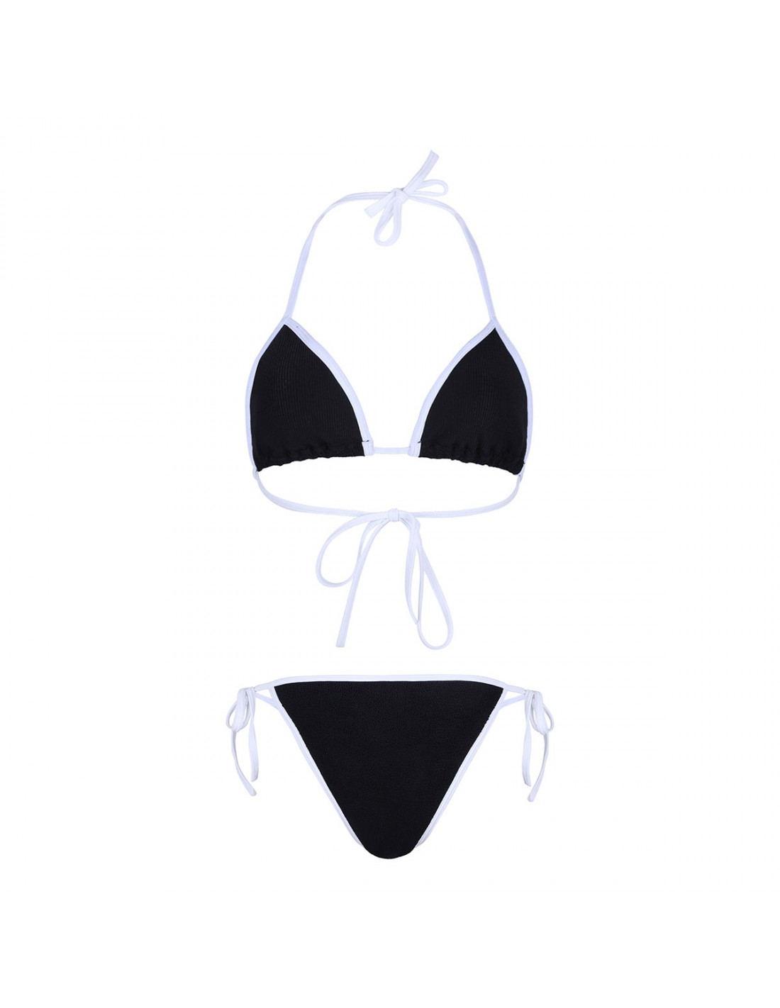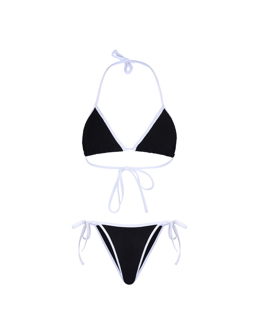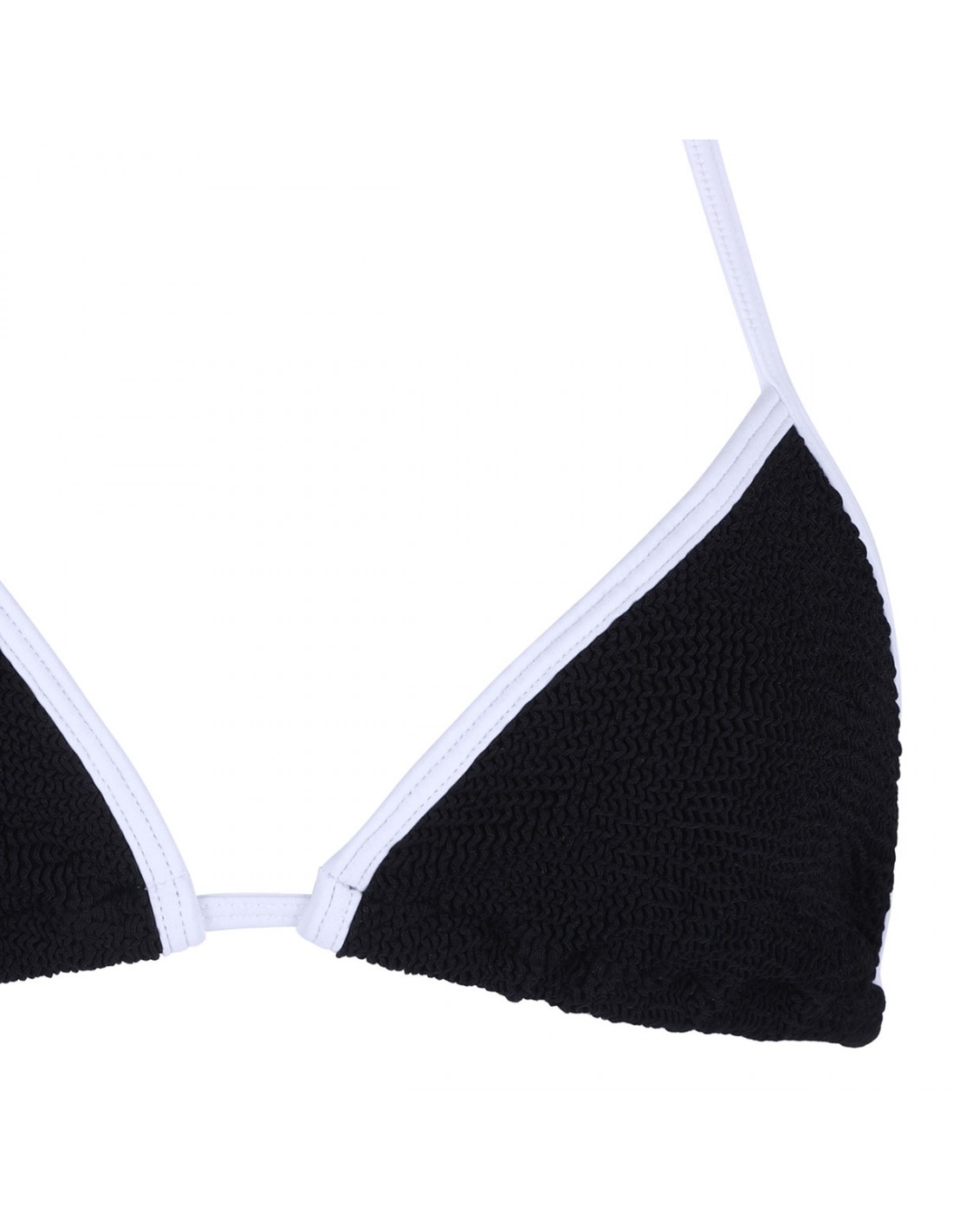 Black crinkle tech fabric Gina bikini set from Hunza G featuring contrasting trims, triangle cup bra, halter neck ties, adjustable ties at back, adjustable side ties at brief, moderate coverage bottom.