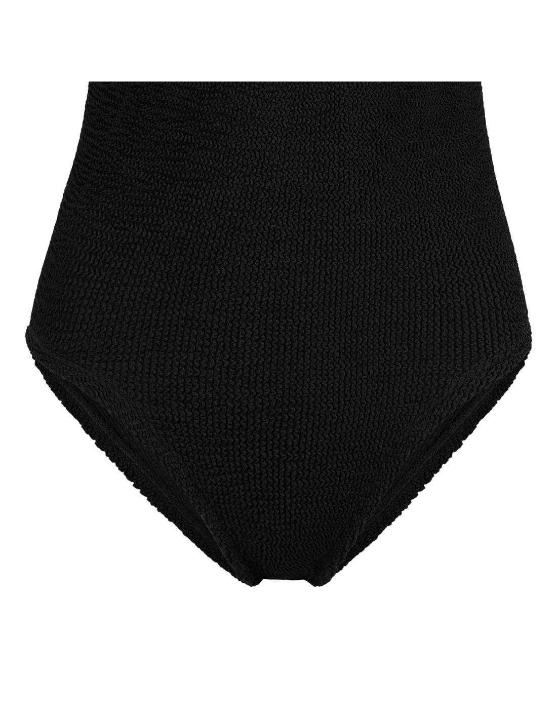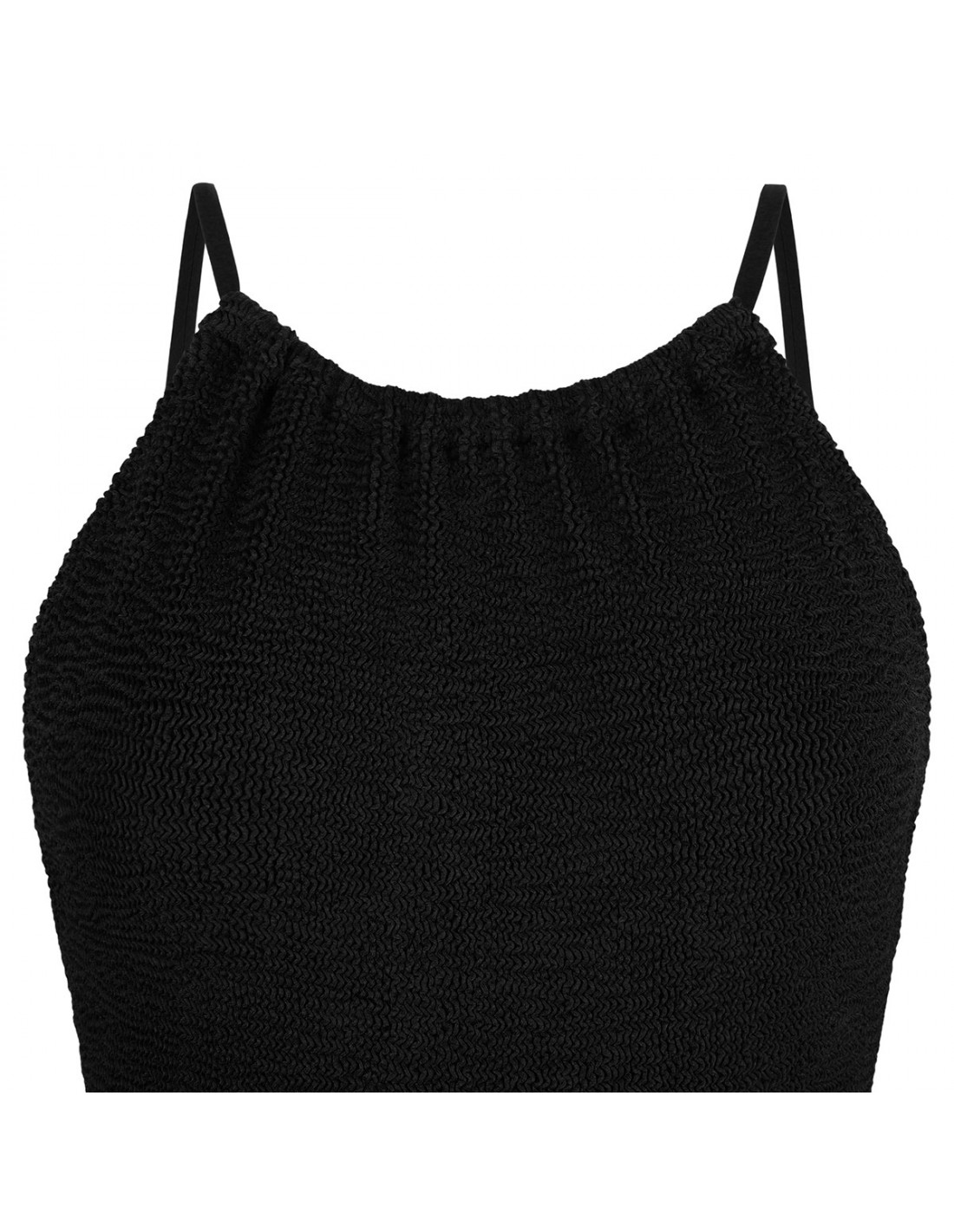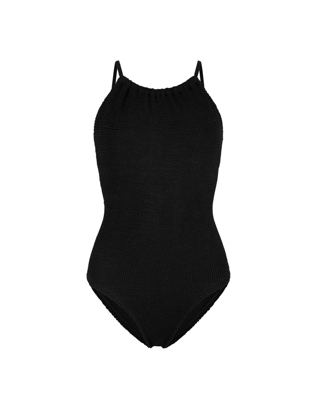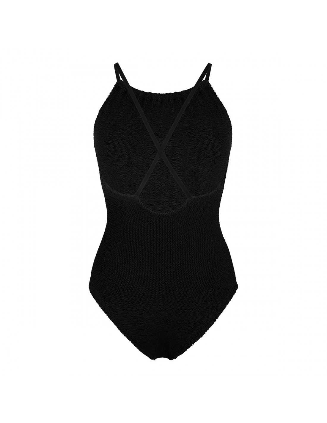 Black crinkle fabric Portia swimsuit from Hunza G featuring high-neck with delicate tone-on-tone straps, crisscross back detailing, low-cut back, high cut leg, moderate coverage bottom.