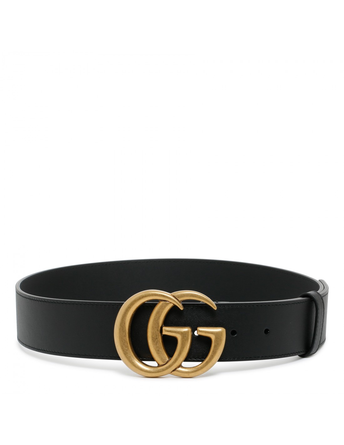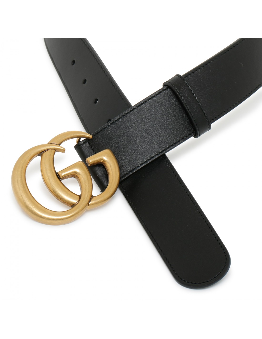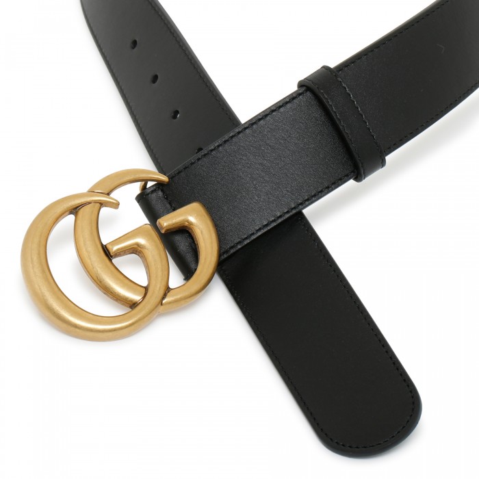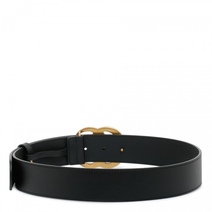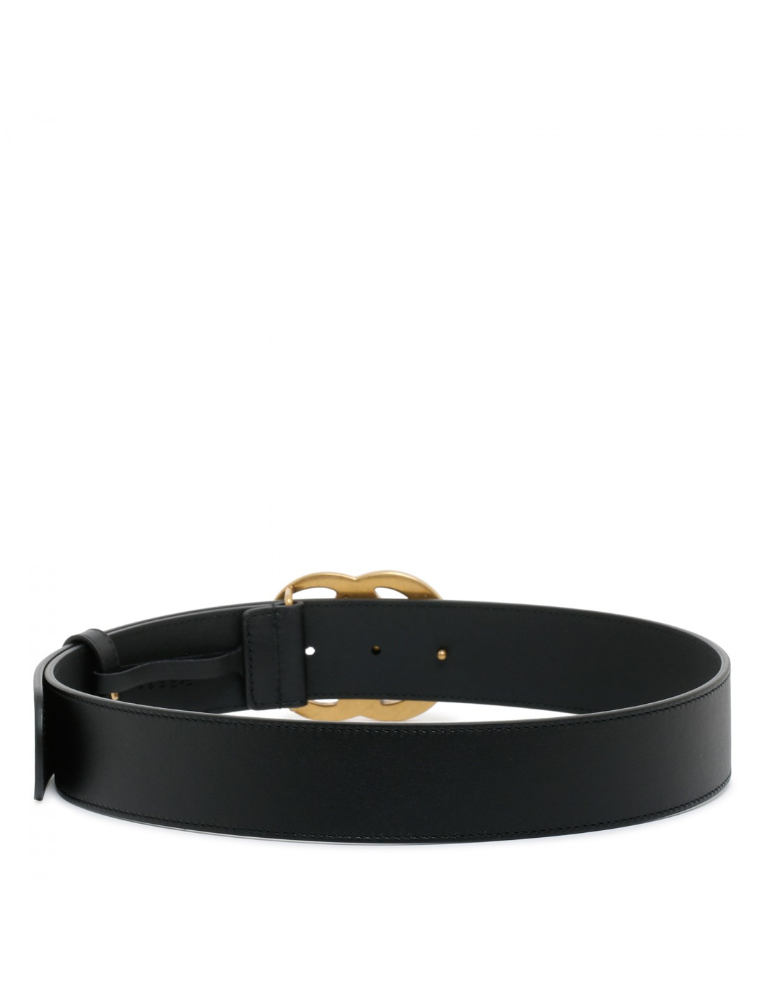Black leather 2015 Re-Edition belt from Gucci featuring golden metal double G buckle closure and leather loop.