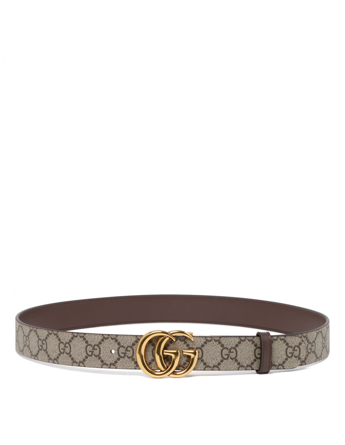 Reversible belt from Gucci featuring one side in beige and ebony GG Supreme canvas, other side in brown leather, aged gold-toned double G buckle and hardware, leather loop.
