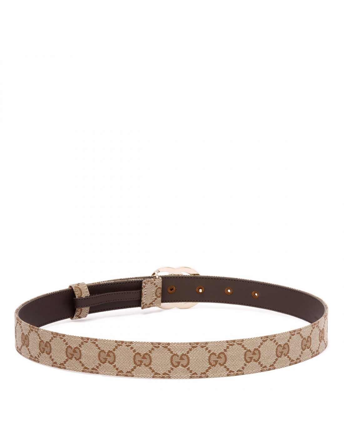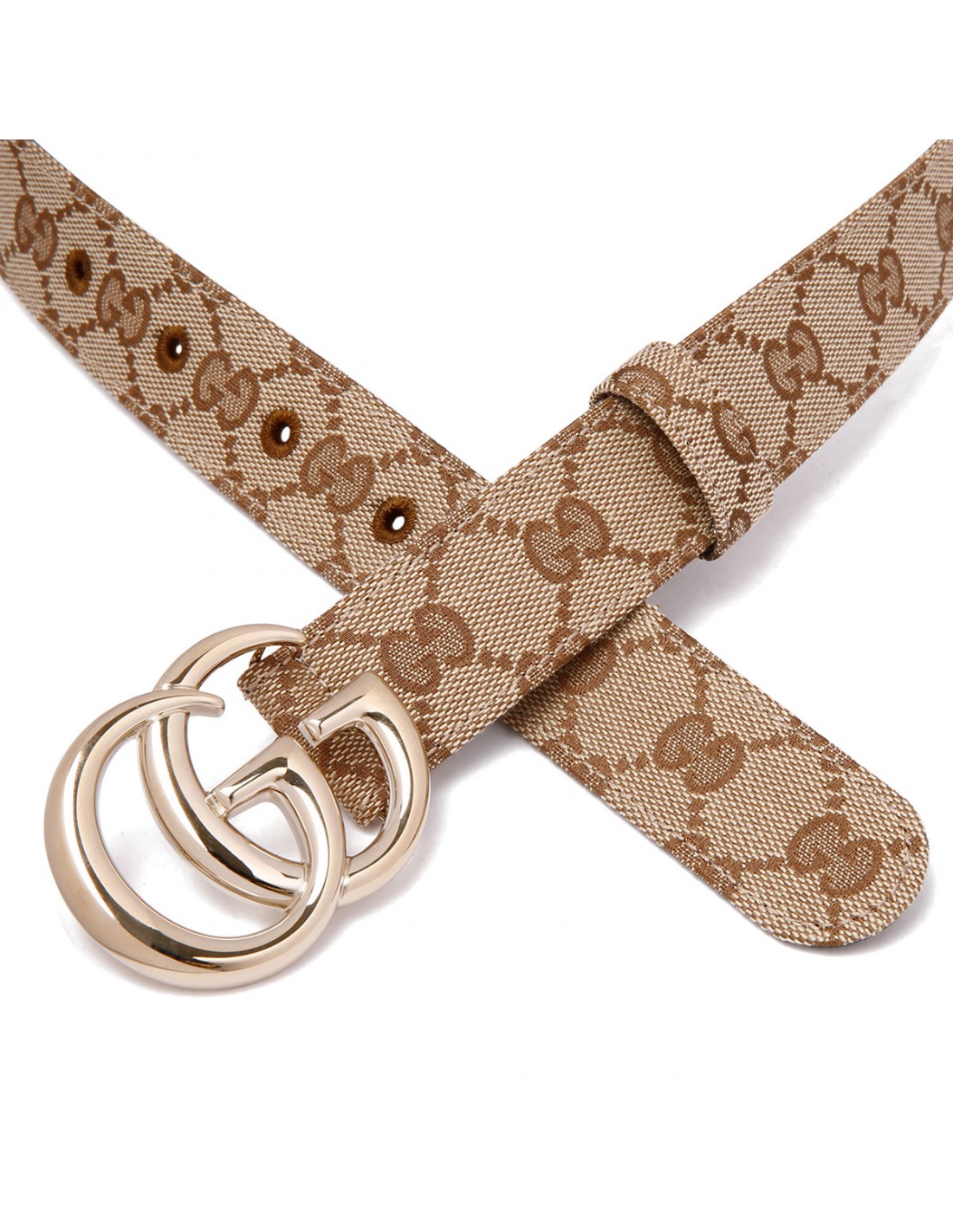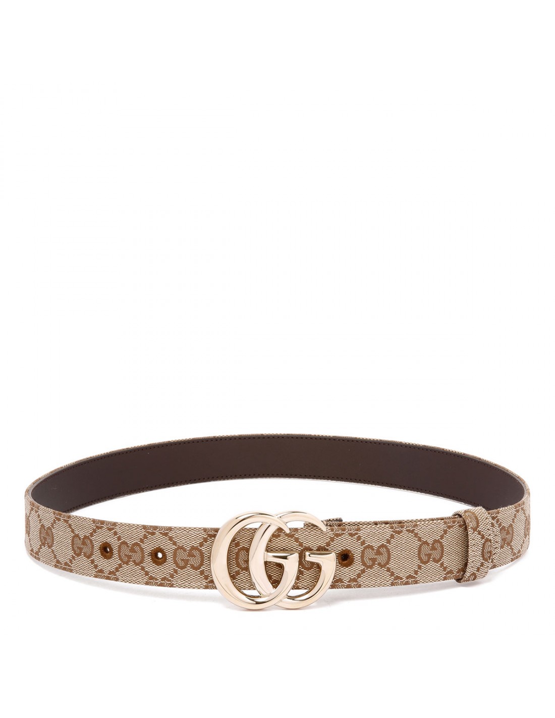 Beige and ebony original canvas GG Marmont thin belt from Gucci featuring GG motif, dark brown leather trims, light gold-toned double G buckle and hardware.