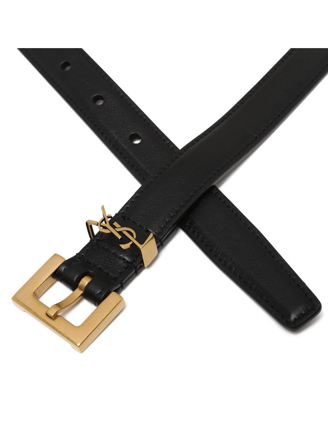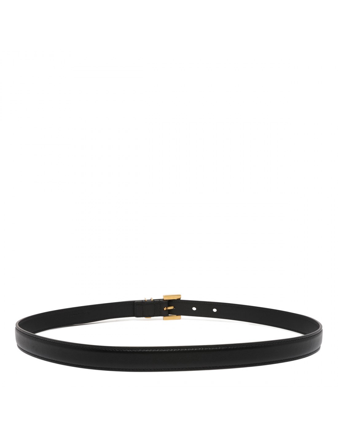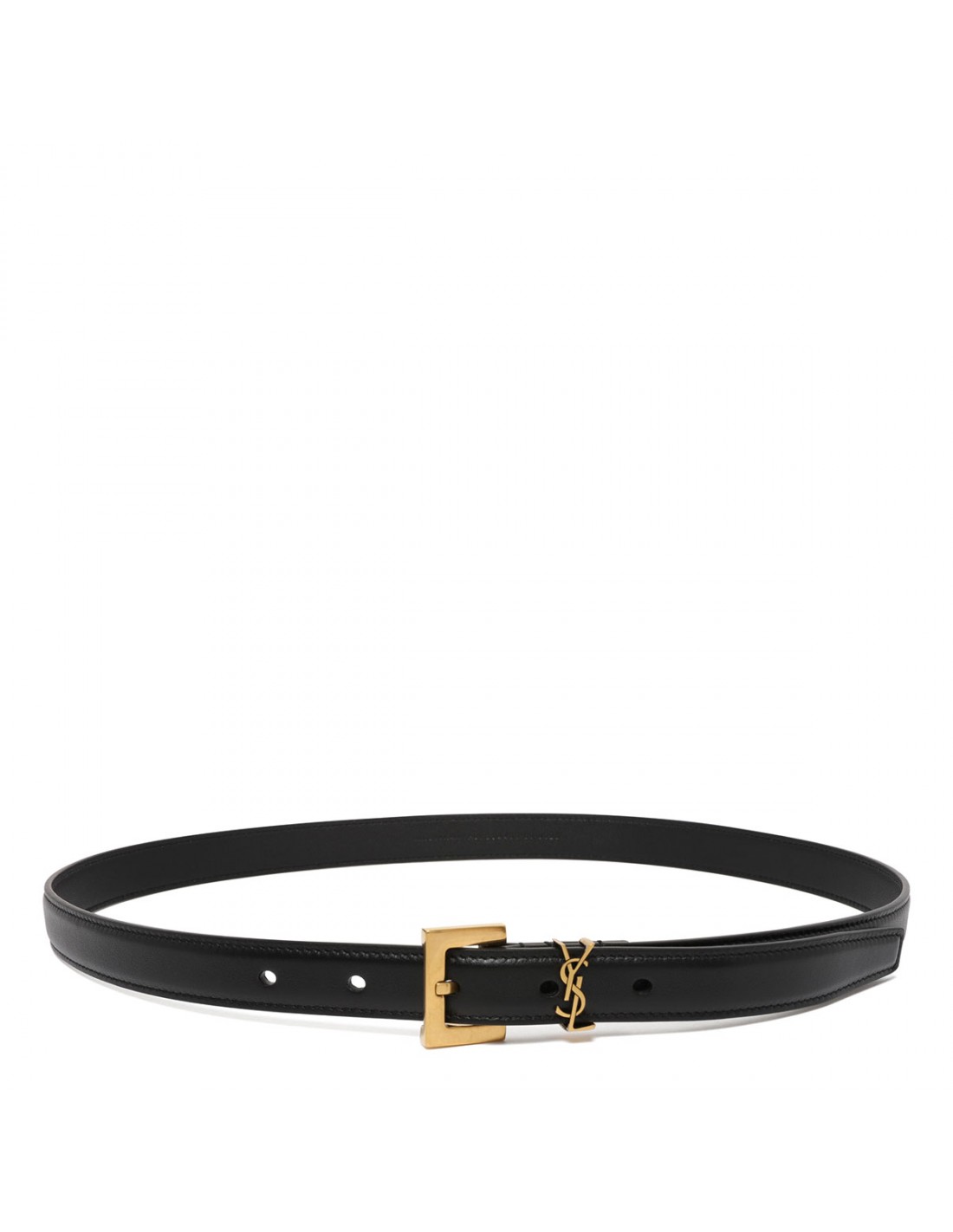 Black smooth leather Cassandre thin belt from Saint Laurent featuring gold-toned Cassandre logo loop, adjustable square buckle fastening.