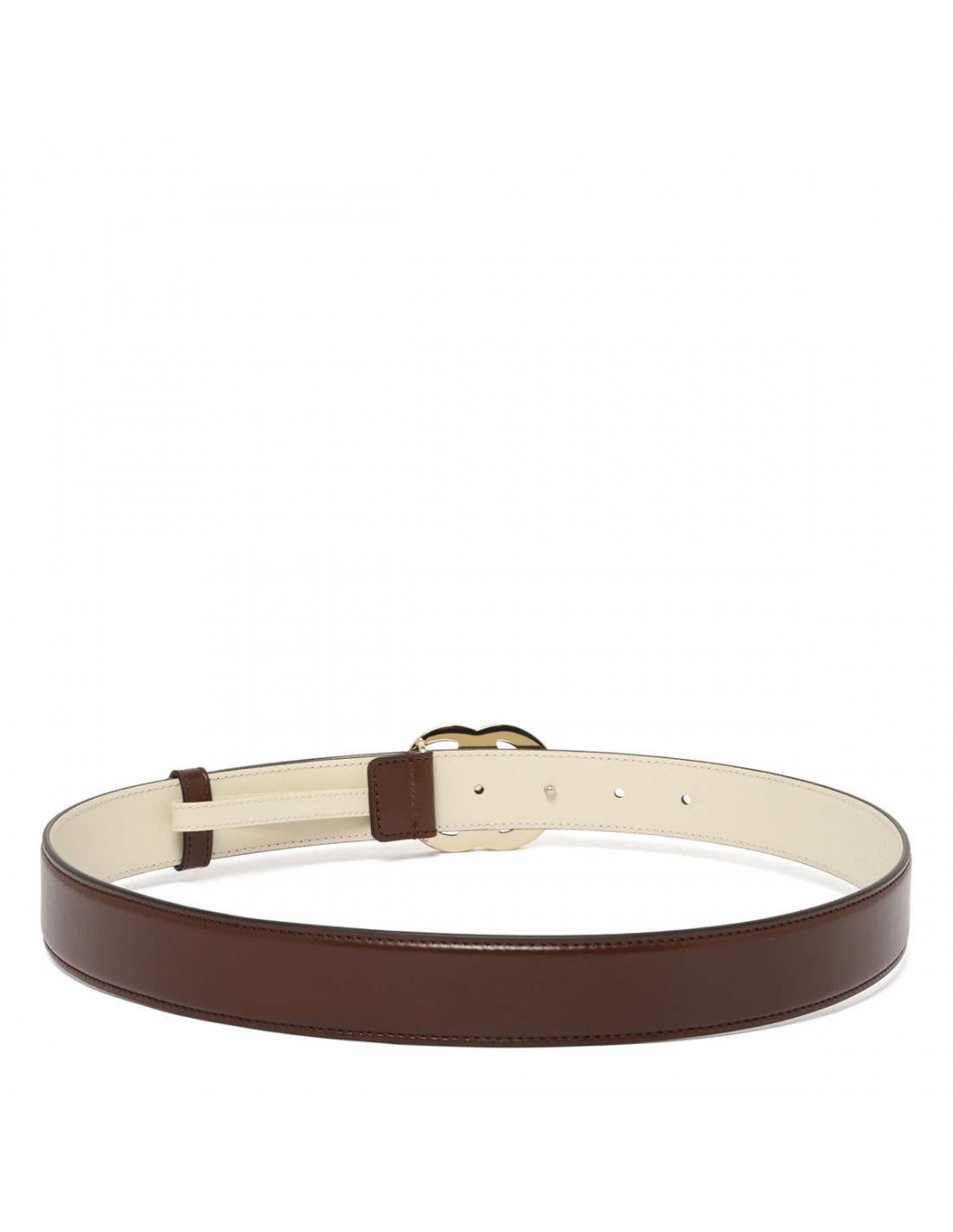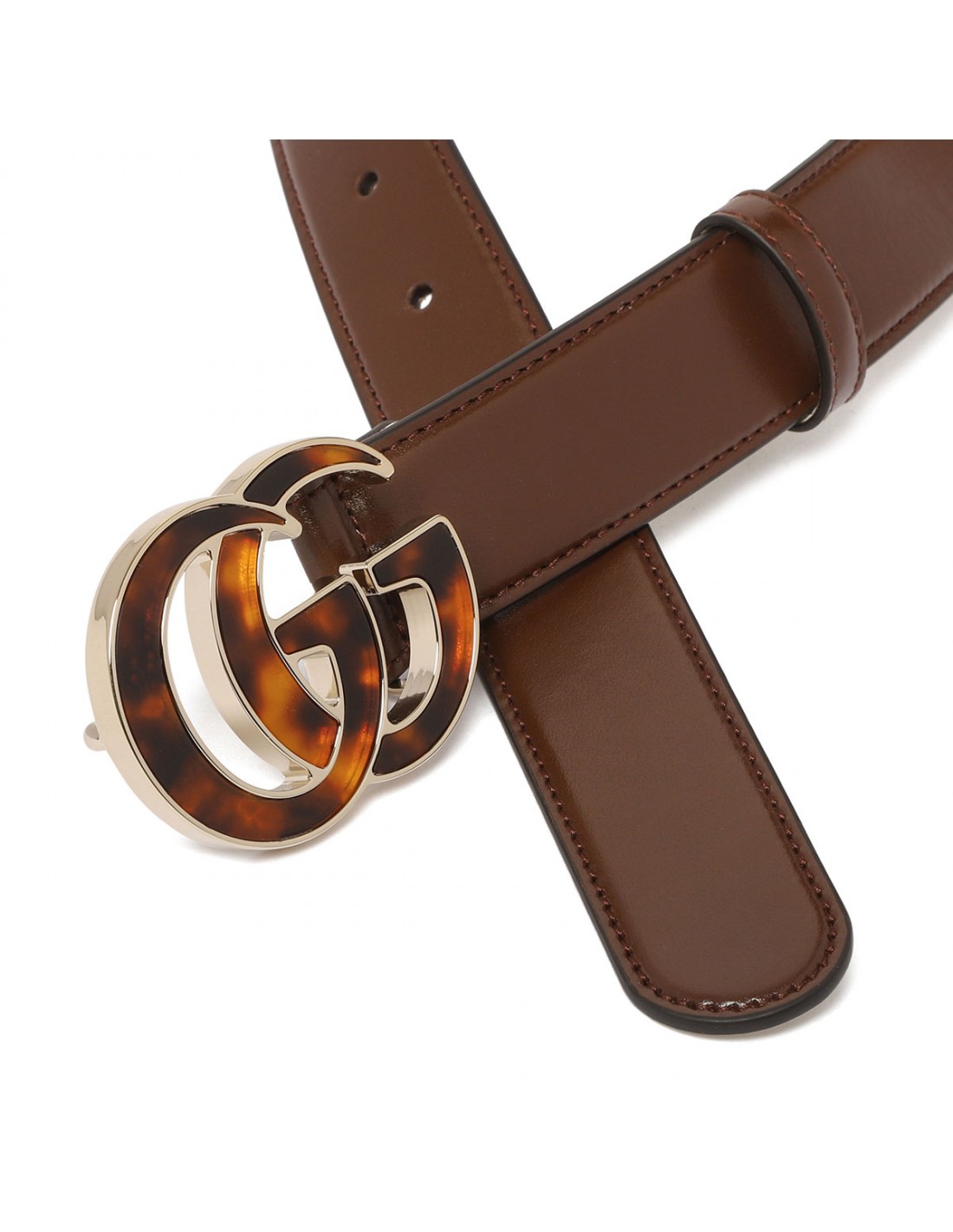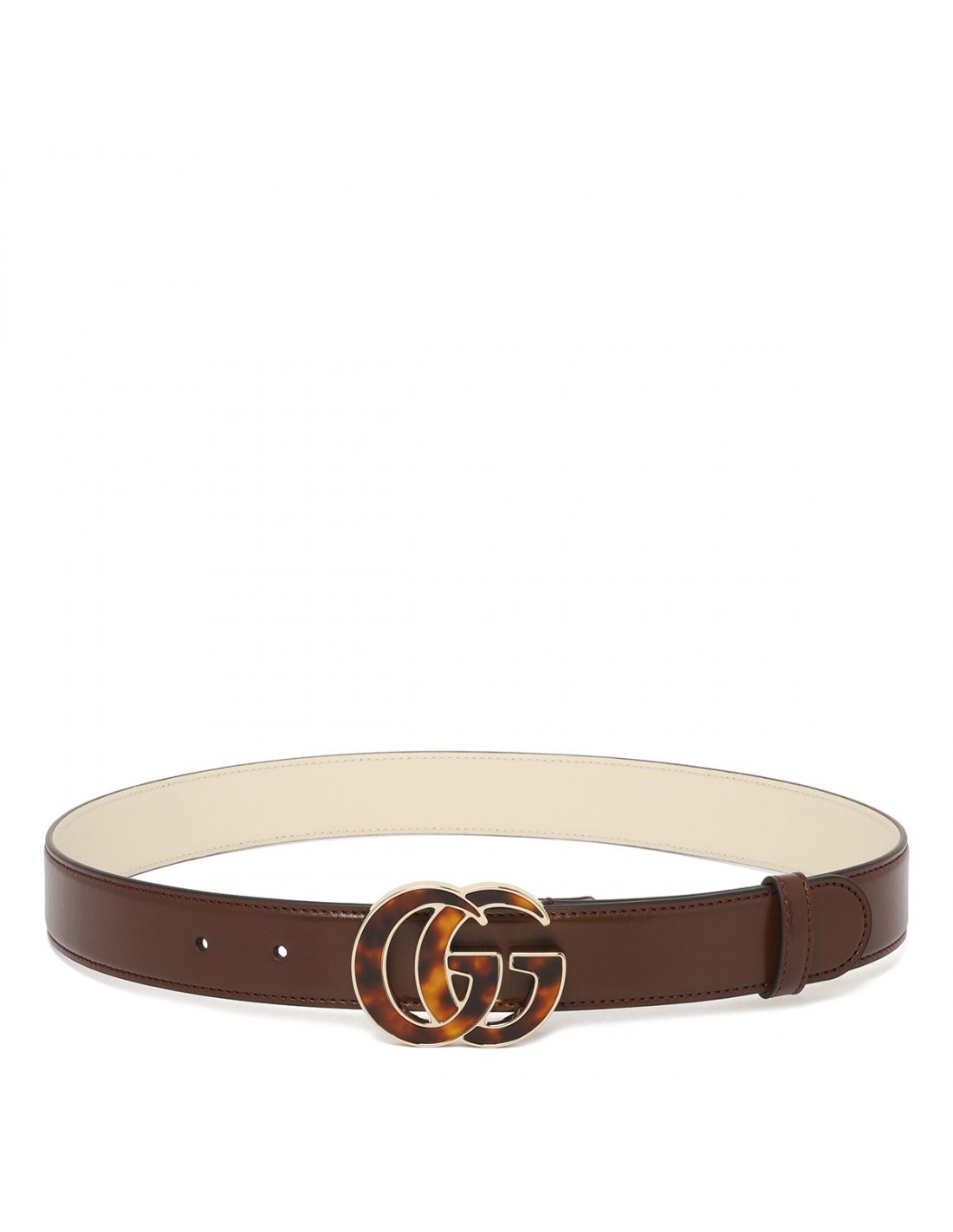 Brown leather GG Marmont belt from Gucci featuring tortoiseshell plexiglas GG buckle and hardware, ivory leather trim.