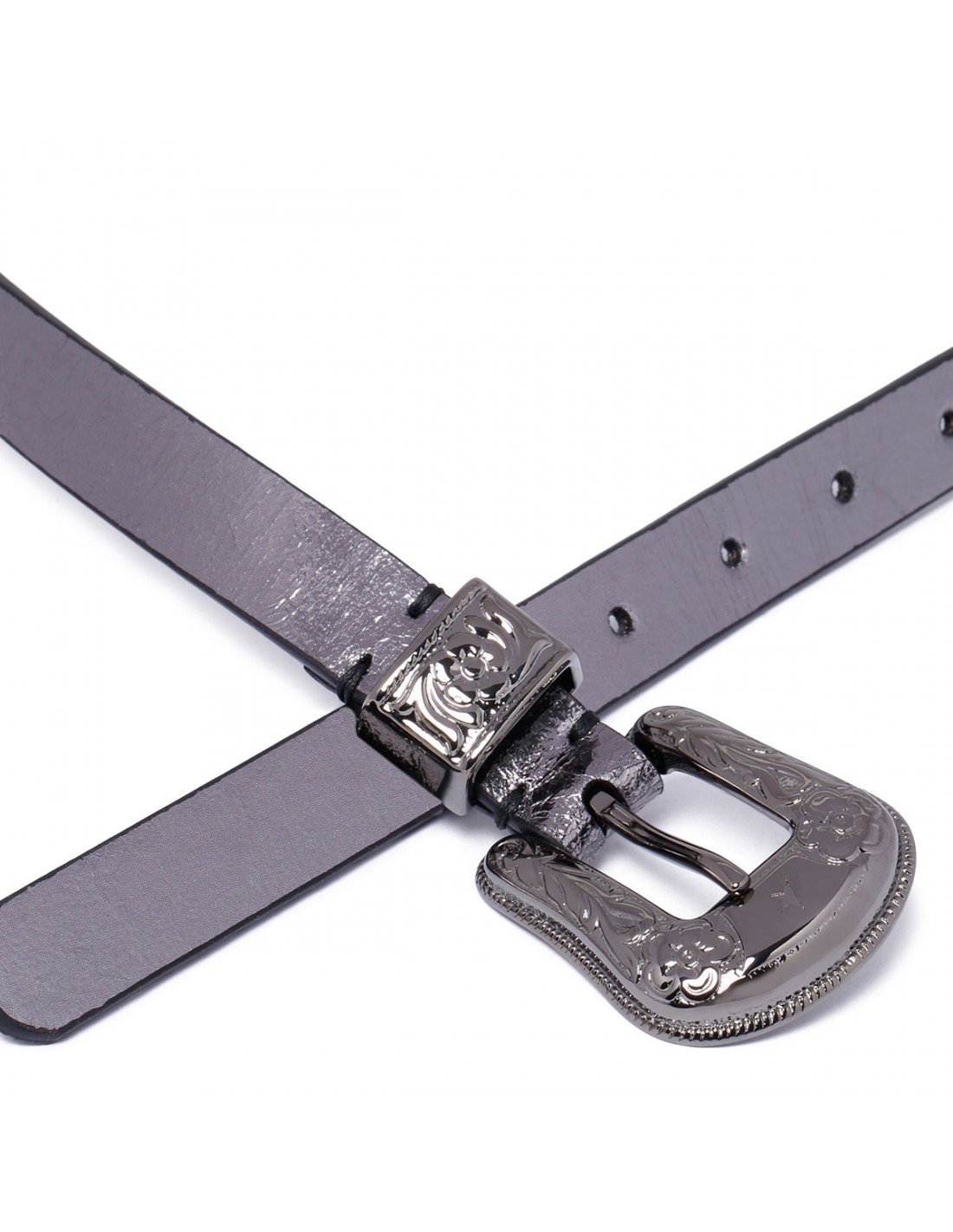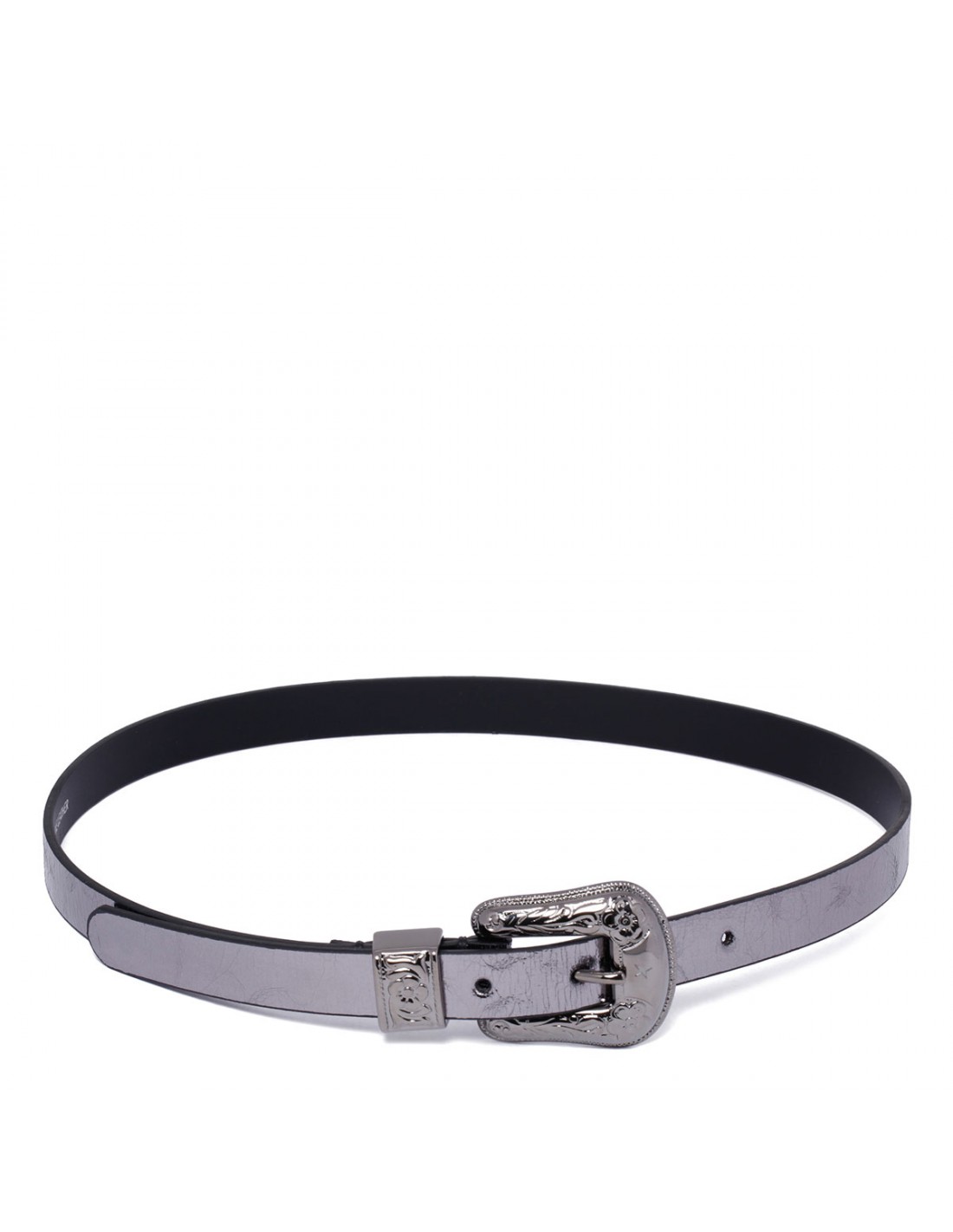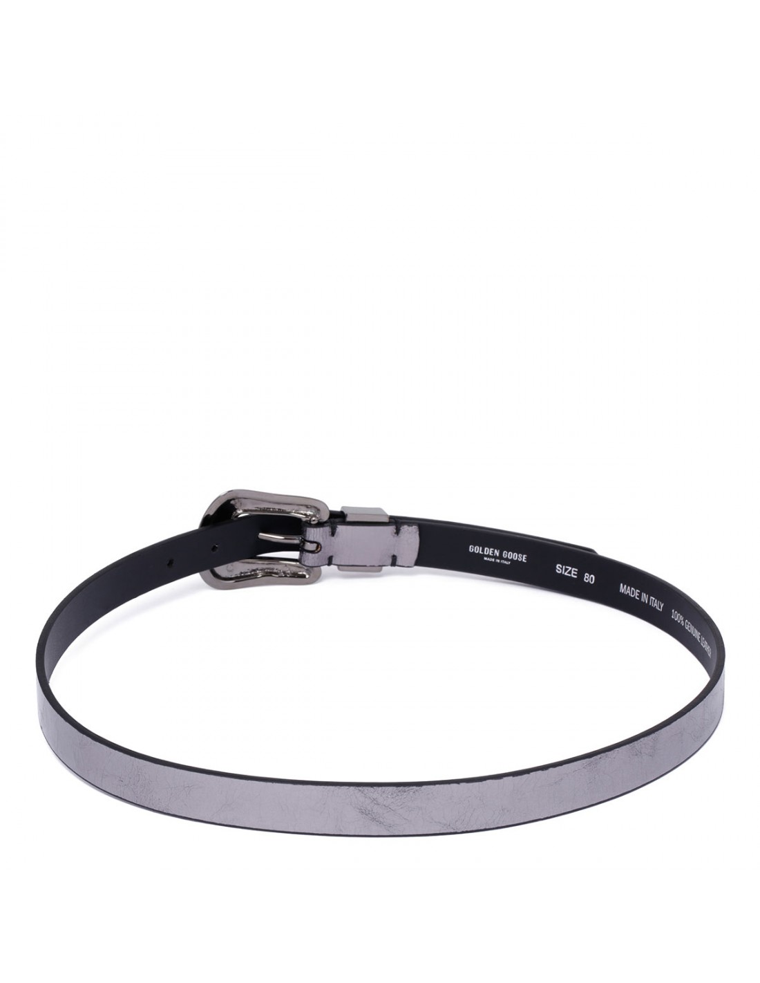 Silver metallic patent leather belt from Golden Goose featuring silver color decorated buckle fastening and loop.