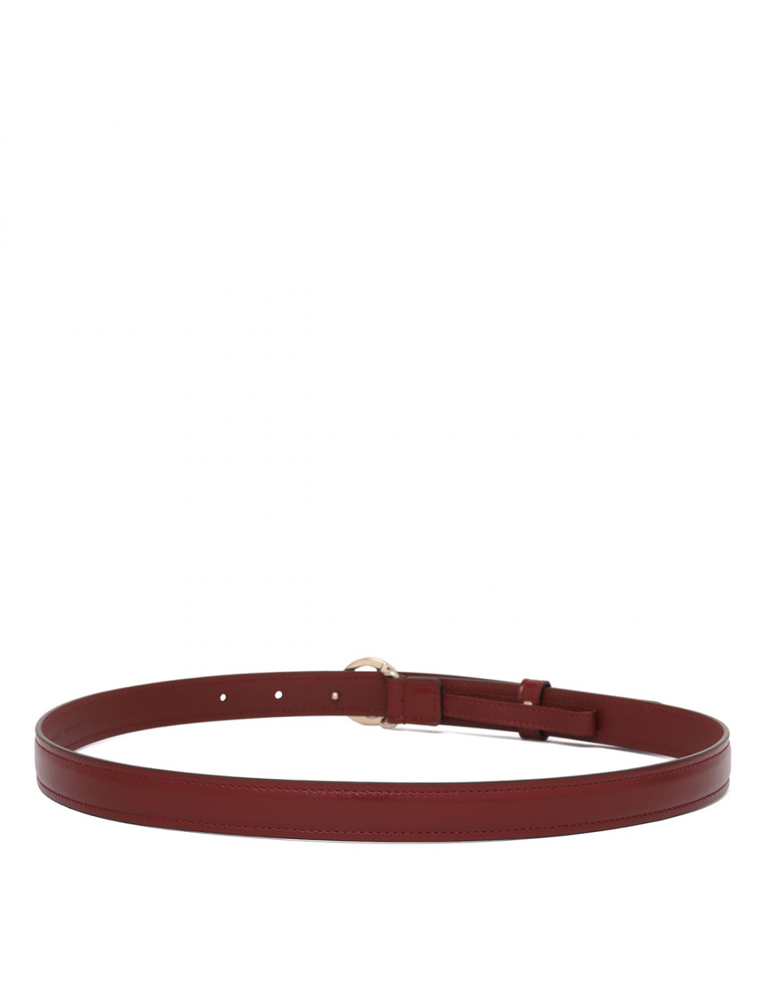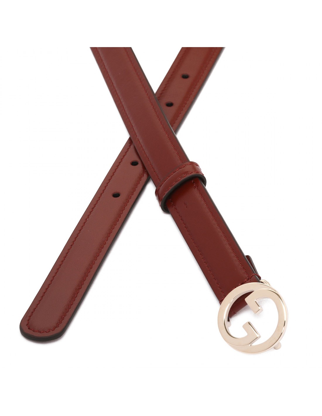 Brown leather Blondie thin belt from Gucci featuring light gold-toned round Interlocking G buckle closure and hardware, tonal leather loop.