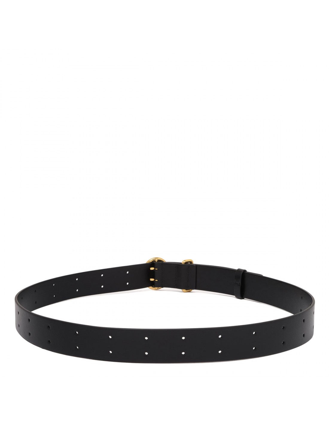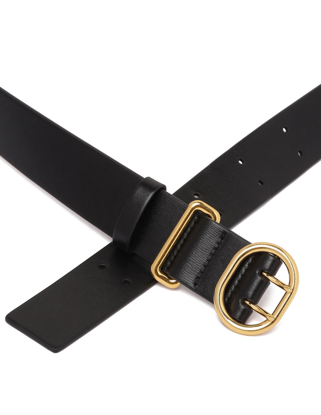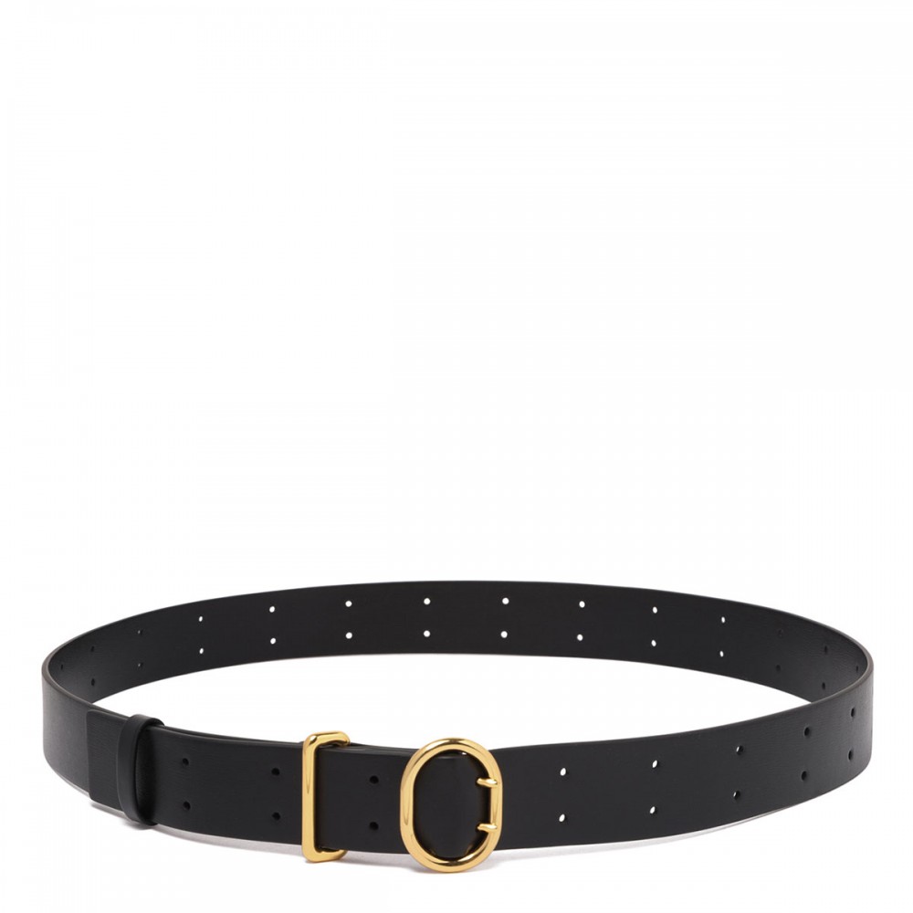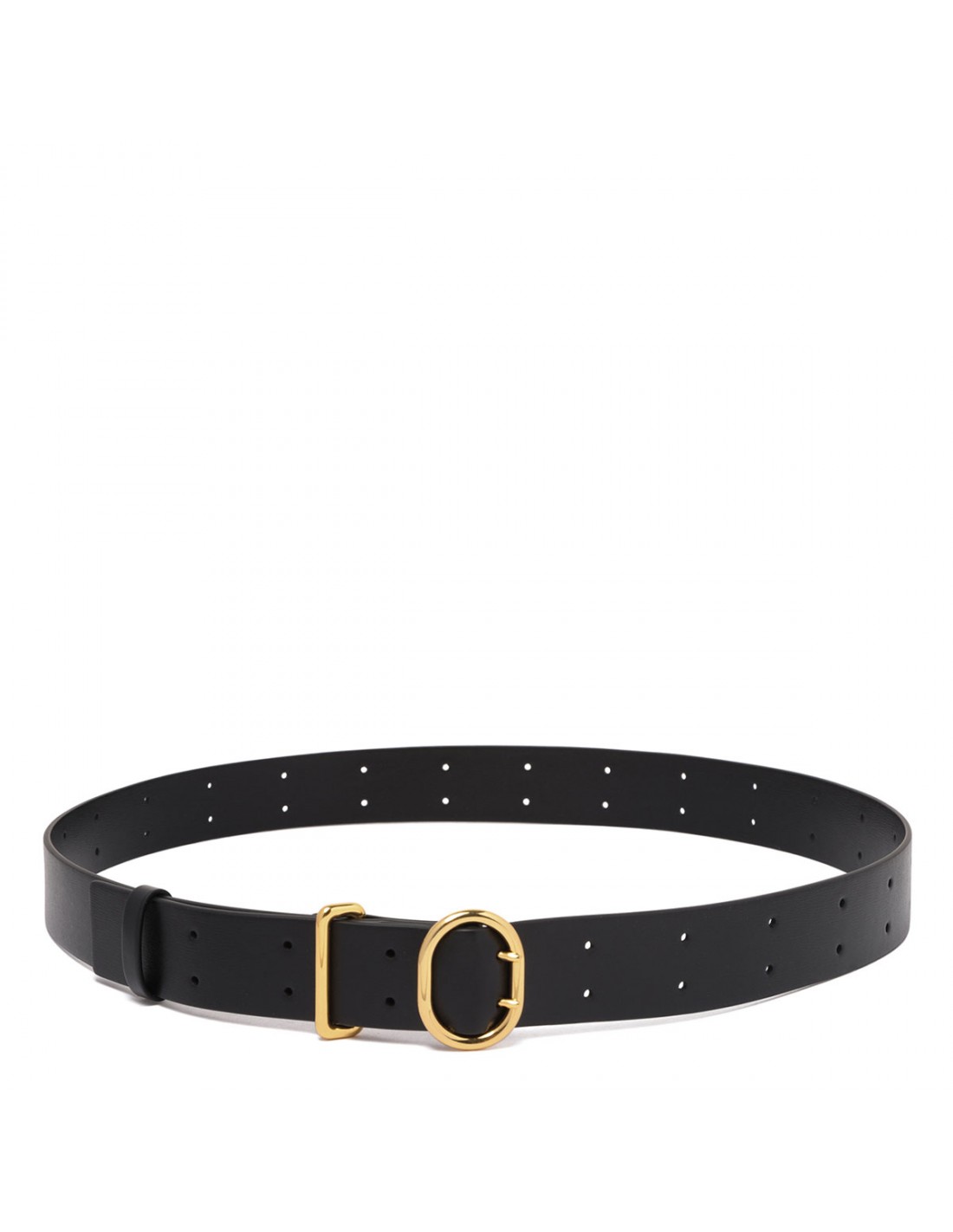 Black leather Cannolo belt from Jil Sander featuring gold-tone metal Cannolo buckle closure, gold-tone metal square loop, adjustable length.