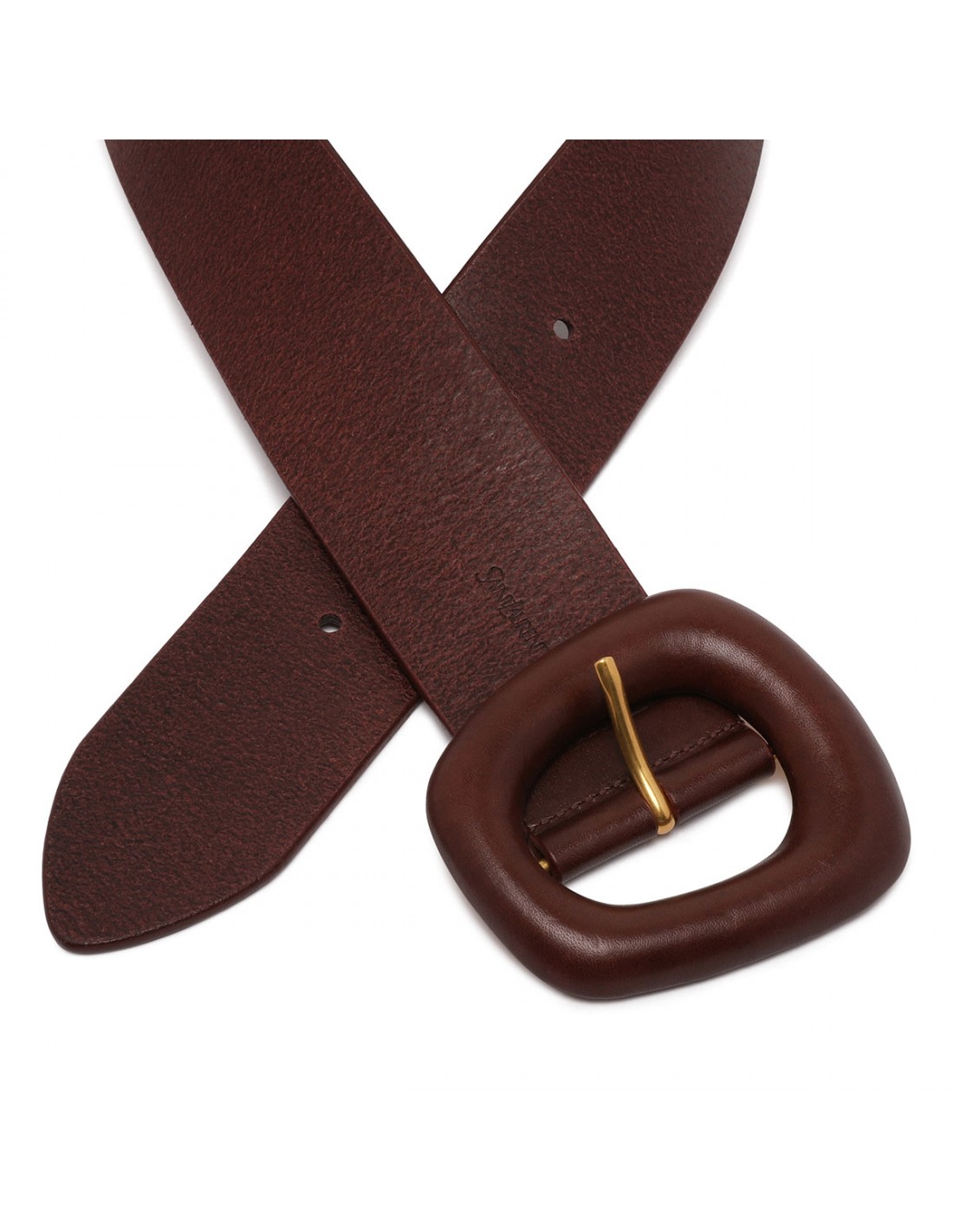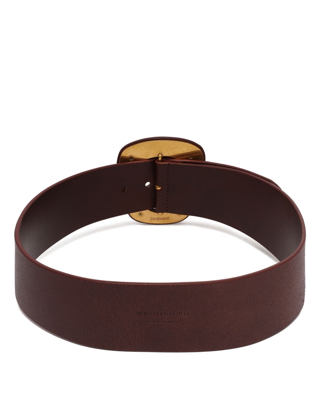 Prune hue leather belt from Saint Laurent featuring covered buckle with logo at the back, bronze-tone hardware, adjustable buckle closure.