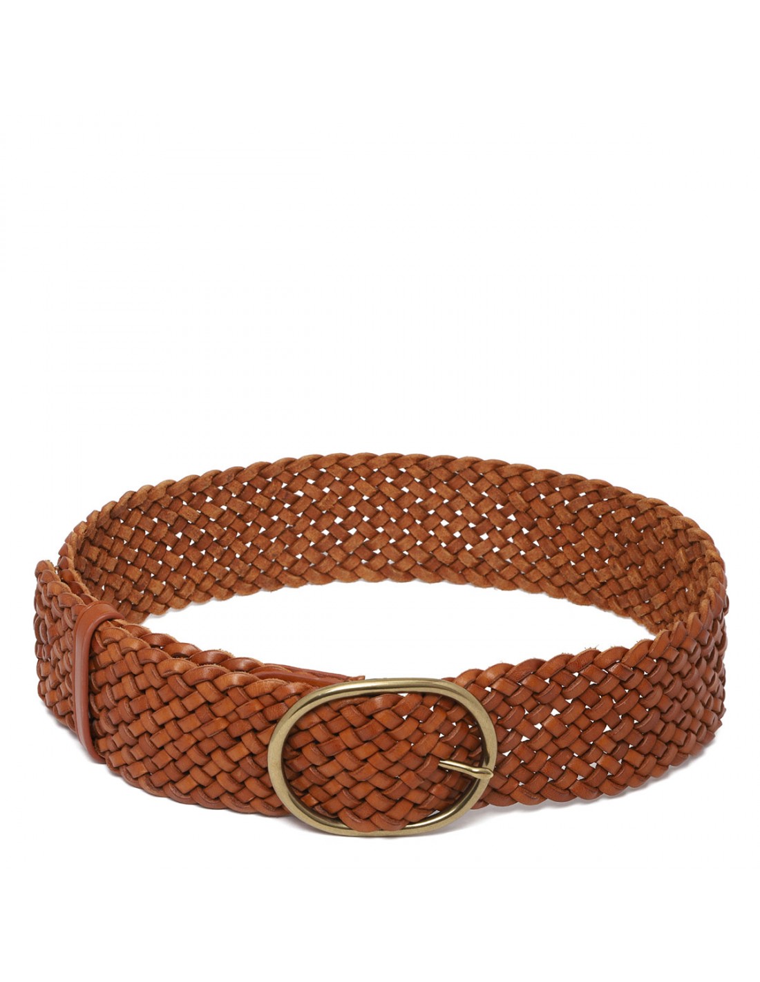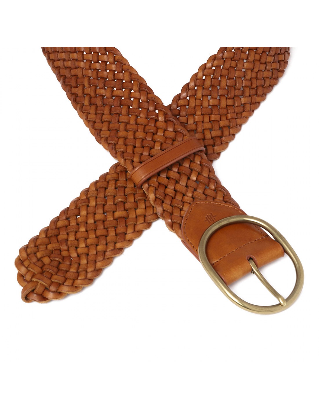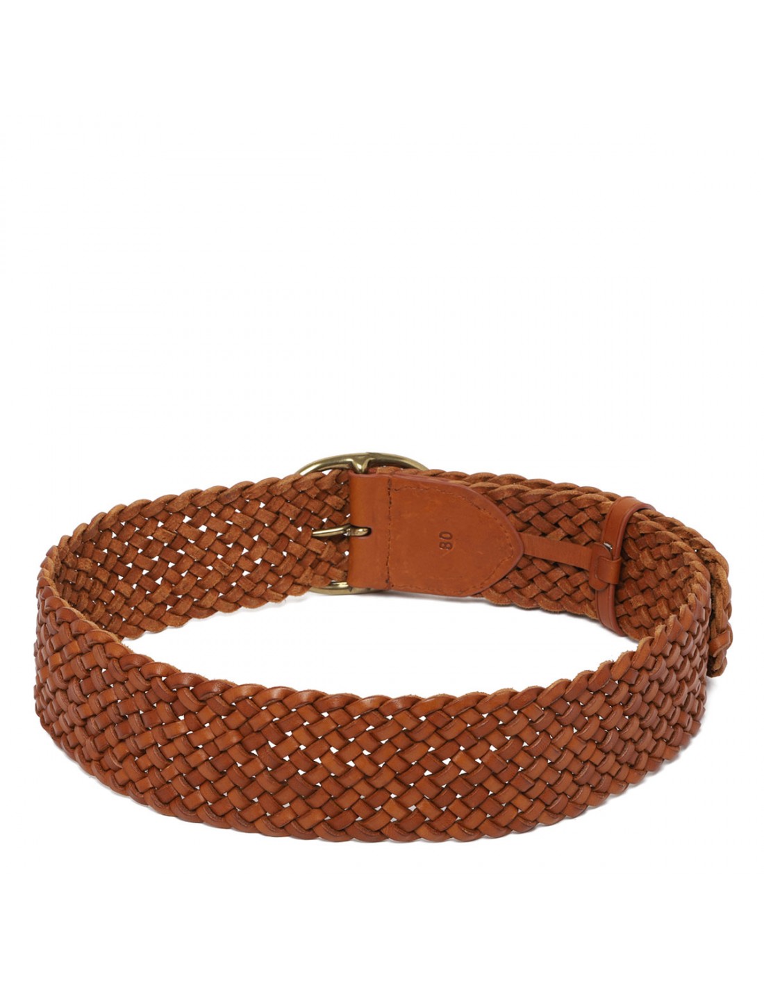Tan hue handwoven leather 16 Ply belt from Dragon Diffusion featuring gold-tone brass rounded buckle closure, leather loop.