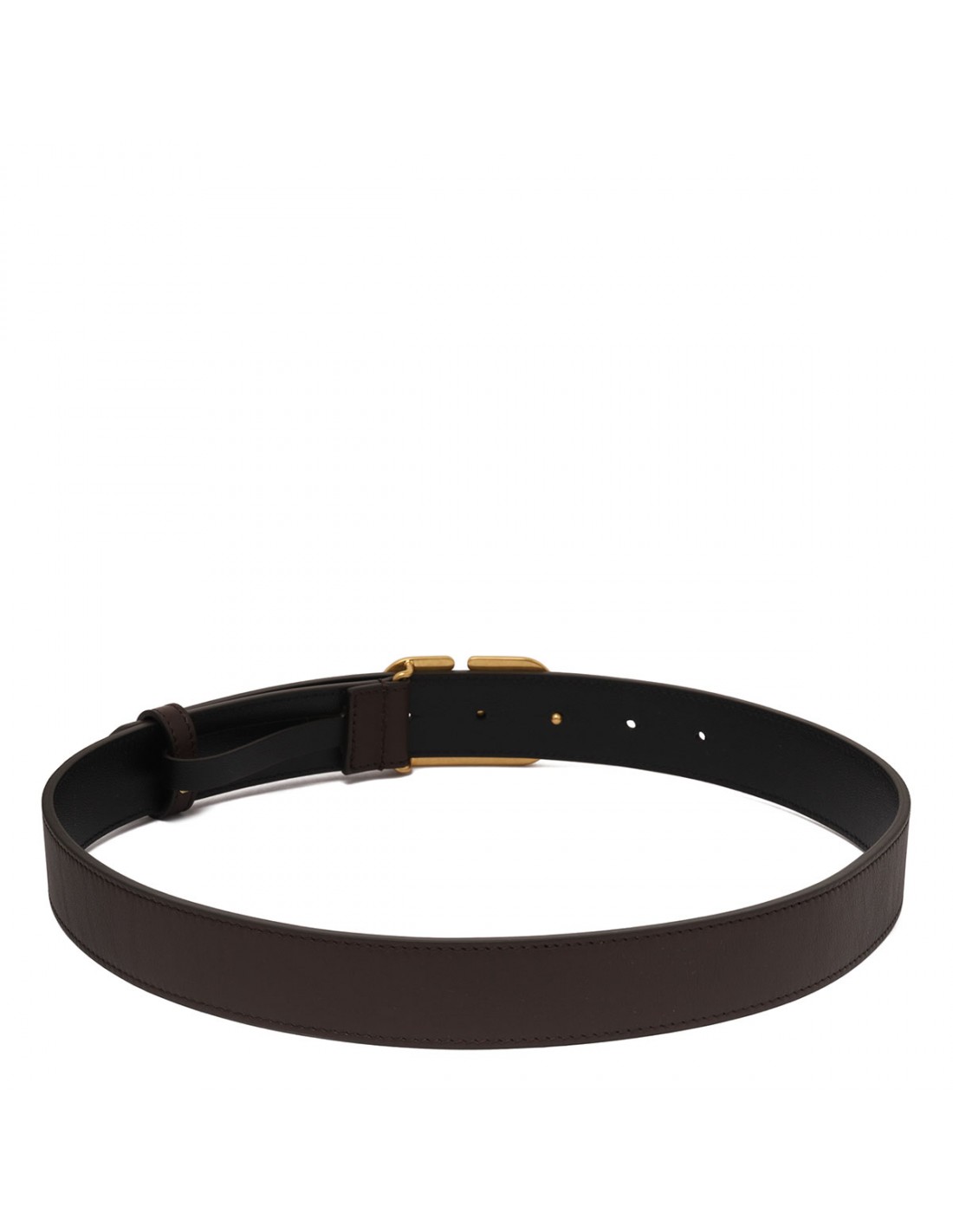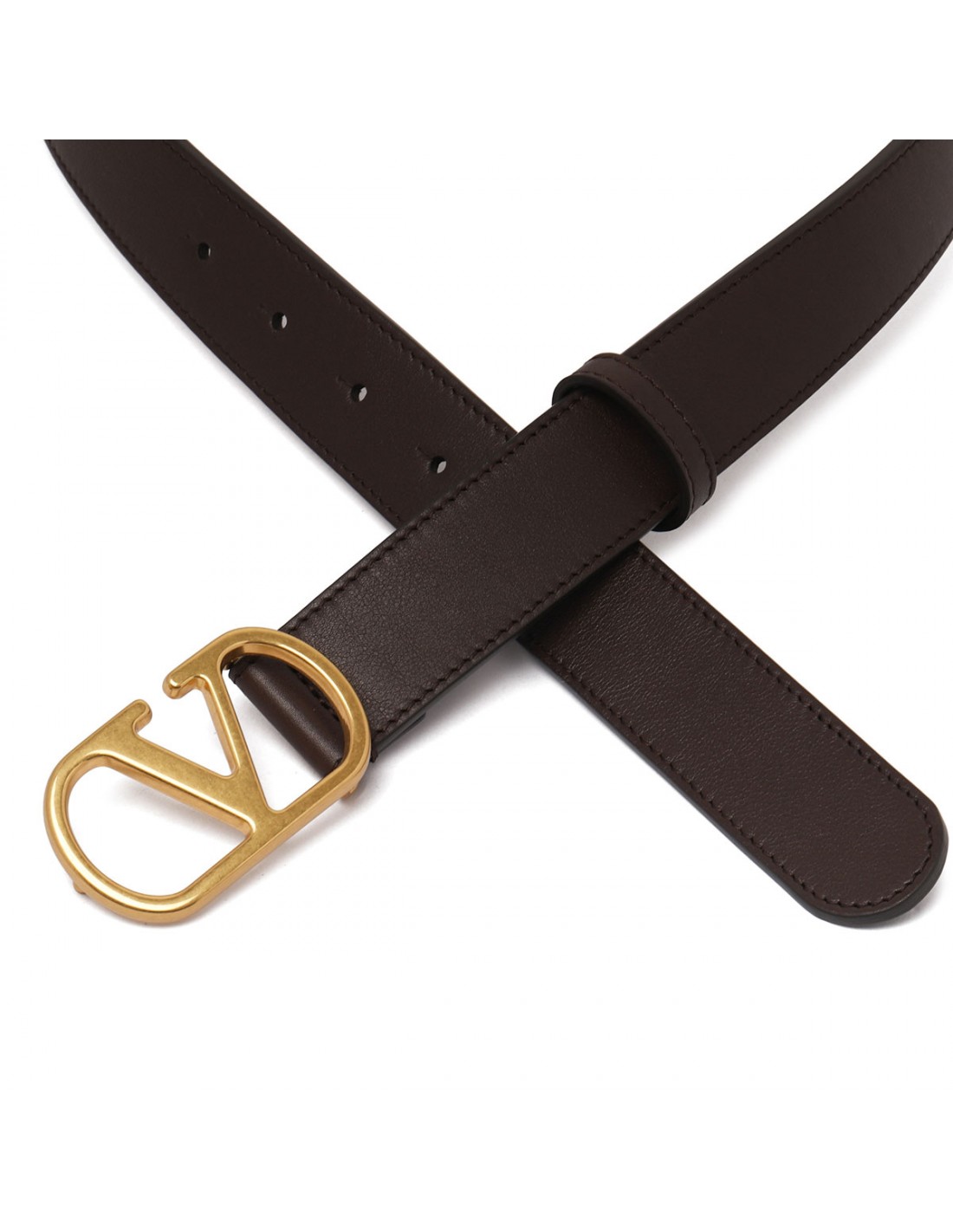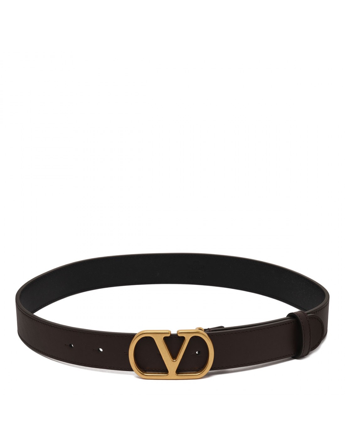 Oak brown calfskin belt from Valentino Garavani featuring VLogo buckle fastening in antique brass-finish metal, leather loop. It has a width of 30 mm.