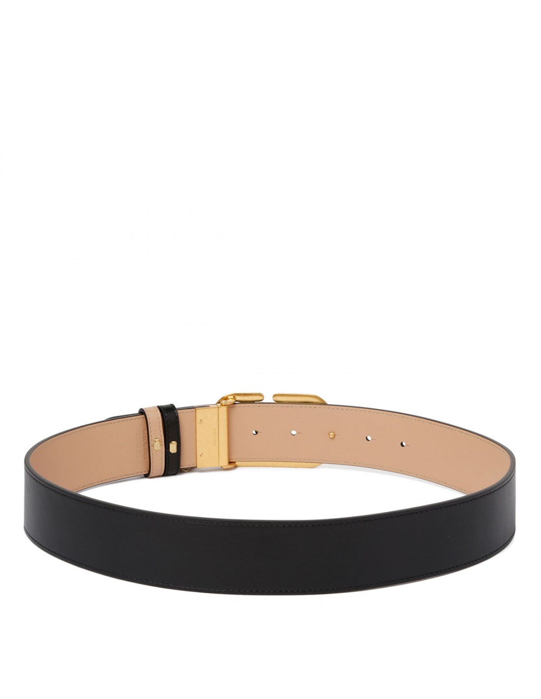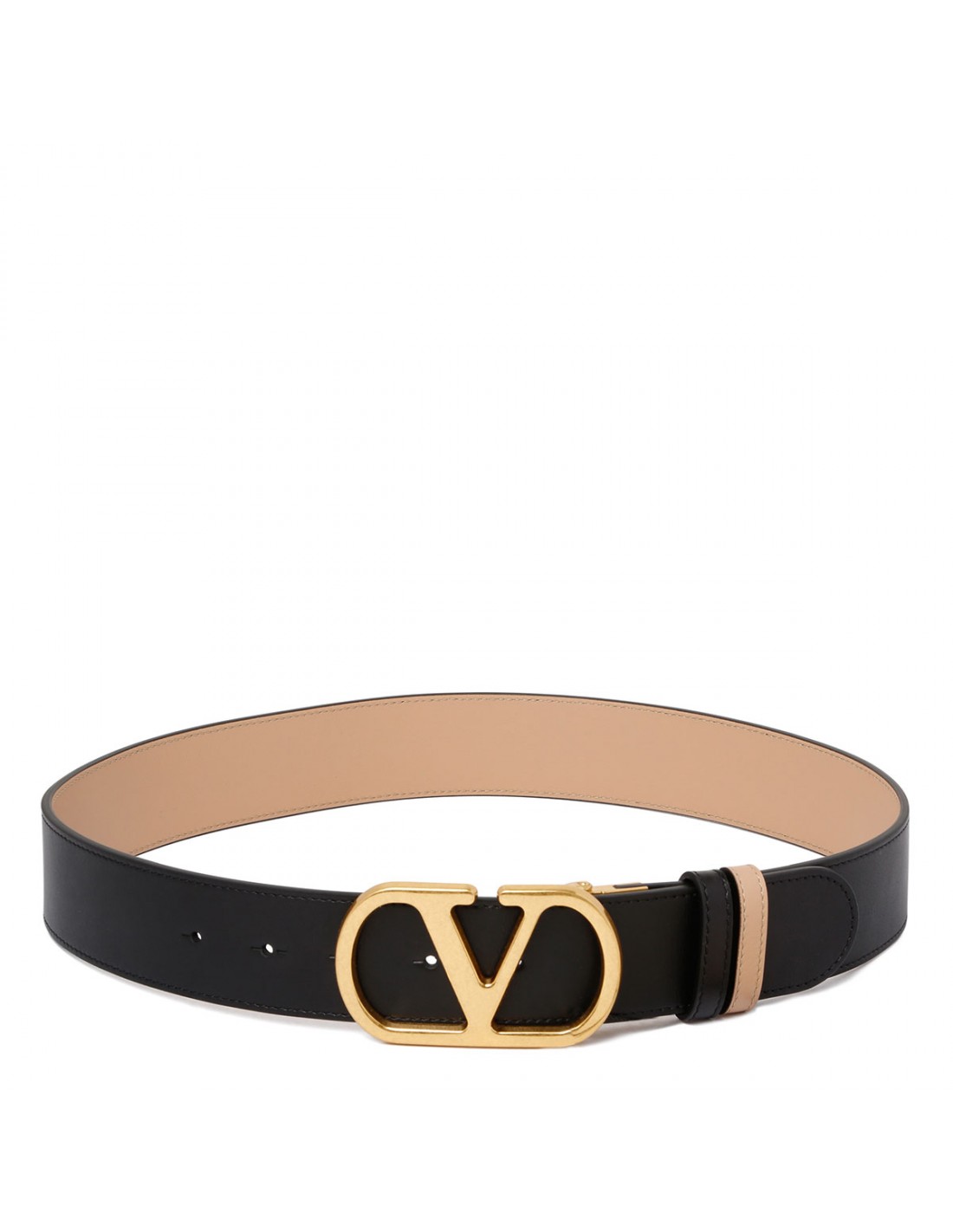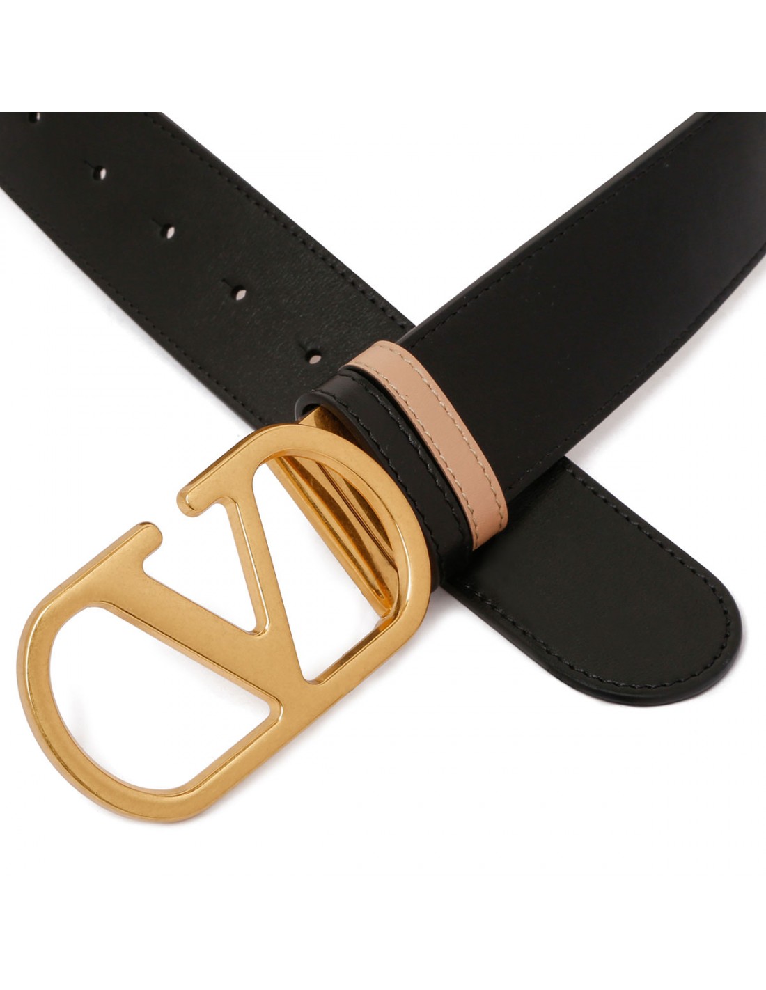 Black and rose sand leather calfskin from Valentino Garavani featuring antique brass finish Vlogo Signature buckle closure, double leather loop.