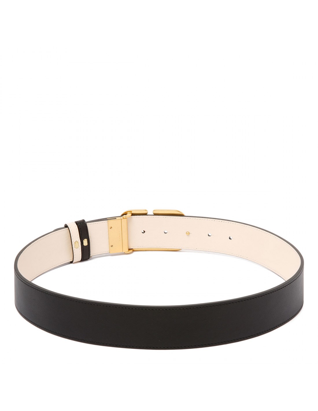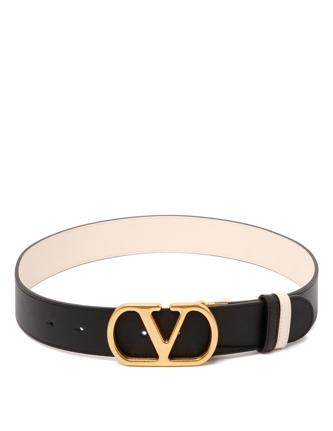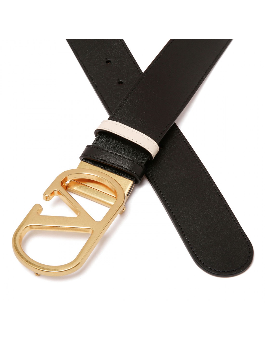 Black and butter white leather calfskin from Valentino Garavani featuring antique brass finish Vlogo Signature buckle closure, double leather loop. H. 40.
