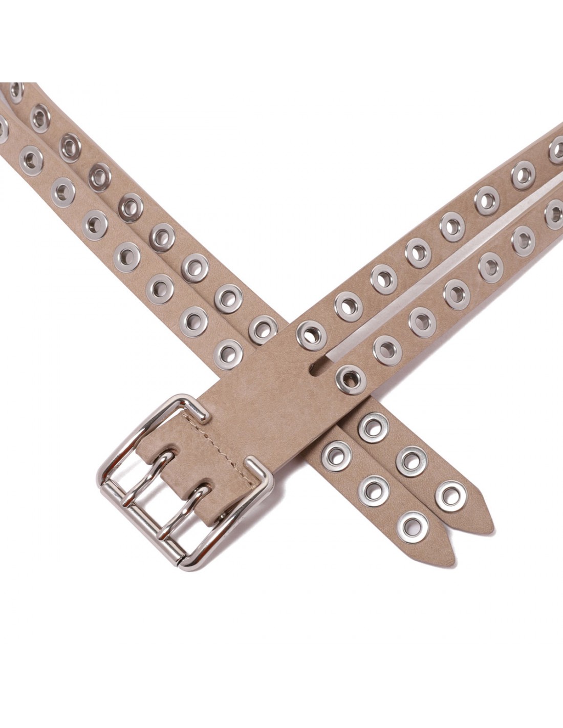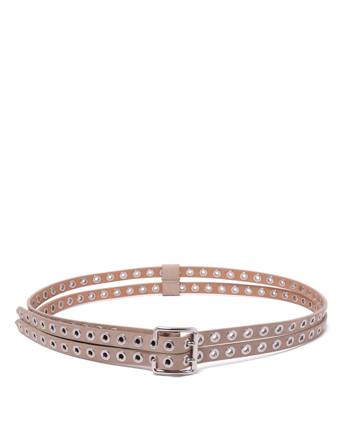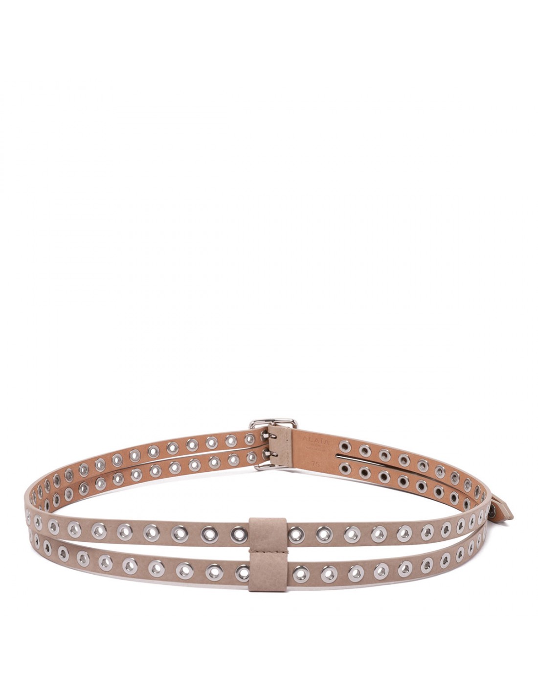 Greige hue nubuck leather Biker double belt from Alaia featuring double tongue buckle fastening, all-over silver metal eyelets.