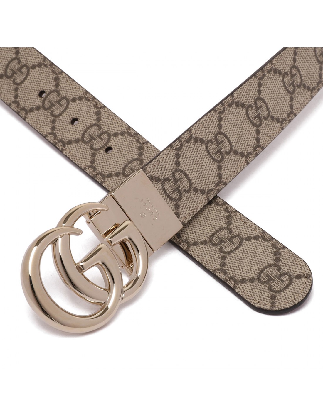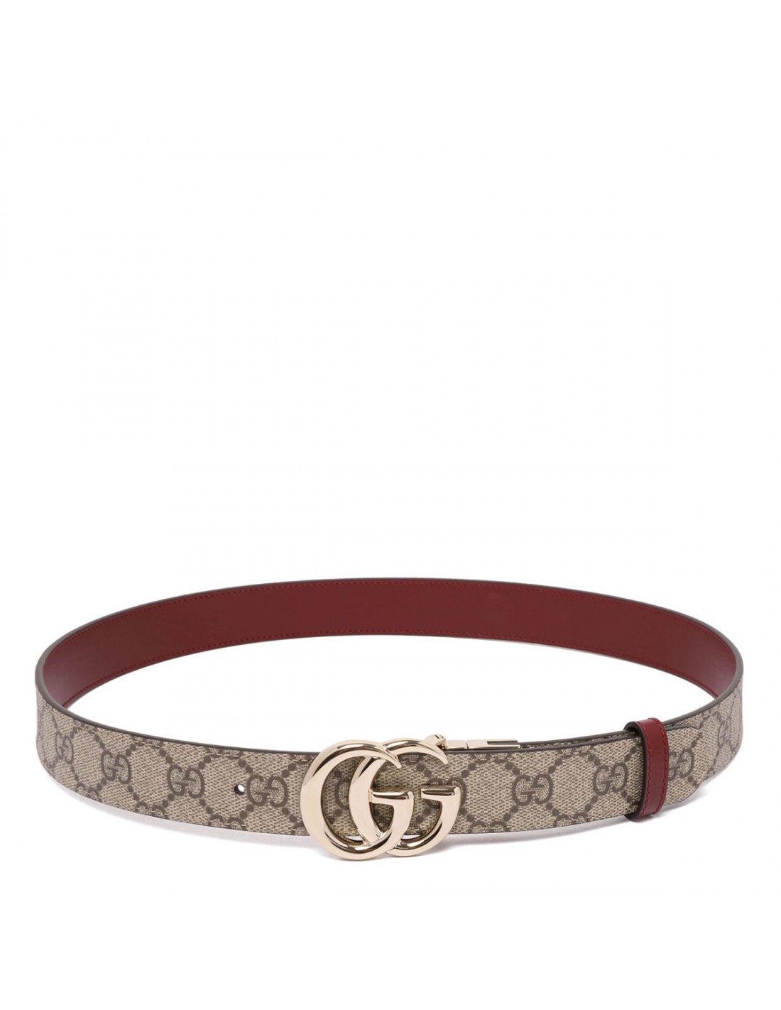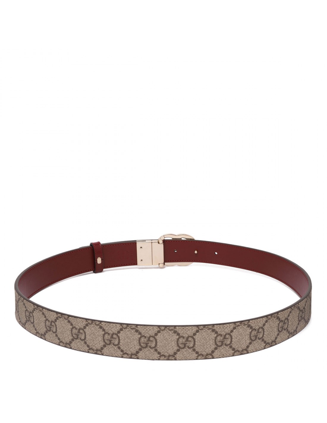 Reversible belt from Gucci featuring beige and dark brown GG Supreme on one side, Gucci Rosso Ancora leather on other side, light gold-toned double G buckle and hardware.