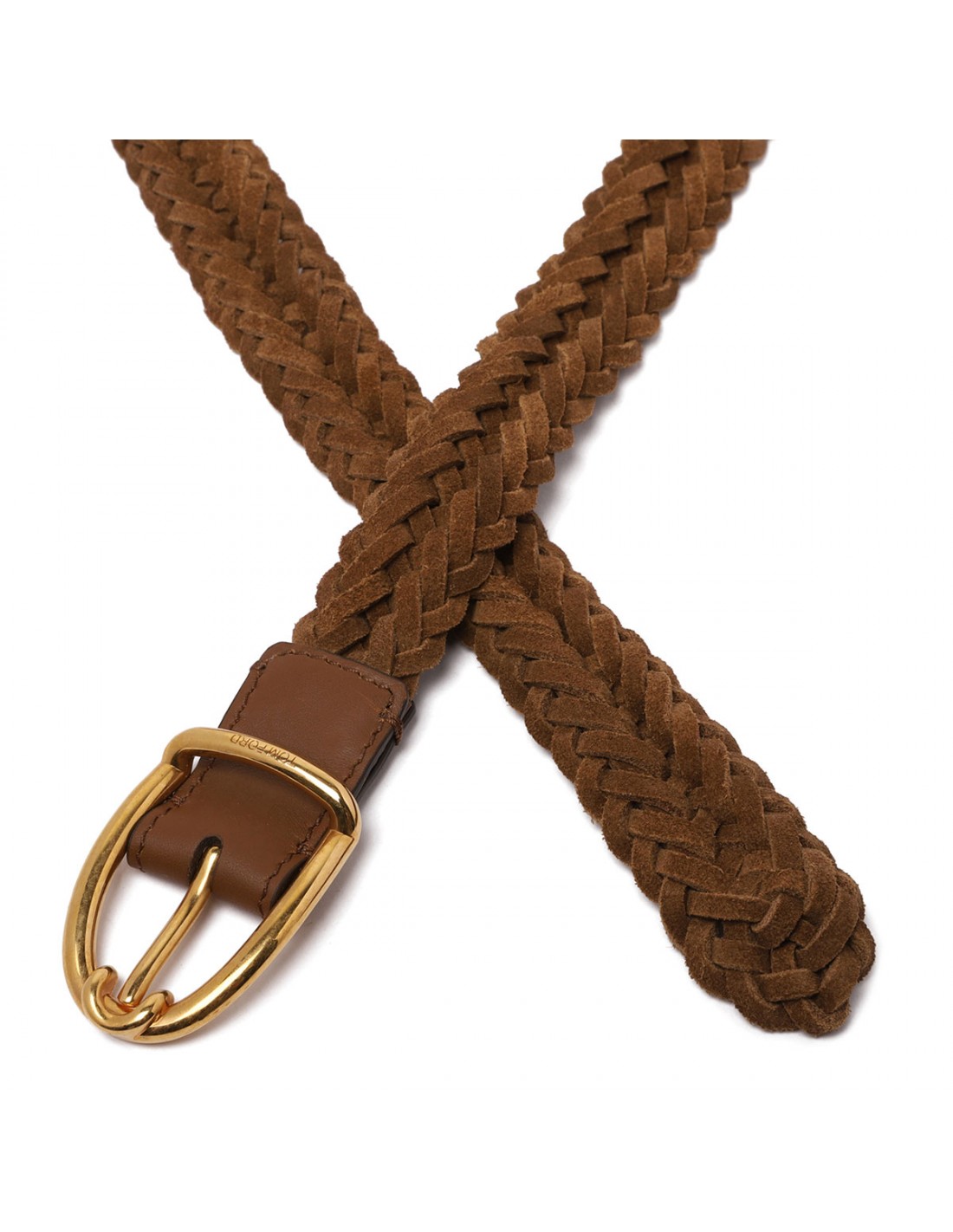Whisky hue woven suede belt from Tom Ford featuring angled buckle fastening with logo engraved, brass hardware. MM 30.