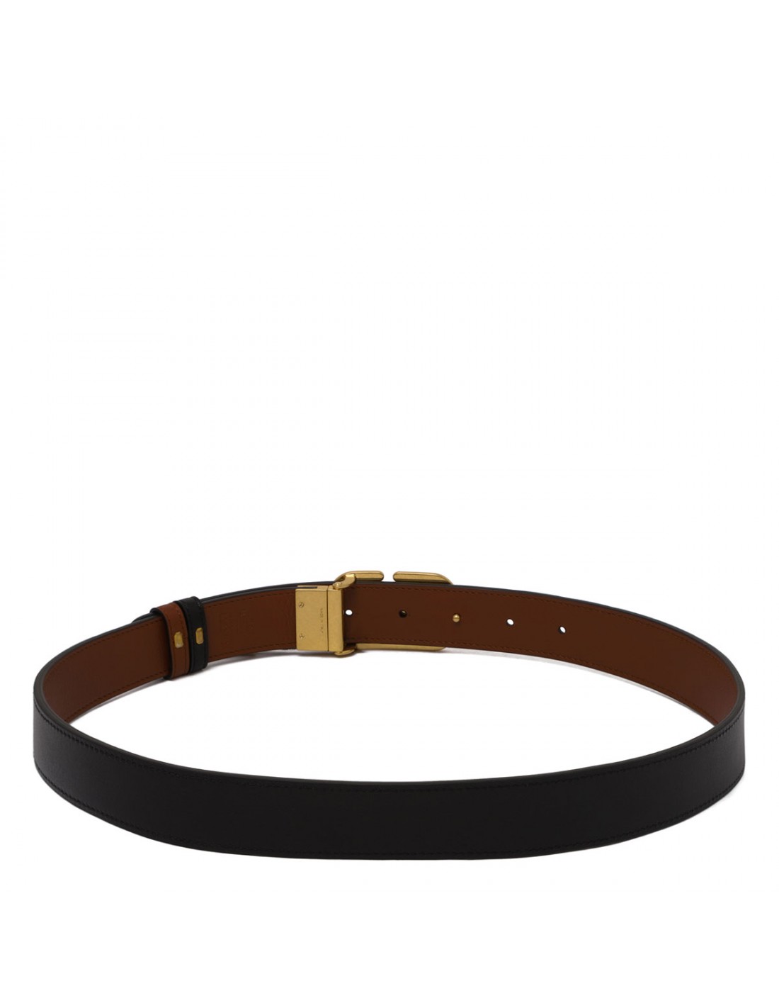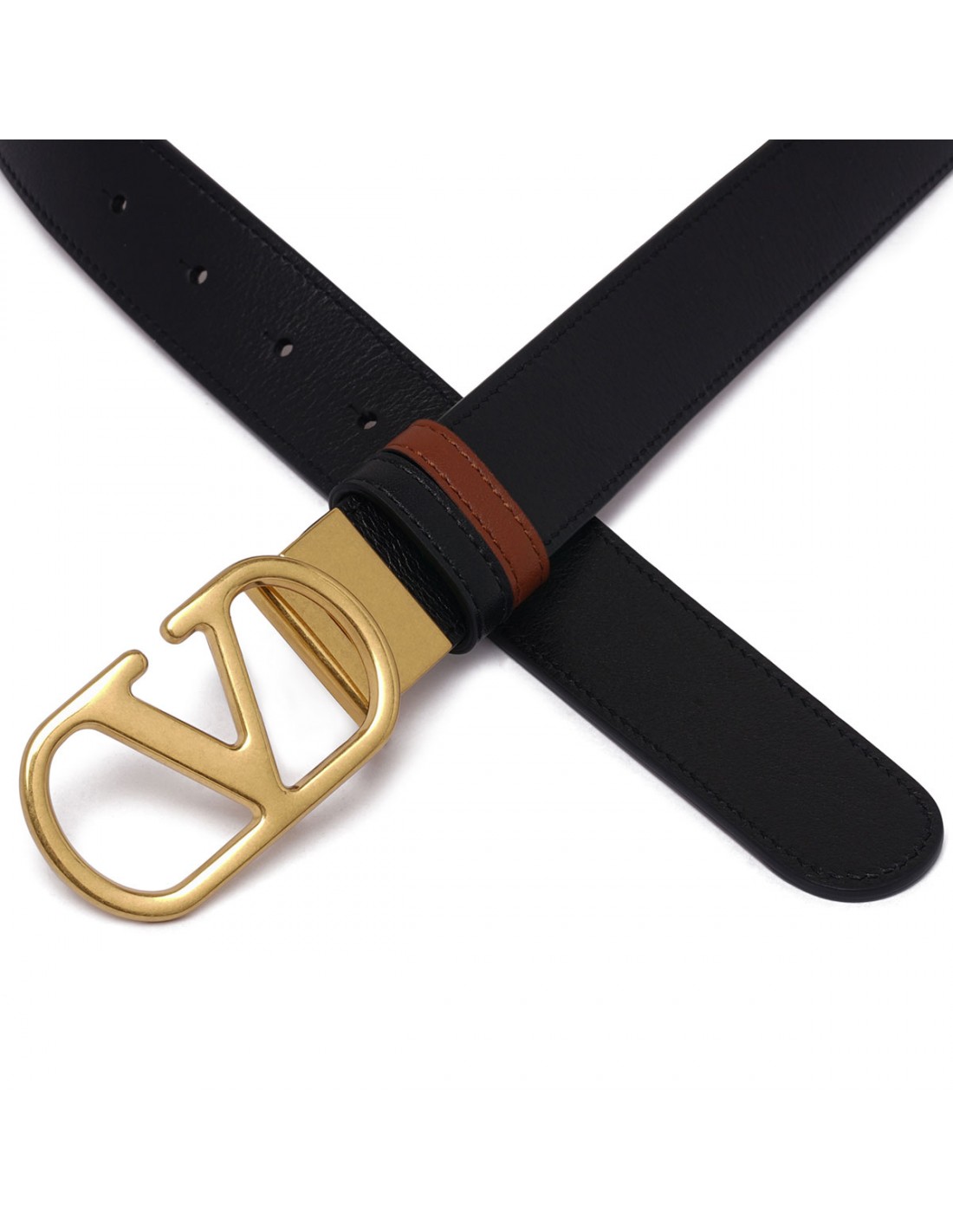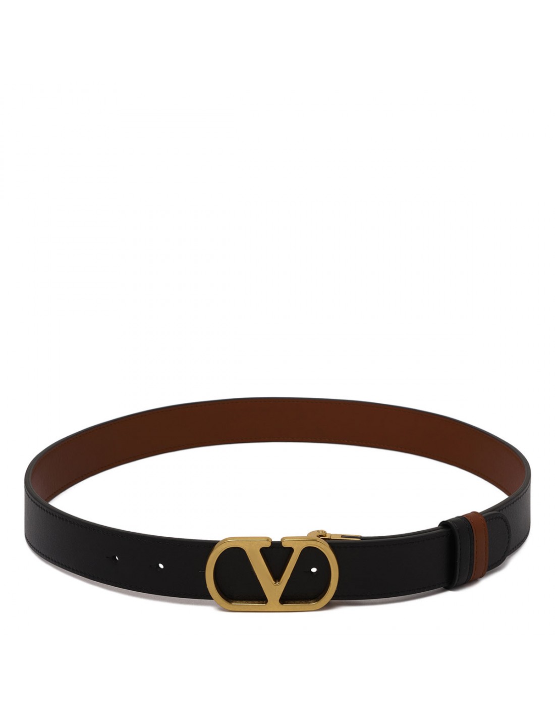 Black and deep caramel leather calfskin belt from Valentino Garavani featuring antique brass finish Vlogo Signature buckle closure, double leather loop. H.30.