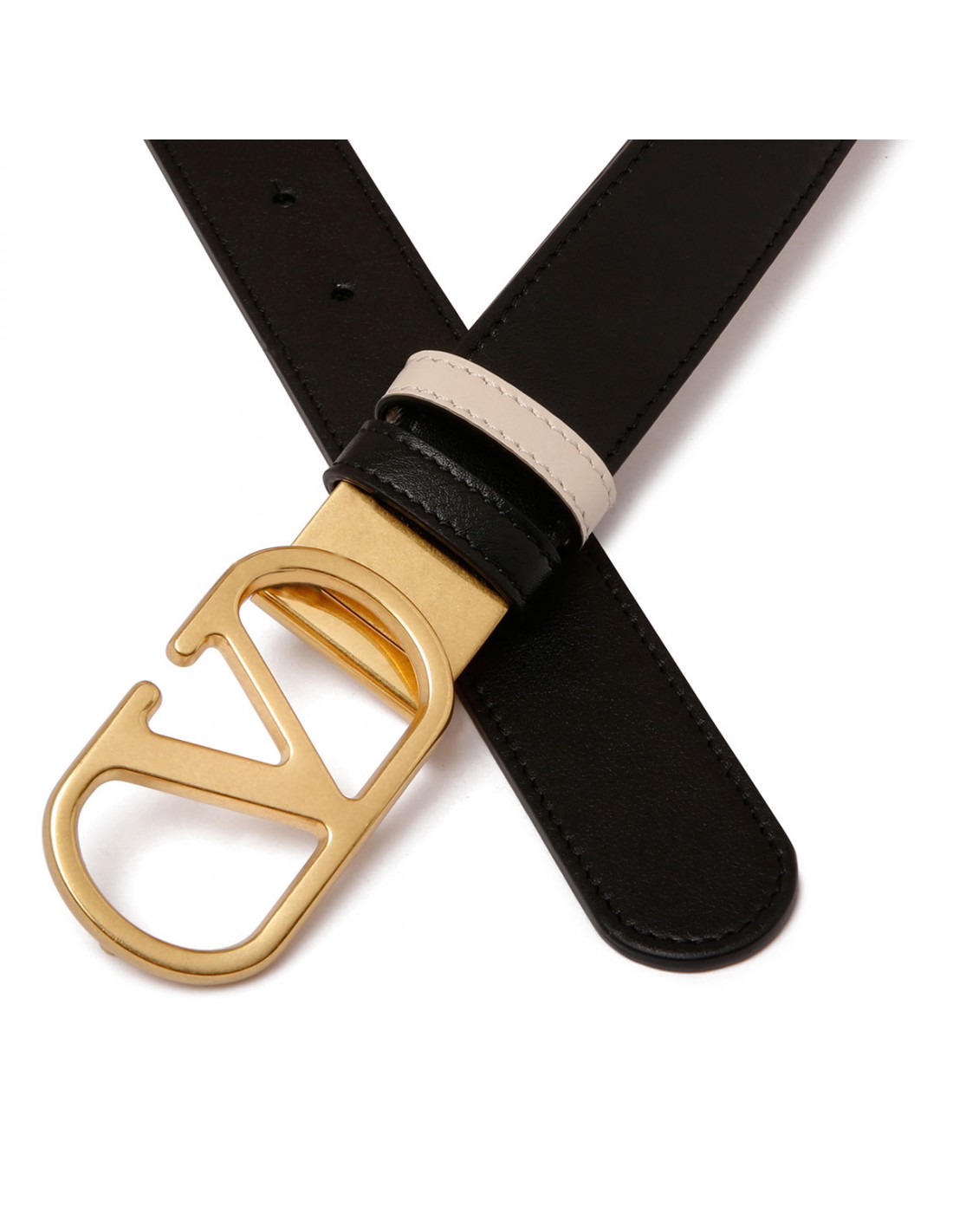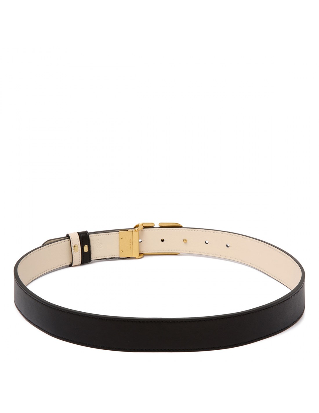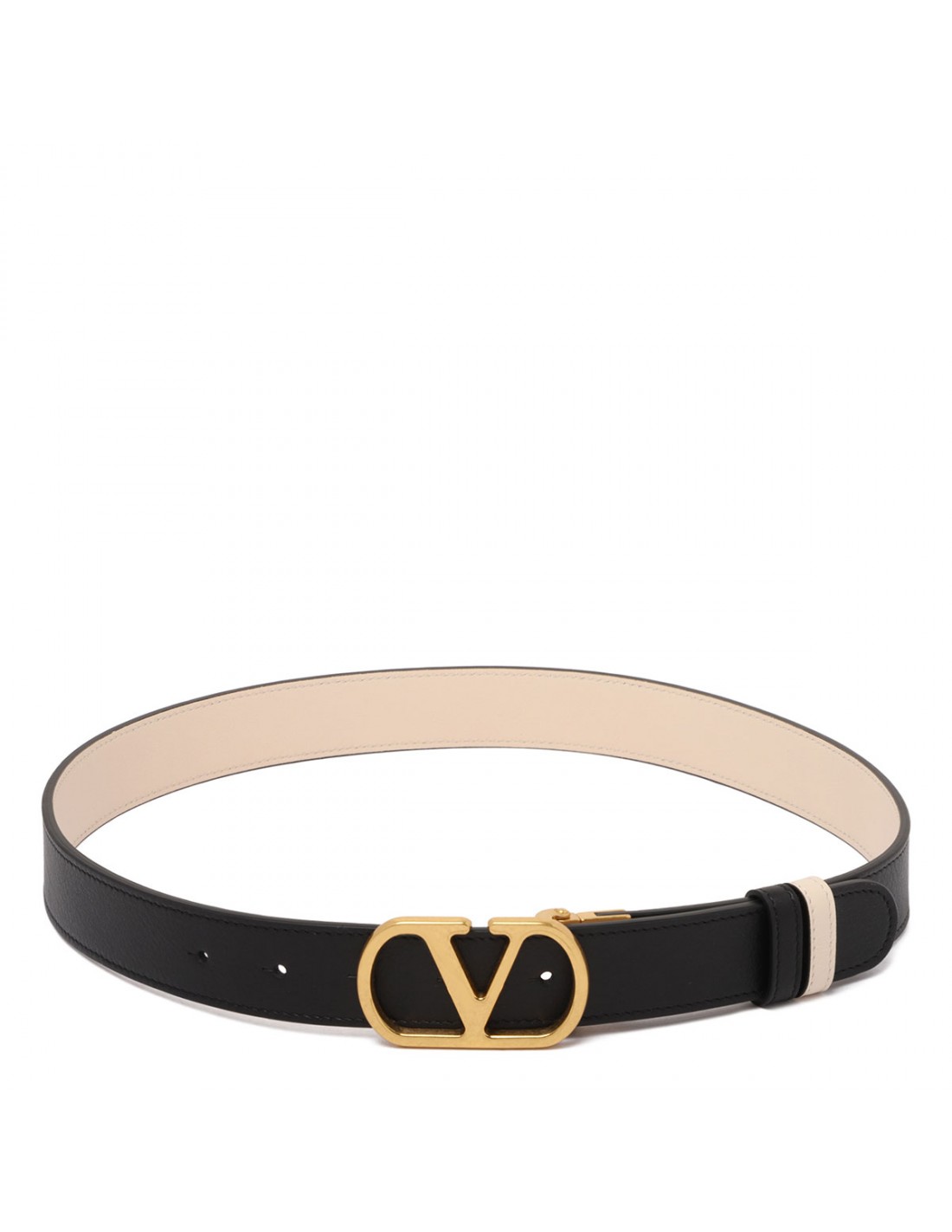 Black and butter white hue leather calfskin belt from Valentino Garavani featuring antique brass finish Vlogo Signature buckle closure, double leather loop. H.30.