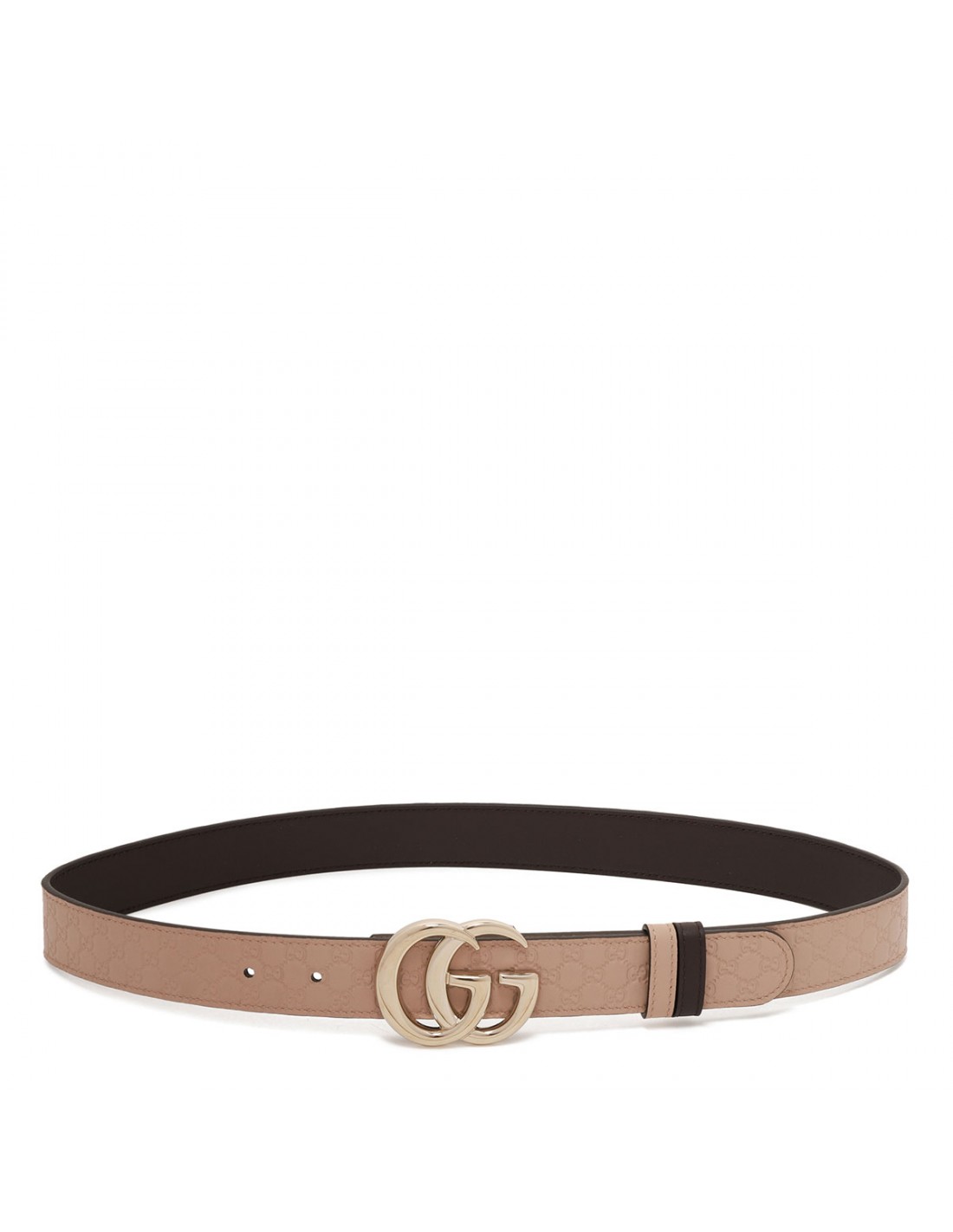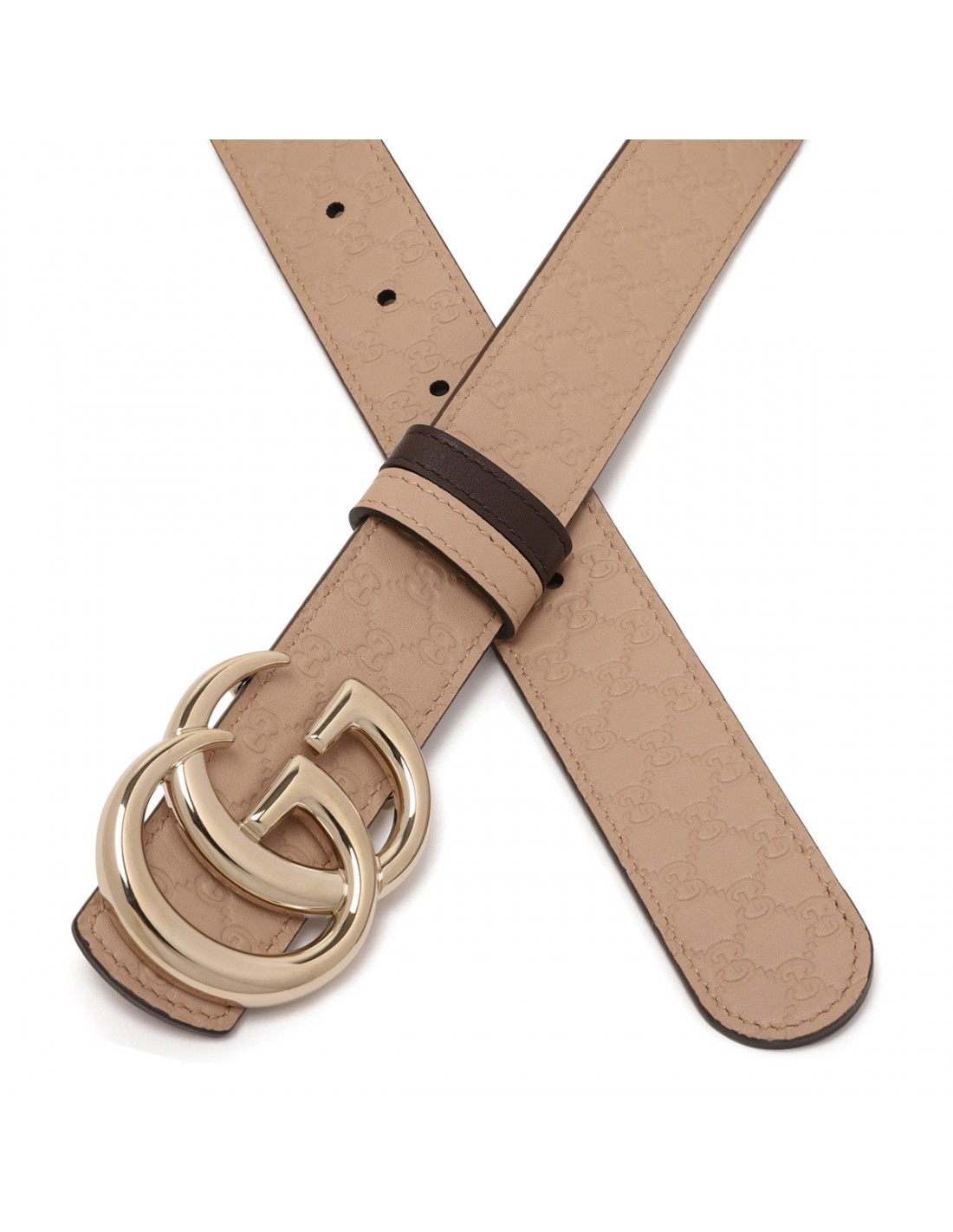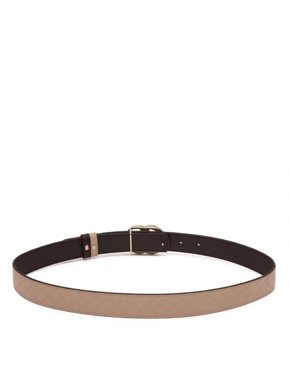 Reversible belt from Gucci featuring cameo-hue embossed GG smooth leather on one side, chocolate lambskin leather on the other side, light gold-toned double G buckle fastening.