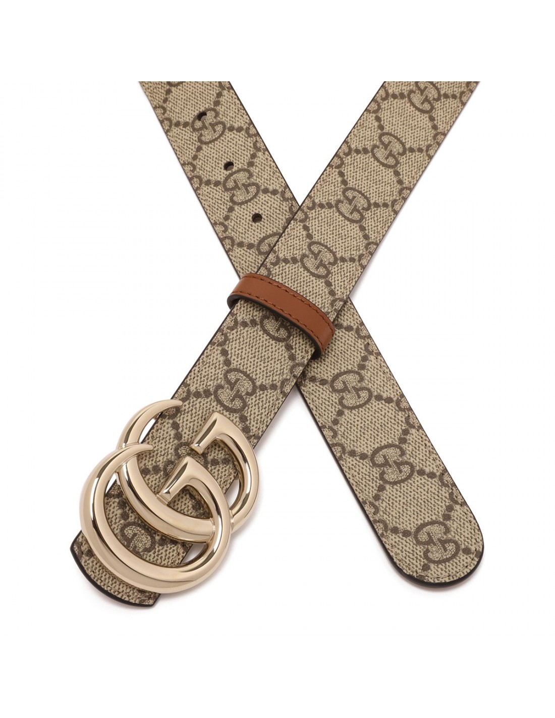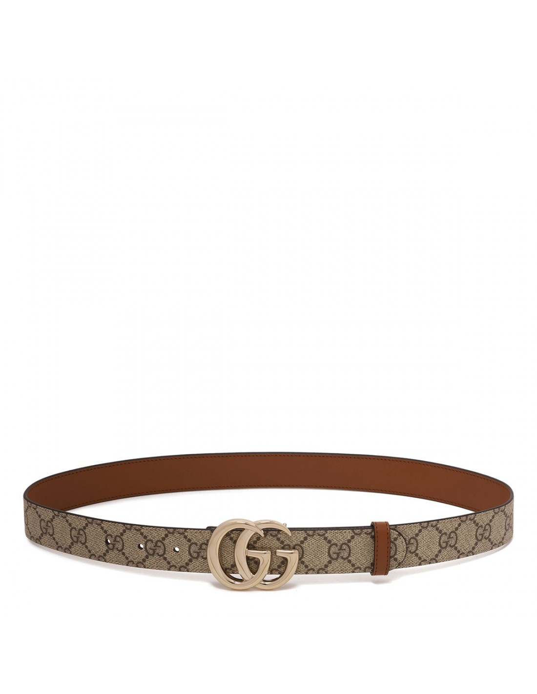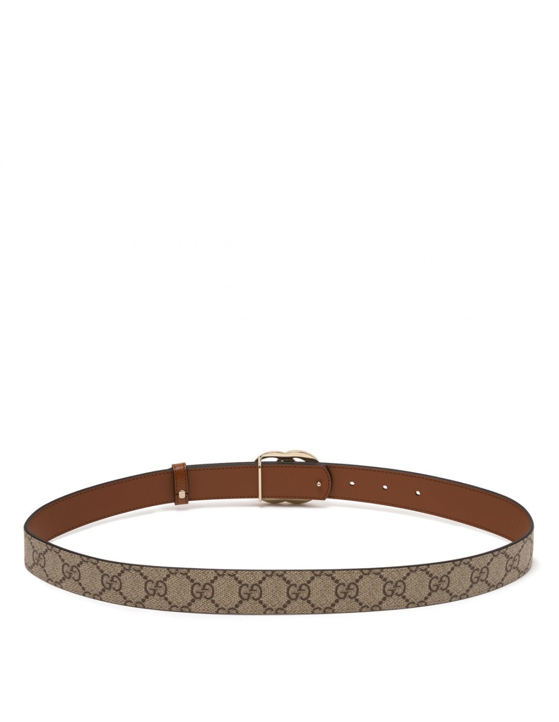 Reversible belt from Gucci featuring beige and dark brown GG Supreme on one side, light brown leather on the other, light gold-toned double G buckle fastening.