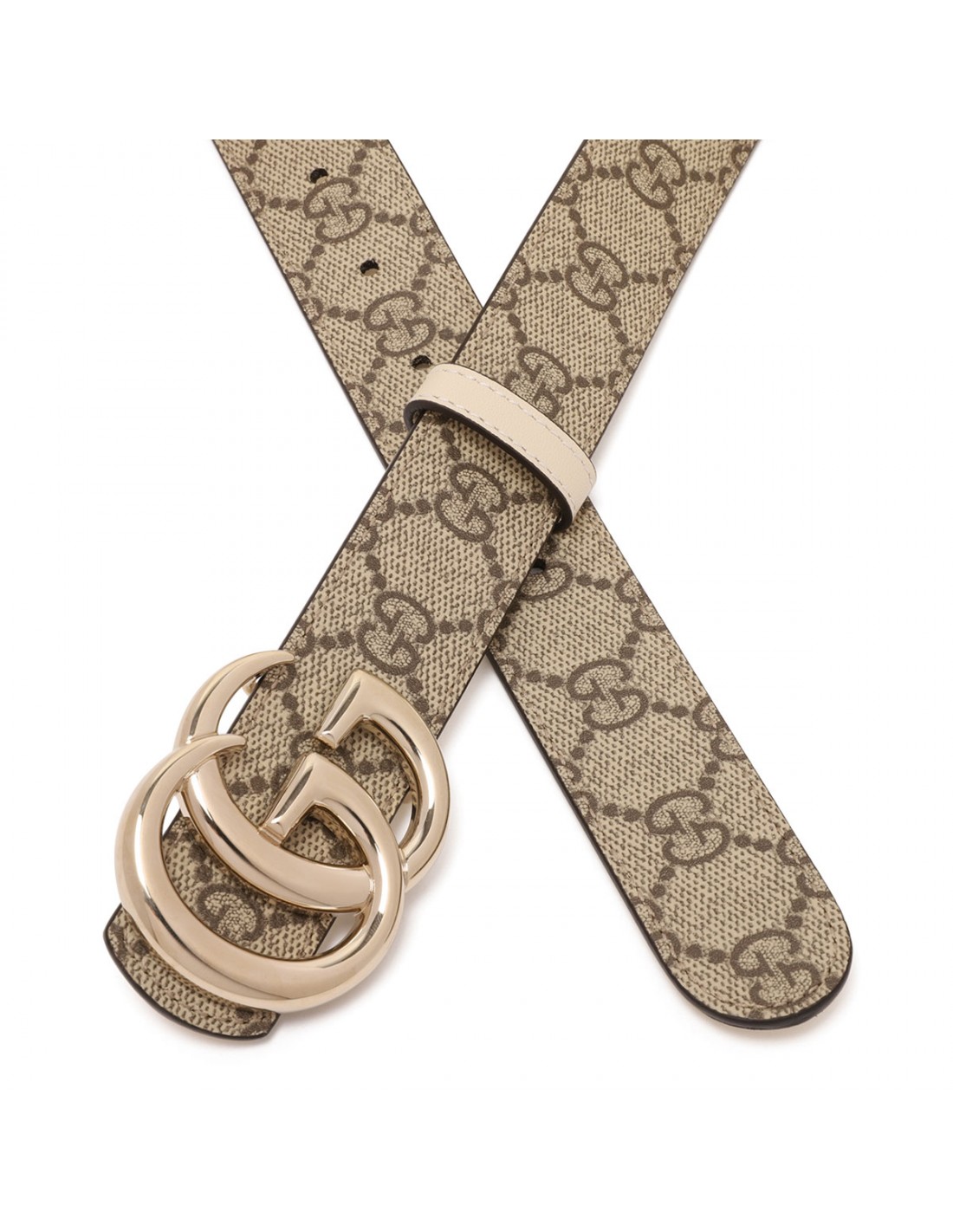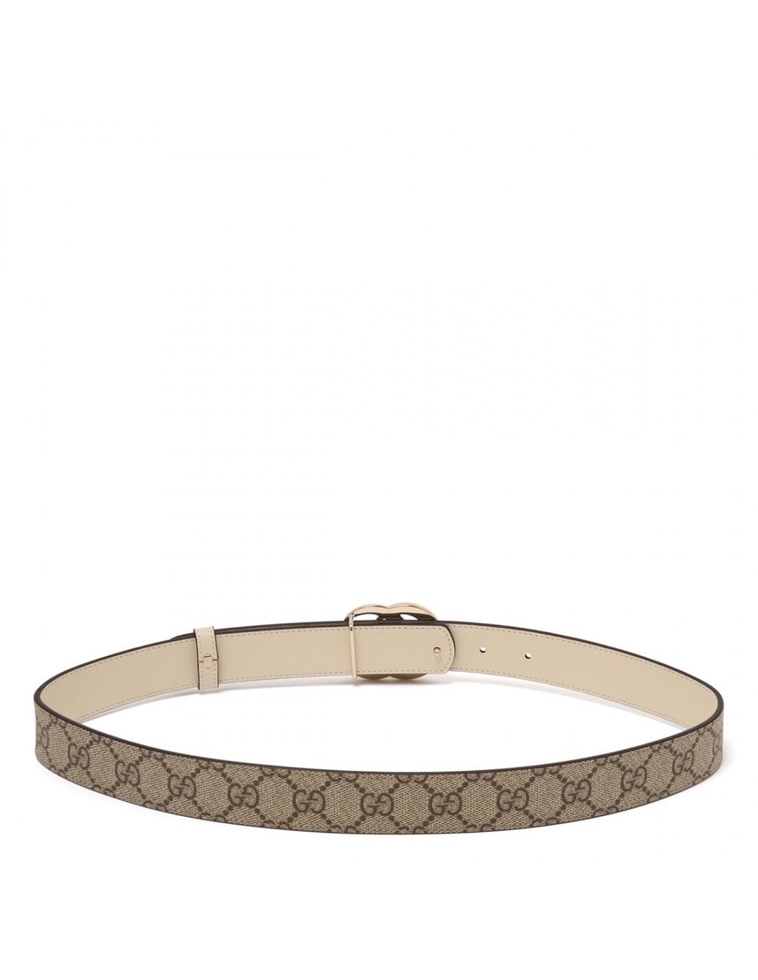 Reversible belt from Gucci featuring beige and dark brown GG Supreme on one side, ivory leather on the other, light gold-toned double G buckle fastening.