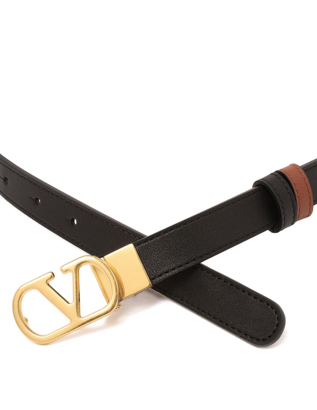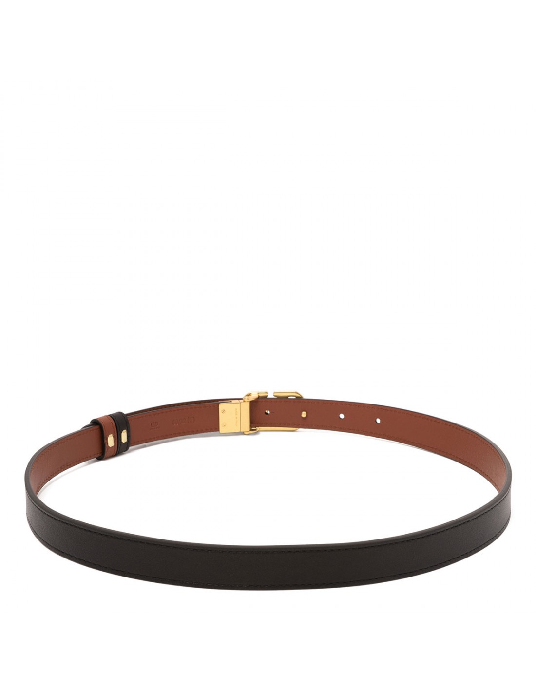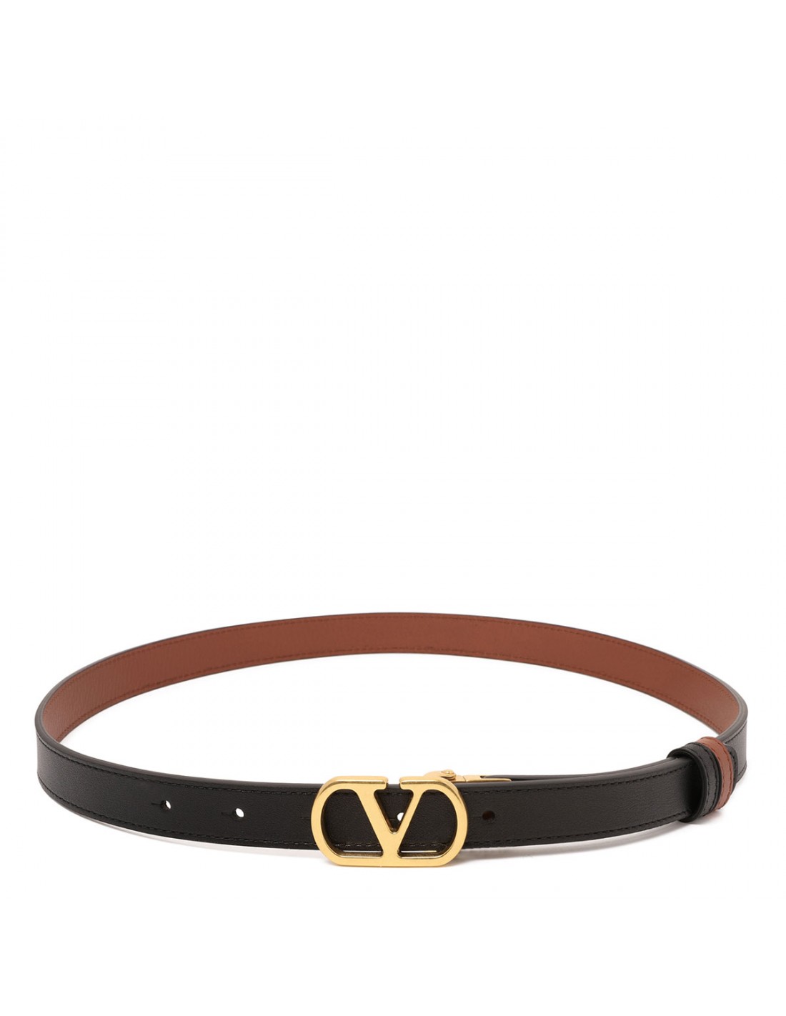 Black and deep caramel leather calfskin belt from Valentino Garavani featuring antique brass finish Vlogo Signature buckle closure, double leather loop. H.20.