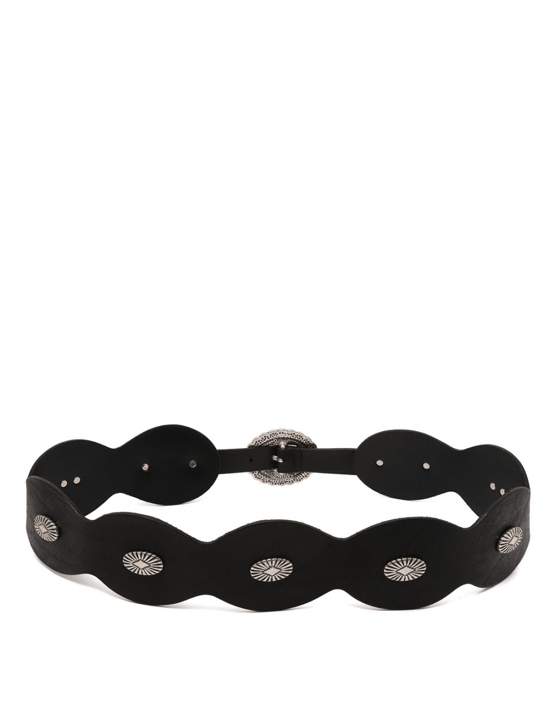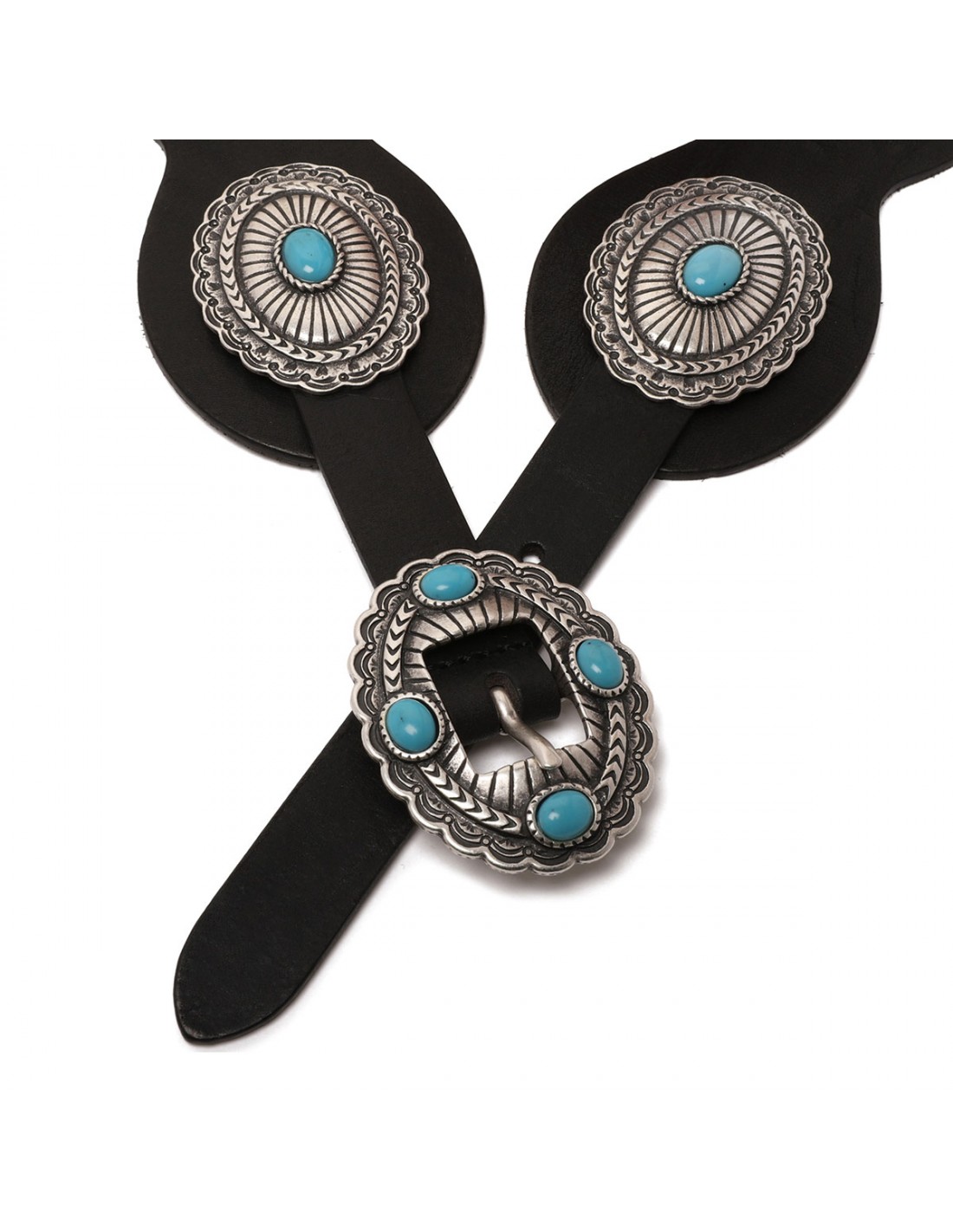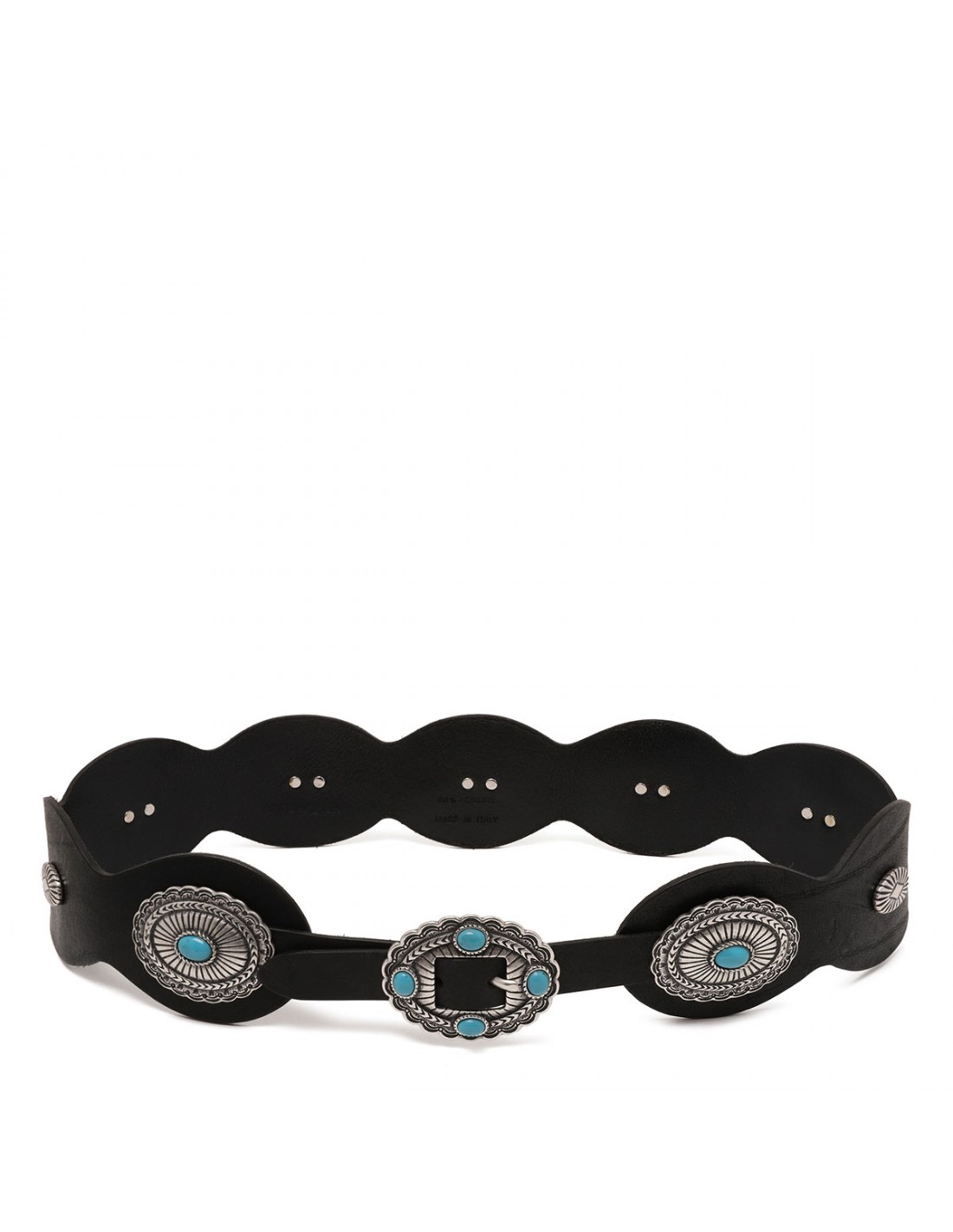 Black leather Tatum belt from Fortela featuring circular decorative elements with turquoise stone, shaped shaft, decorative oval central buckle fastening.