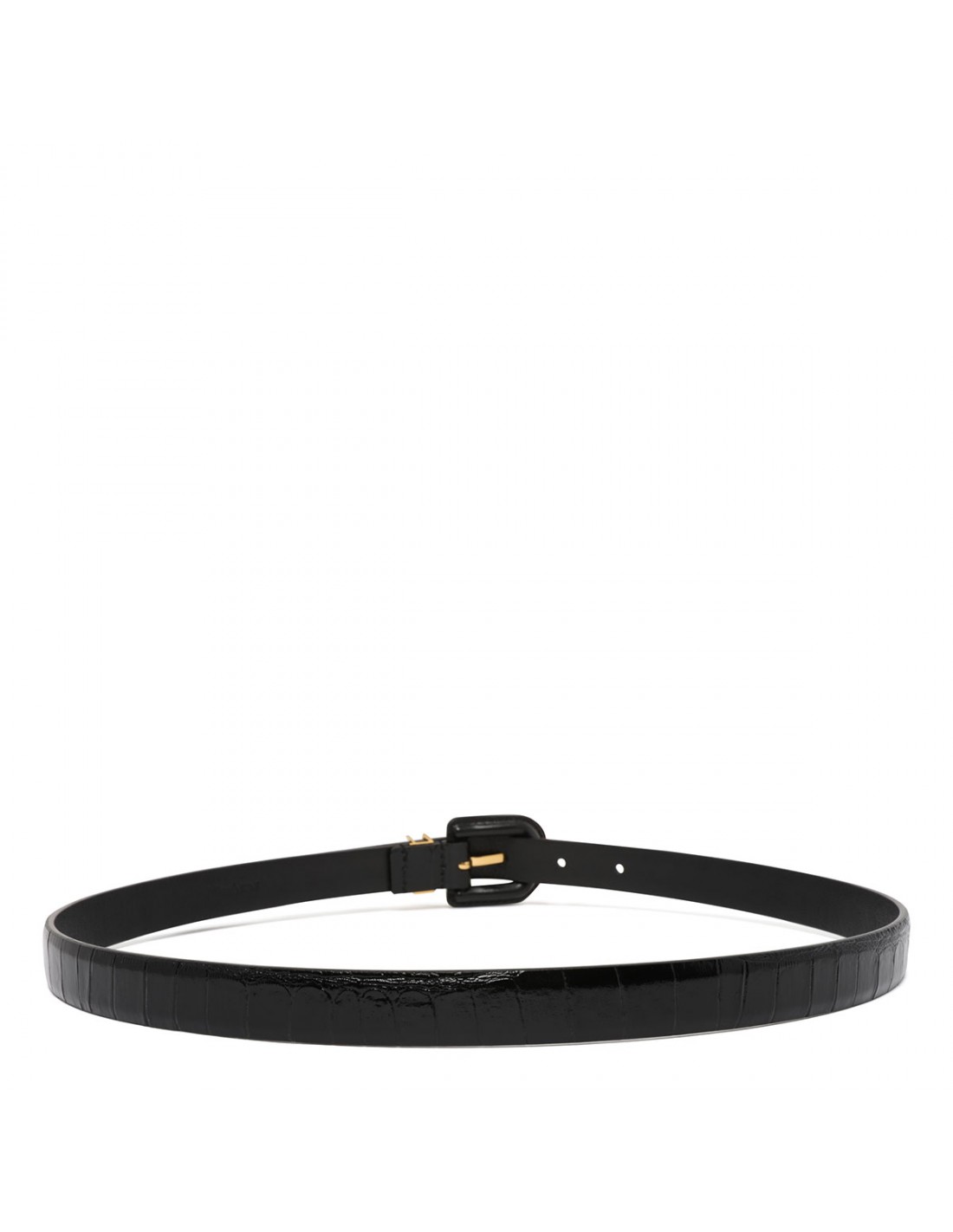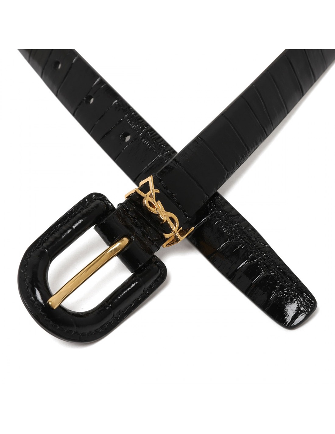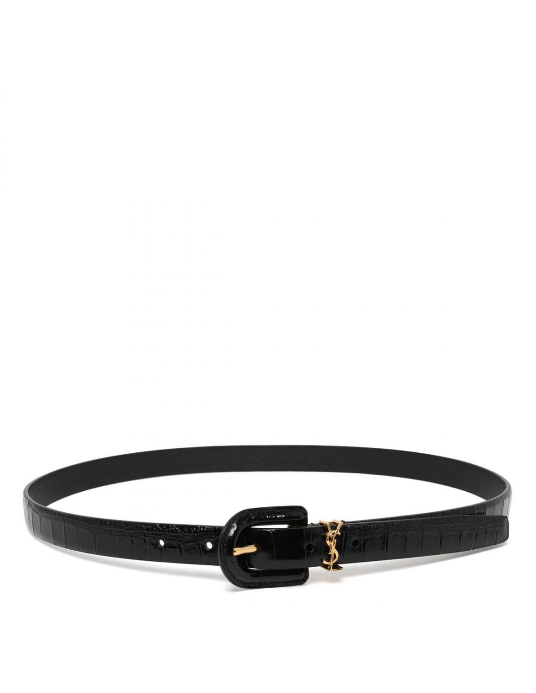 Black croc-embossed leather Cassandre belt from Saint Laurent featuring gold-toned Cassandre logo loop, leather-covered U-buckle fastening.