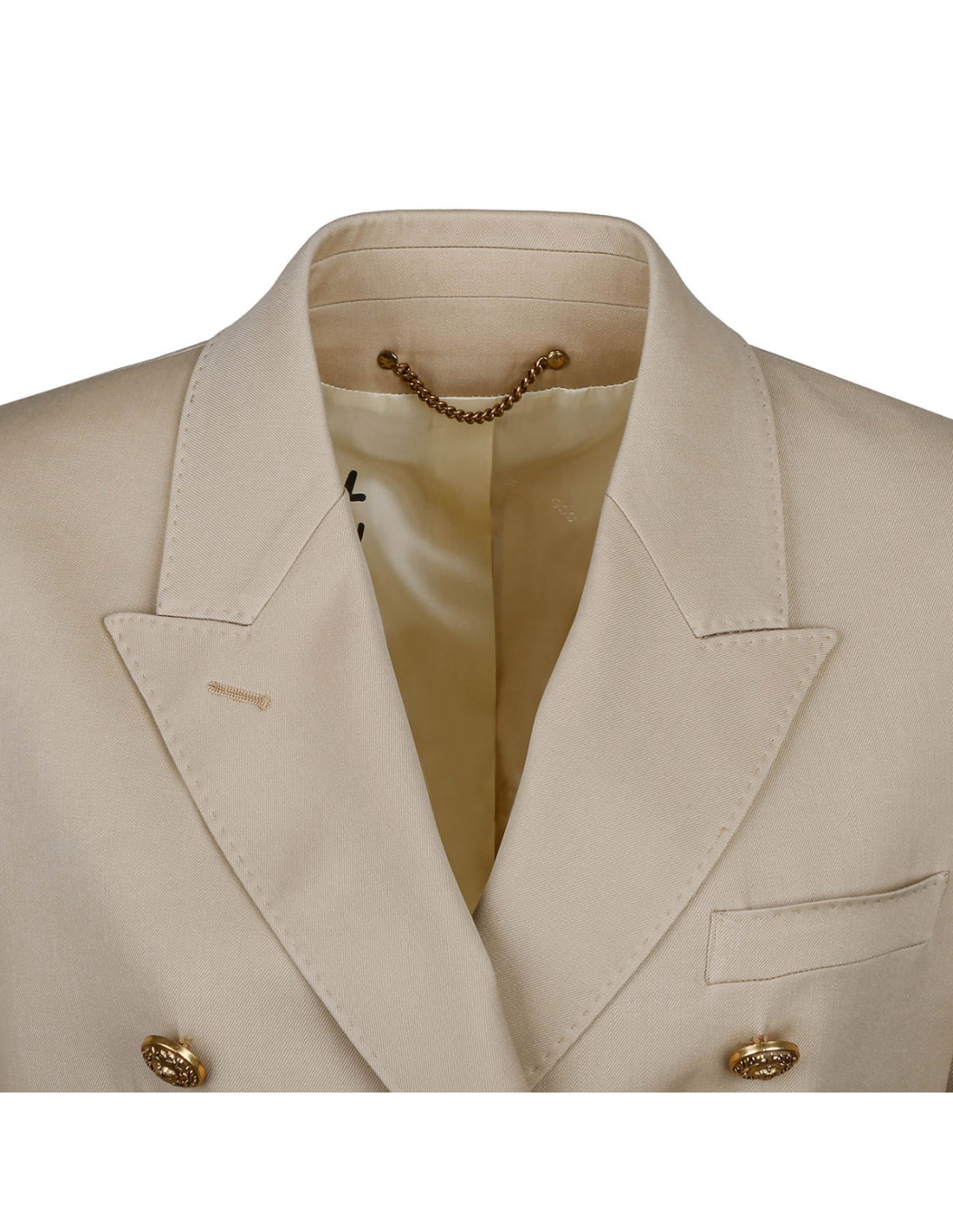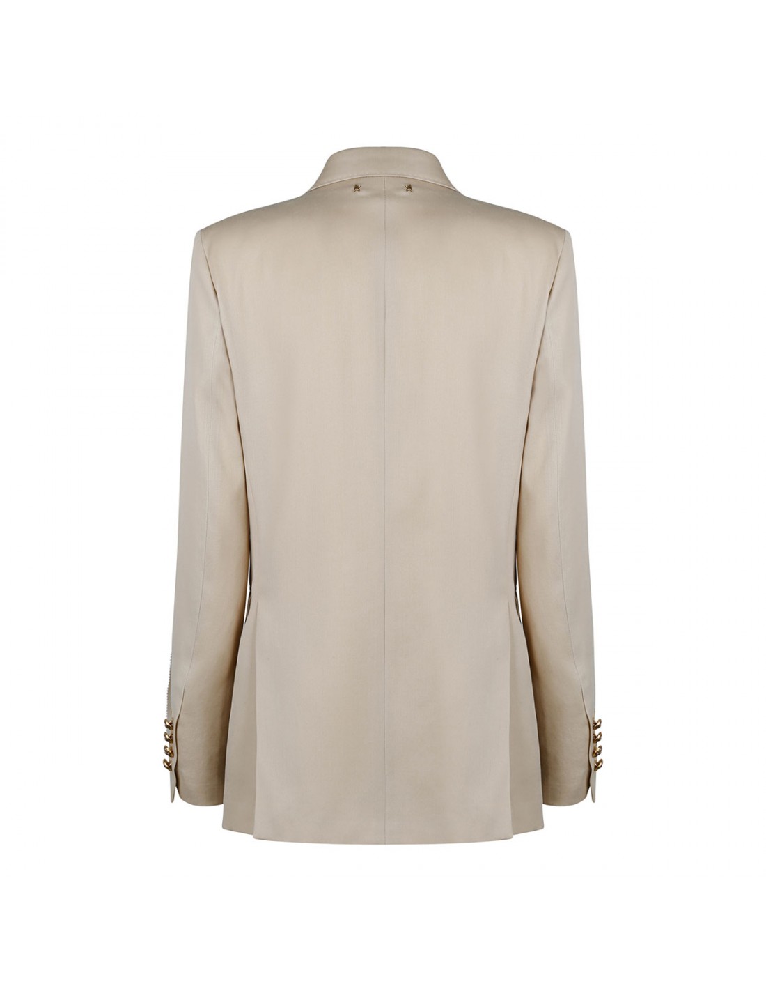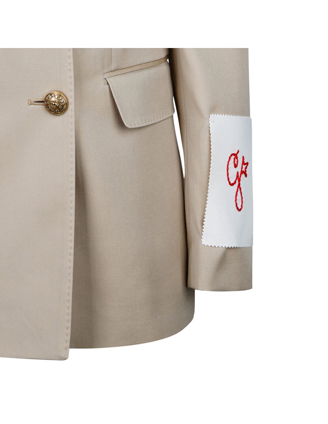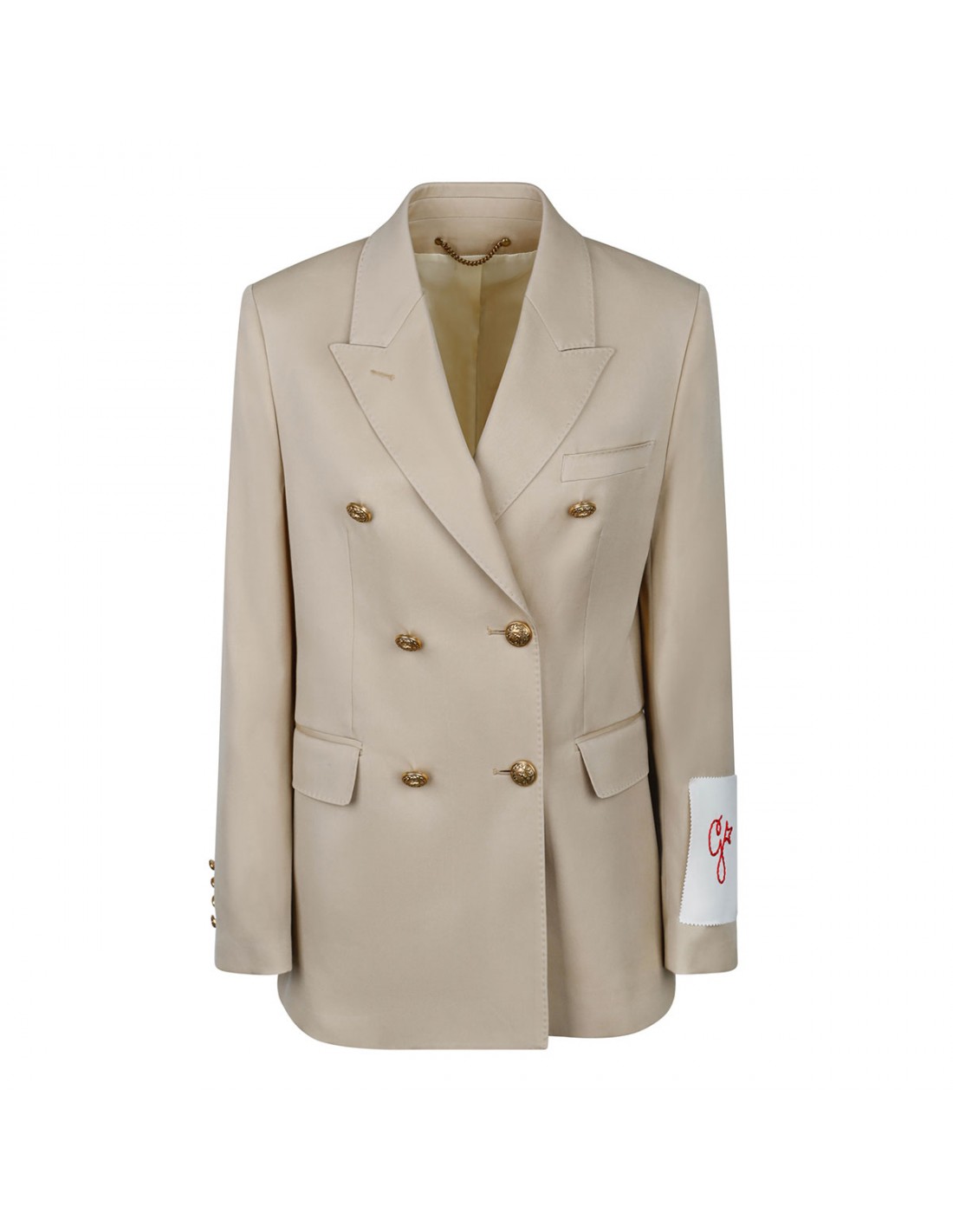 Sand light virgin wool blazer from Golden Goose featuring double-breasted silhouette, button closure, side flap pockets, classic lapel, chest pocket, double back vent, detachable white patch with embroidered letter G in red, double gold star on back.