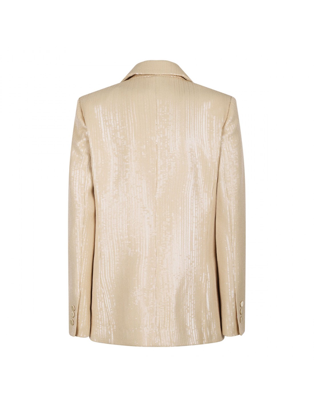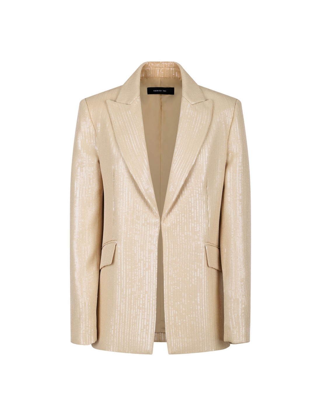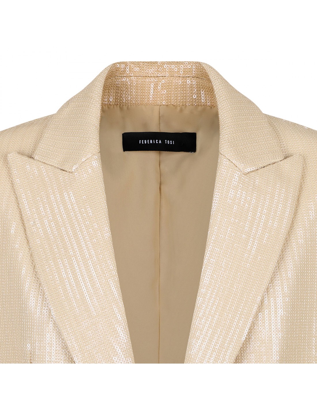 Rafia hue sequin blazer from Federica Tosi featuring classic lapel, concealed hook fastening, side flap pockets, slightly padded shoulders, buttoned cuffs.