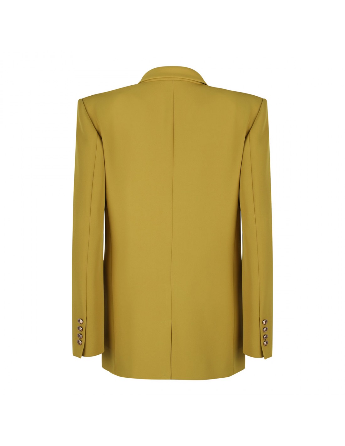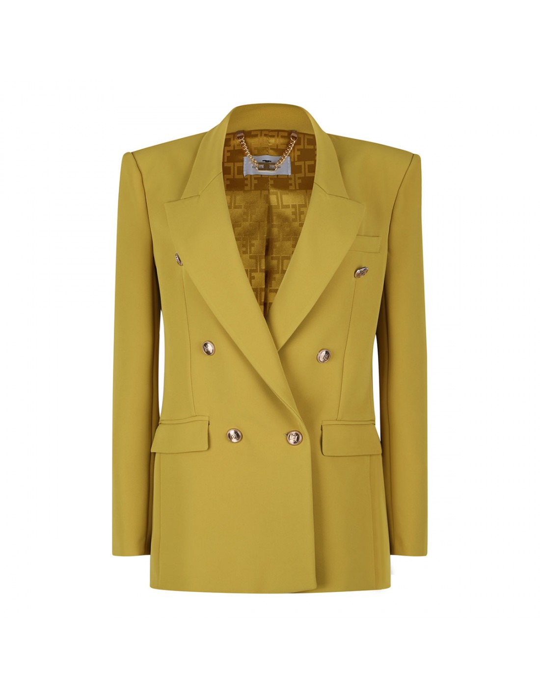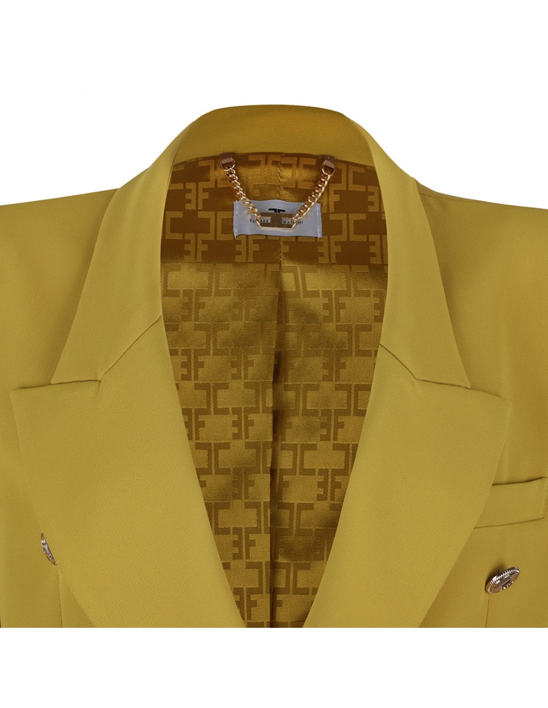 Curry hue stretch crêpe blazer from Elisabetta Franchi featuring peak lapels, double-breasted silhouette, flap pockets, golden metal logo buttons, padded shoulders, buttoned cuffs, branded lining.