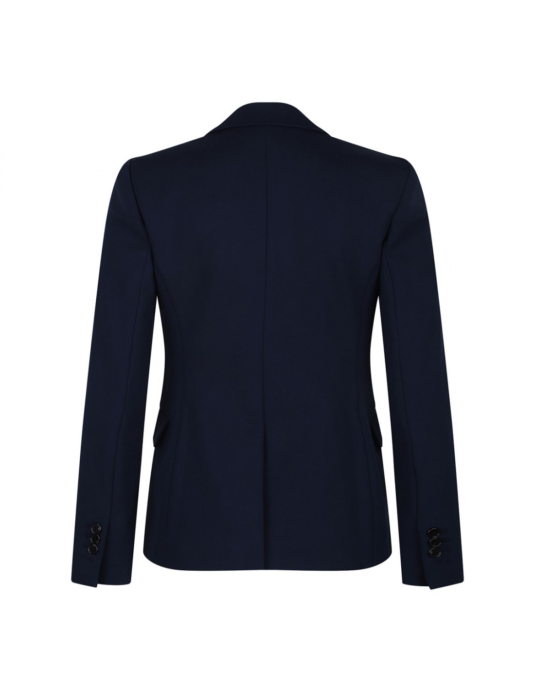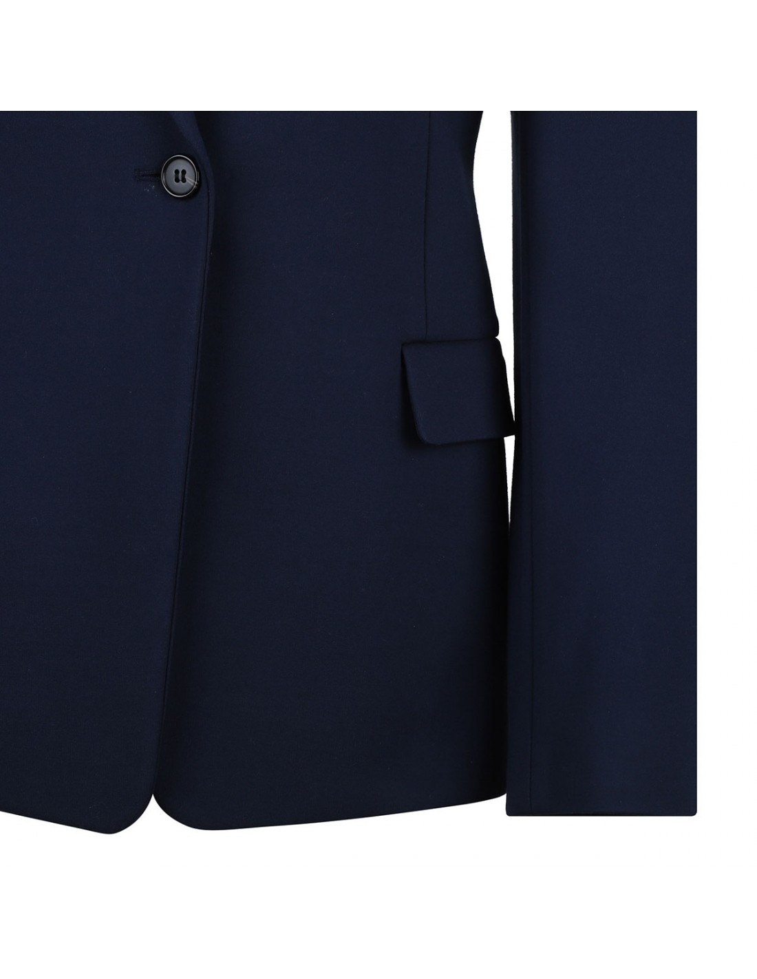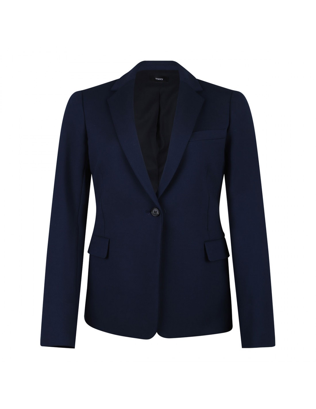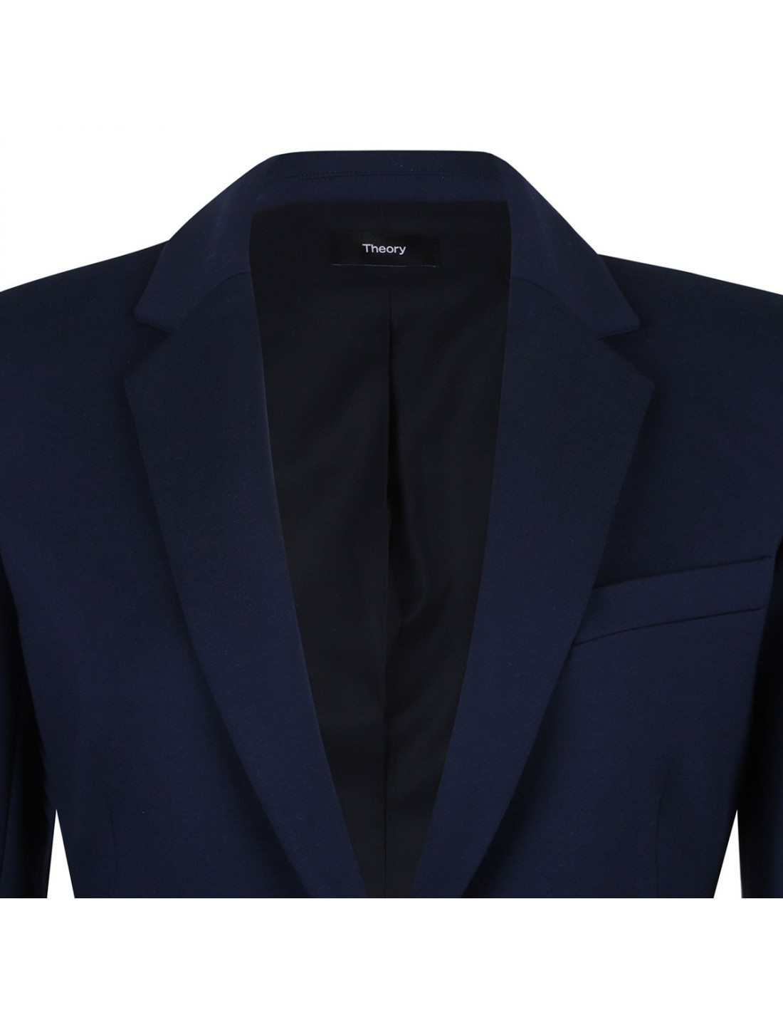 Navy blue viscose blend slim fit blazer from Theory featuring button closure, single breasted silhouette, notched lapels, one-button closure, buttoned cuffs, chest welt pocket, decorative flap pockets, back vent.