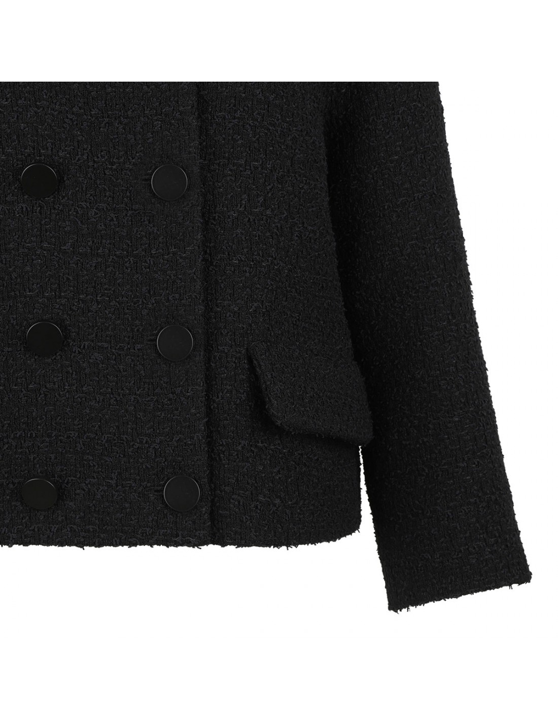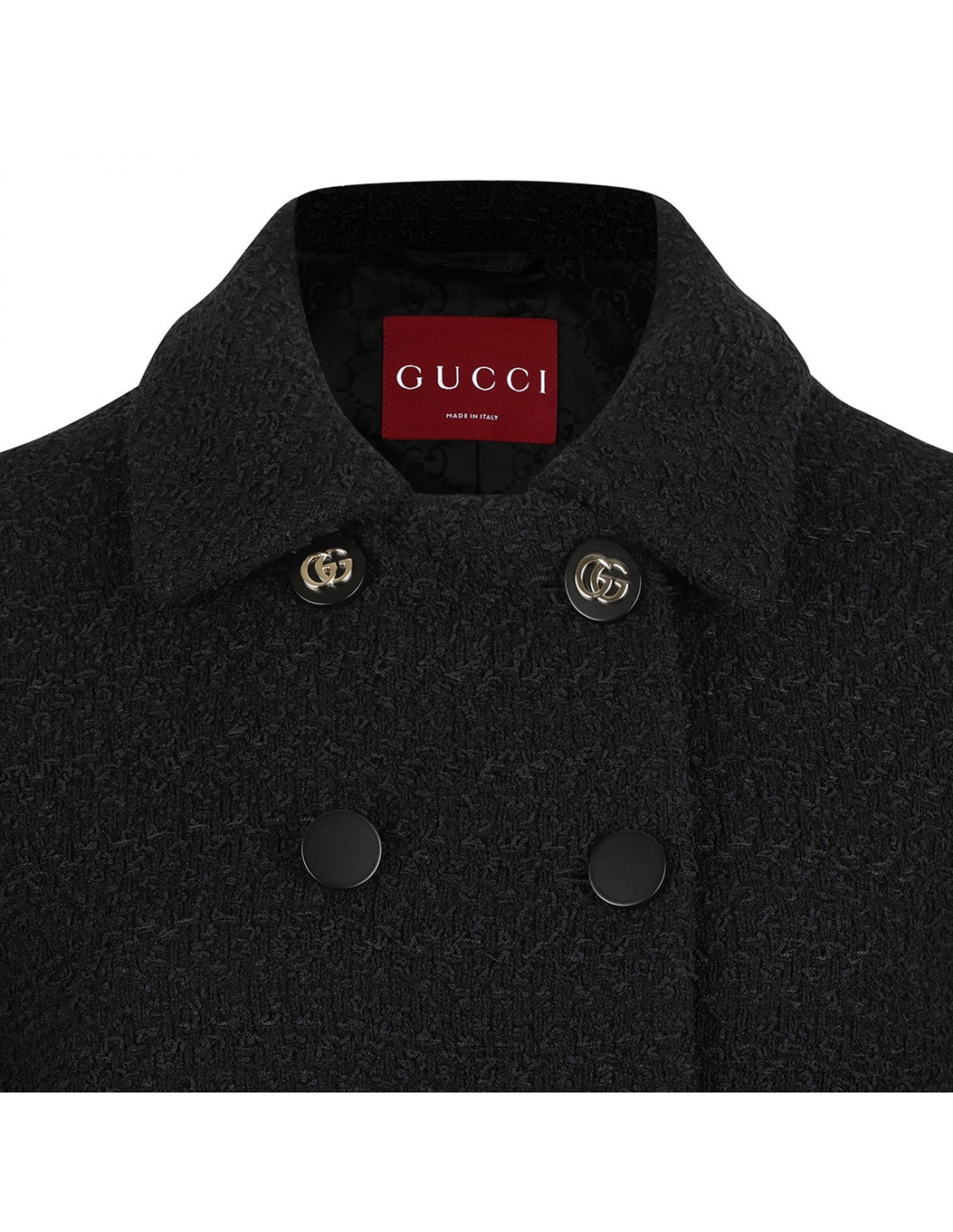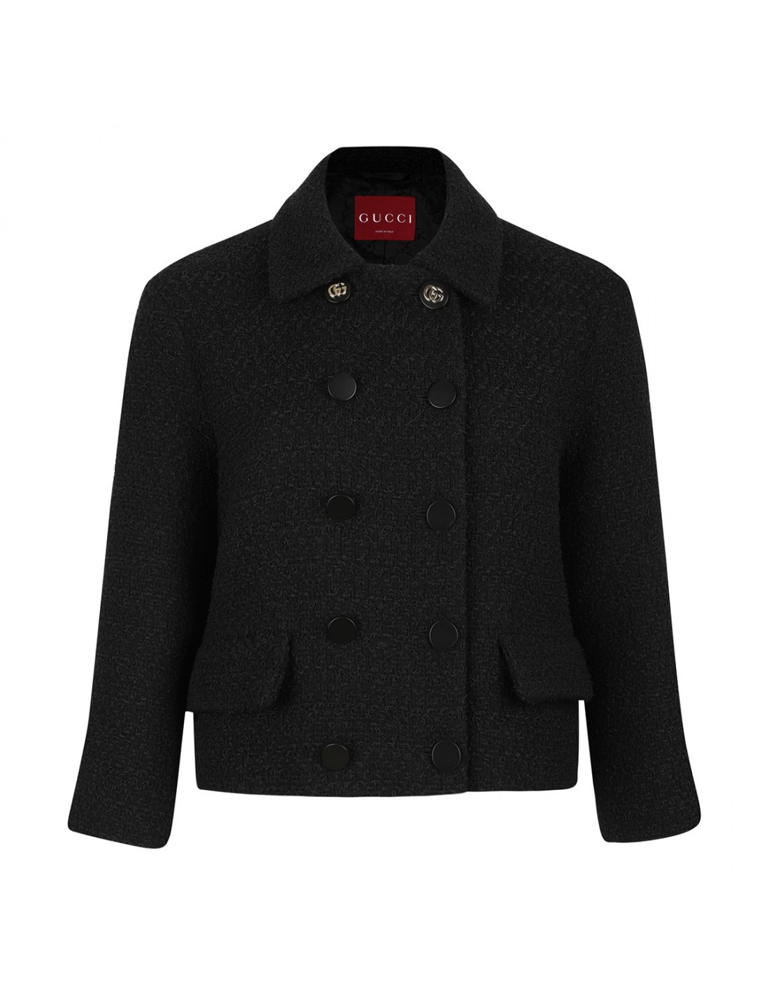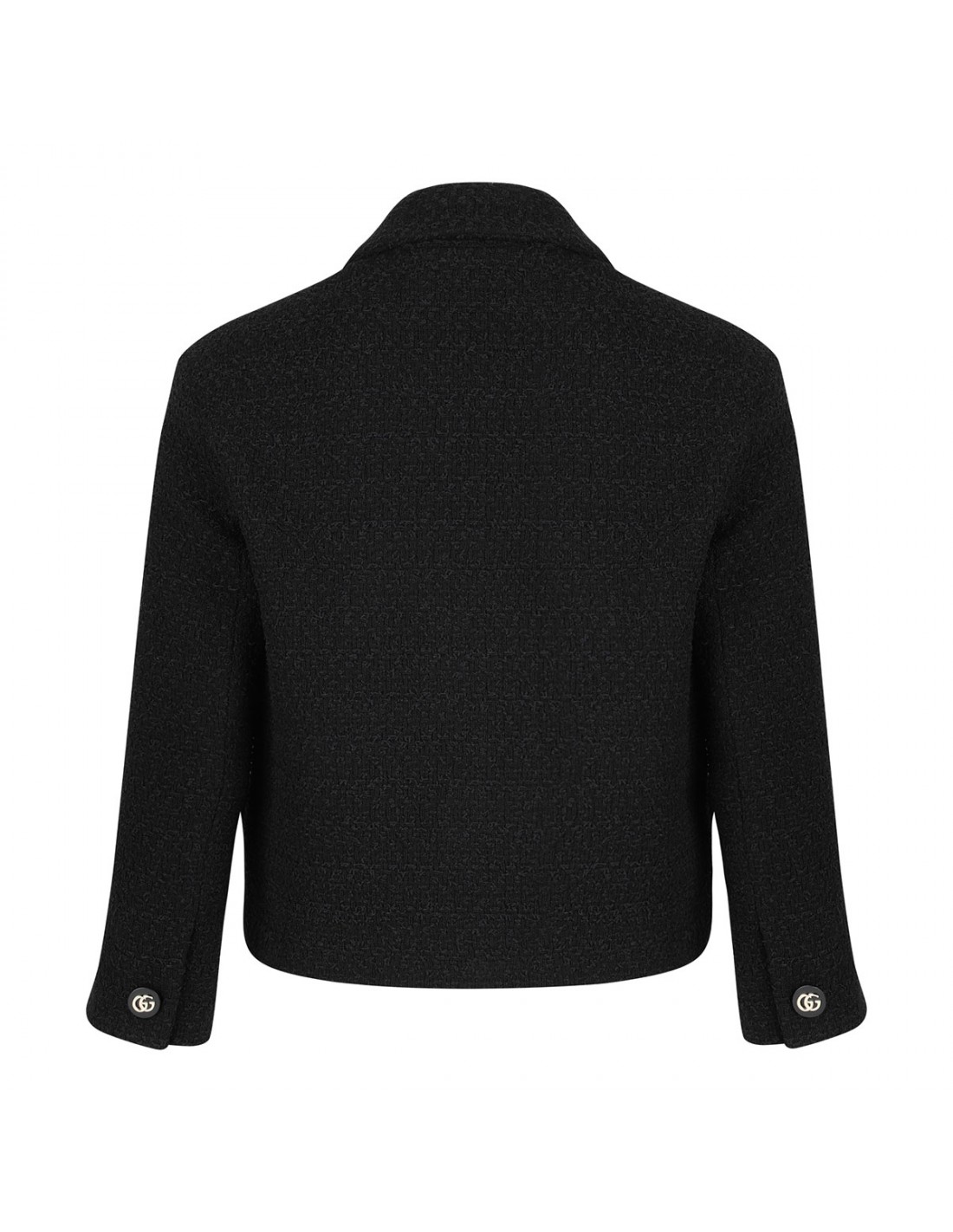 Black wool tweed blazer from Gucci featuring double-breasted silhouette, button closure on front, pointed collar, front flap pockets, golden metal GG logo buttons.