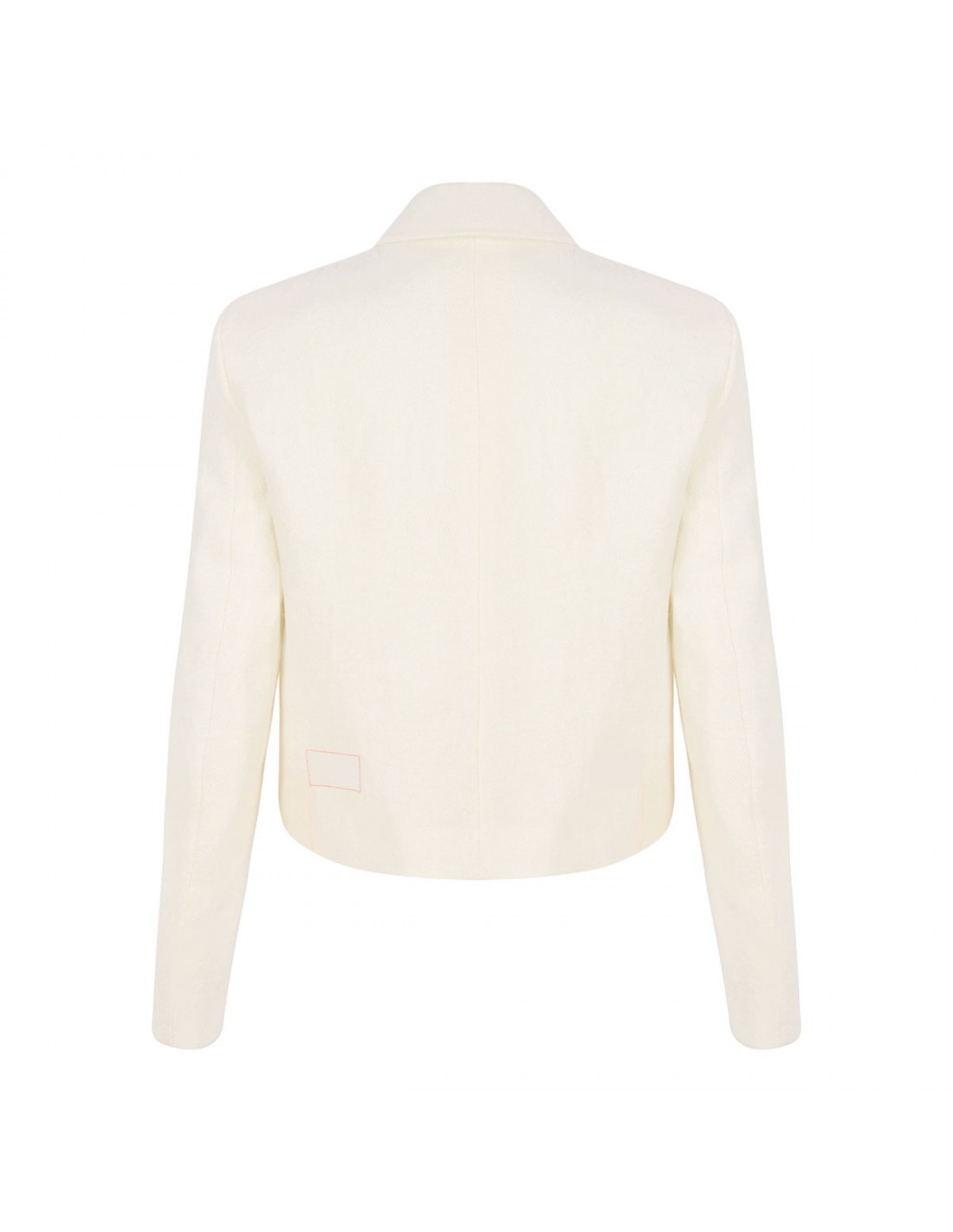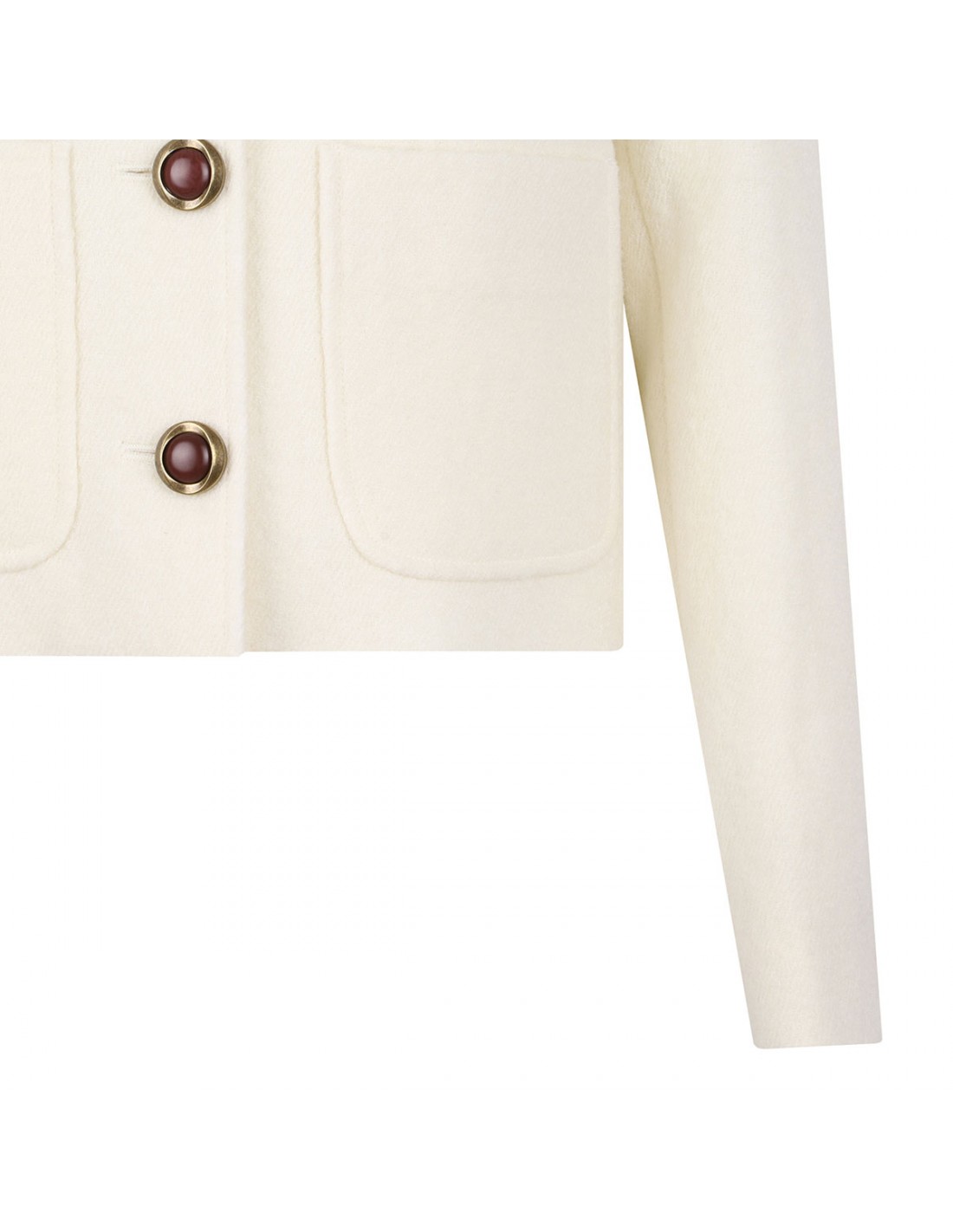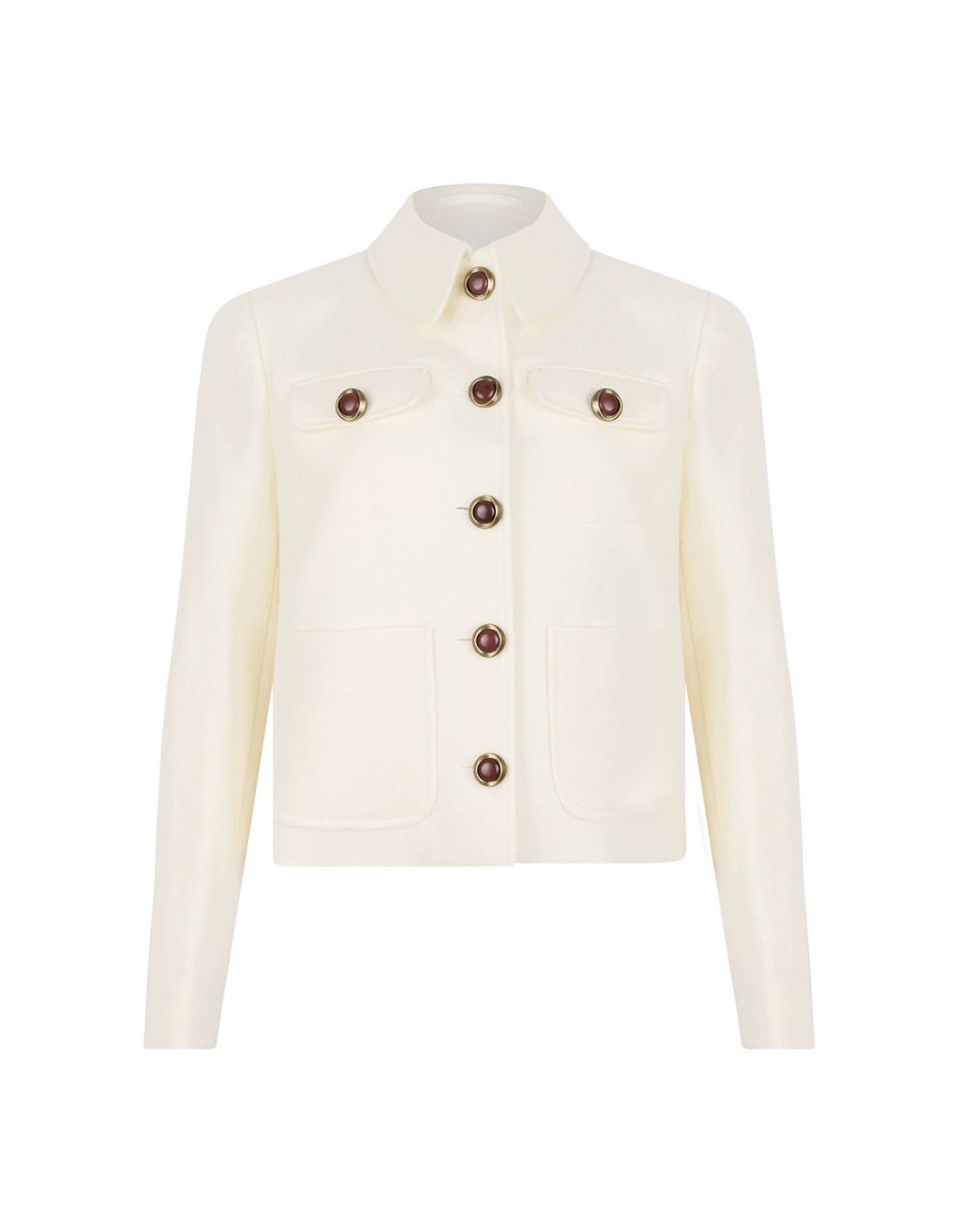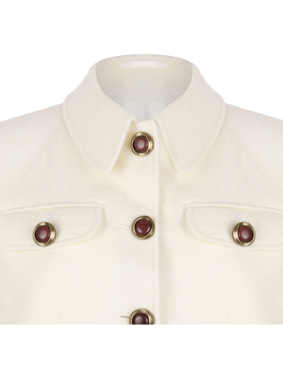 White brushed wool jacket from Fortela featuring pointed collar, jewel button closure on front, chest buttoned flap pockets, boxy silhouette.