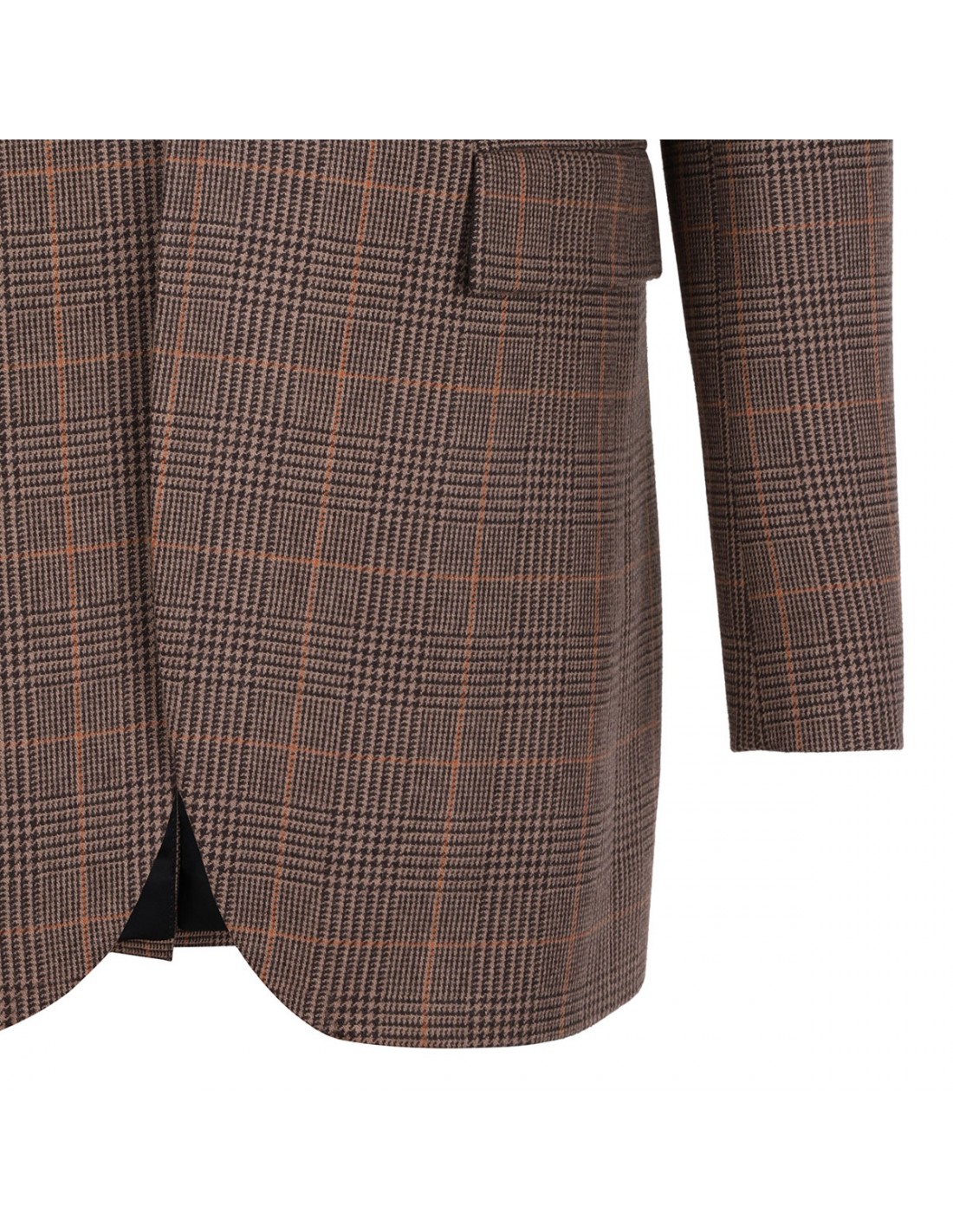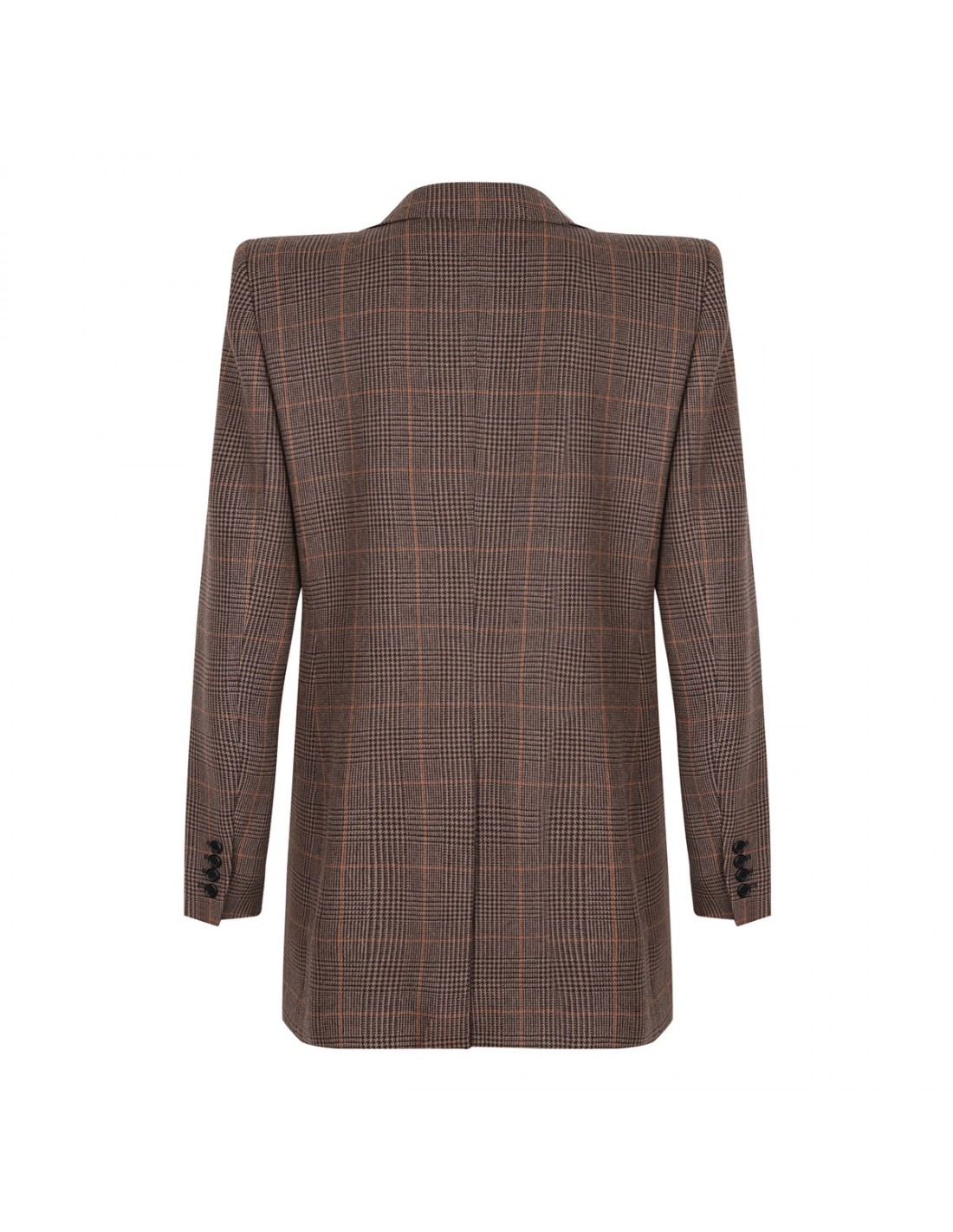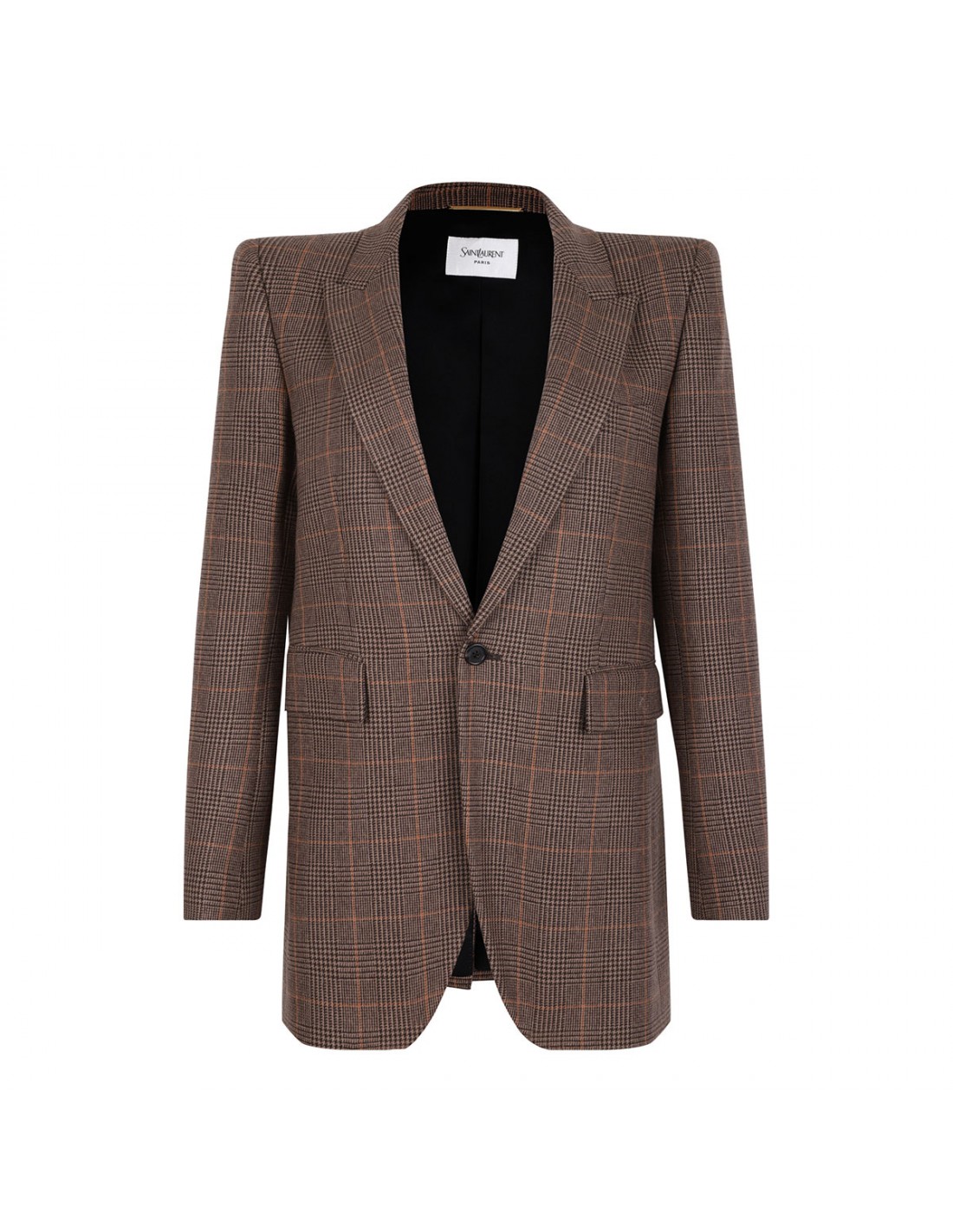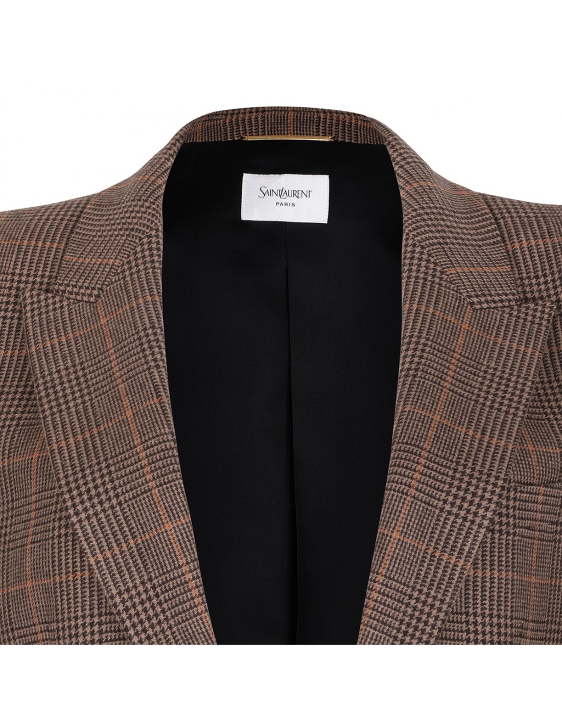 Beige, black and red wool and cashmere blazer from Saint Laurent featuring Prince of Wales motif, classic lapel, single button closure, side flap pockets, chest pocket, buttoned cuffs, back vent.