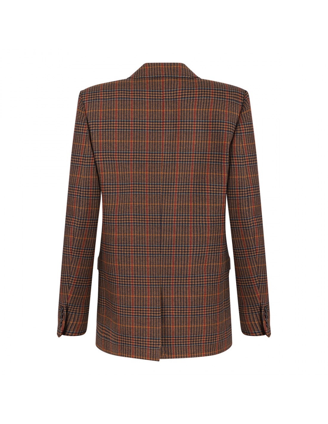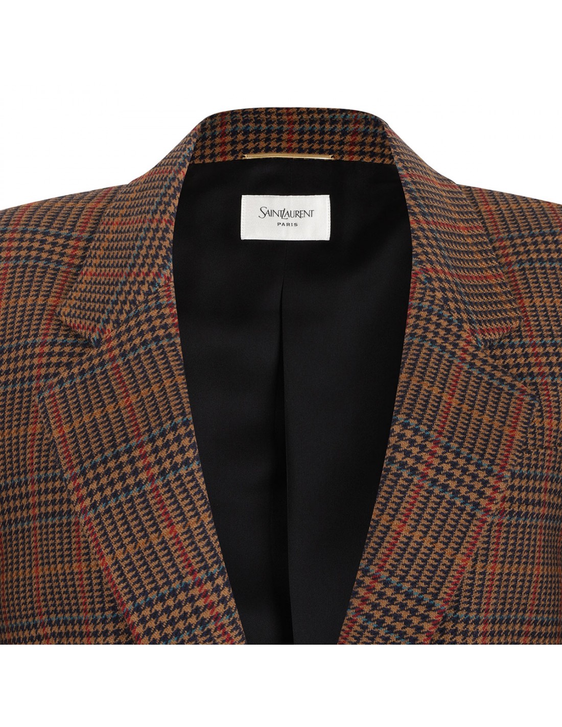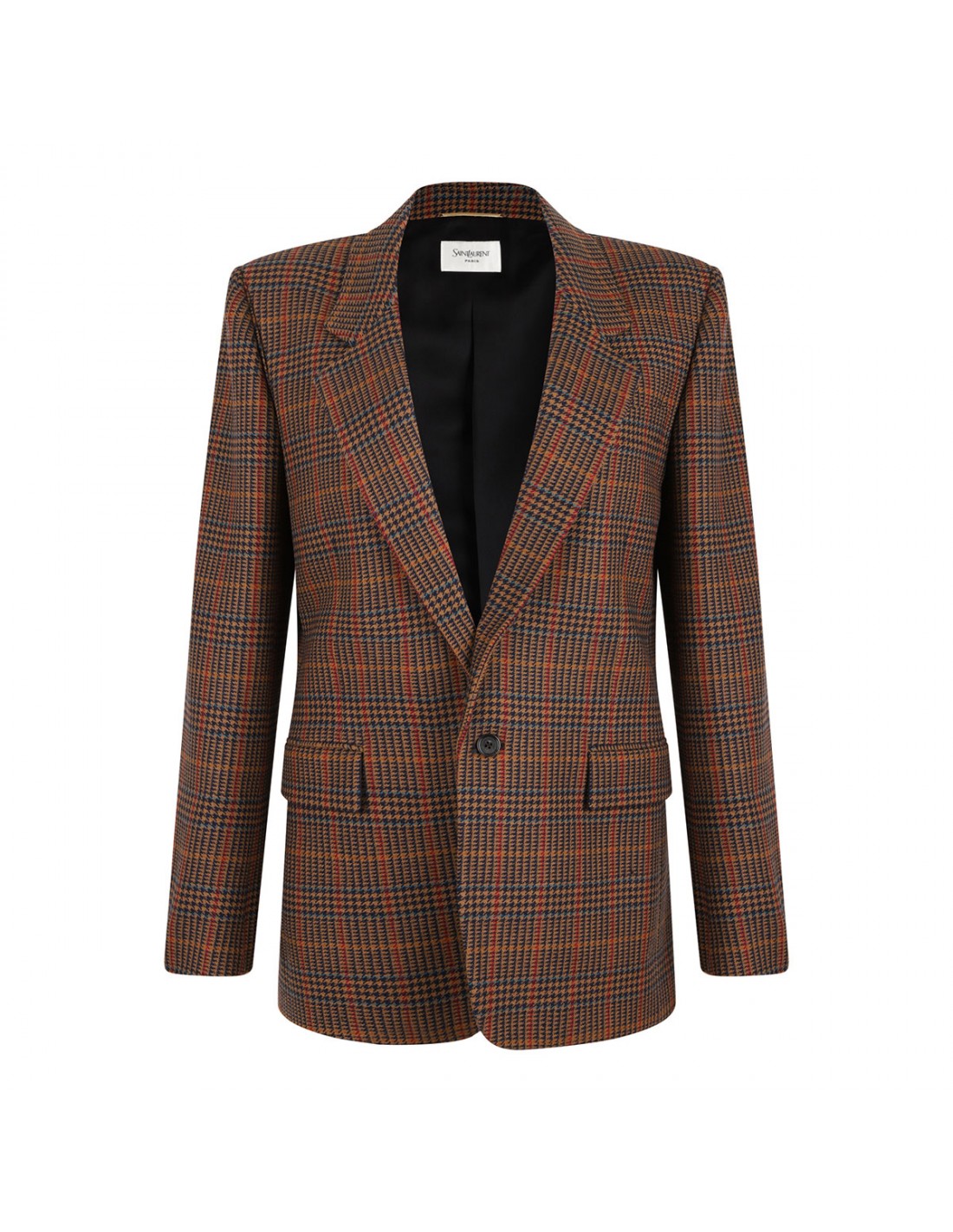 Brown and multicolor wool blazer from Saint Laurent featuring houndstooth motif, notched collar, single button closure, side flap pockets, padded shoulders, chest pocket, buttoned cuffs, back vent.