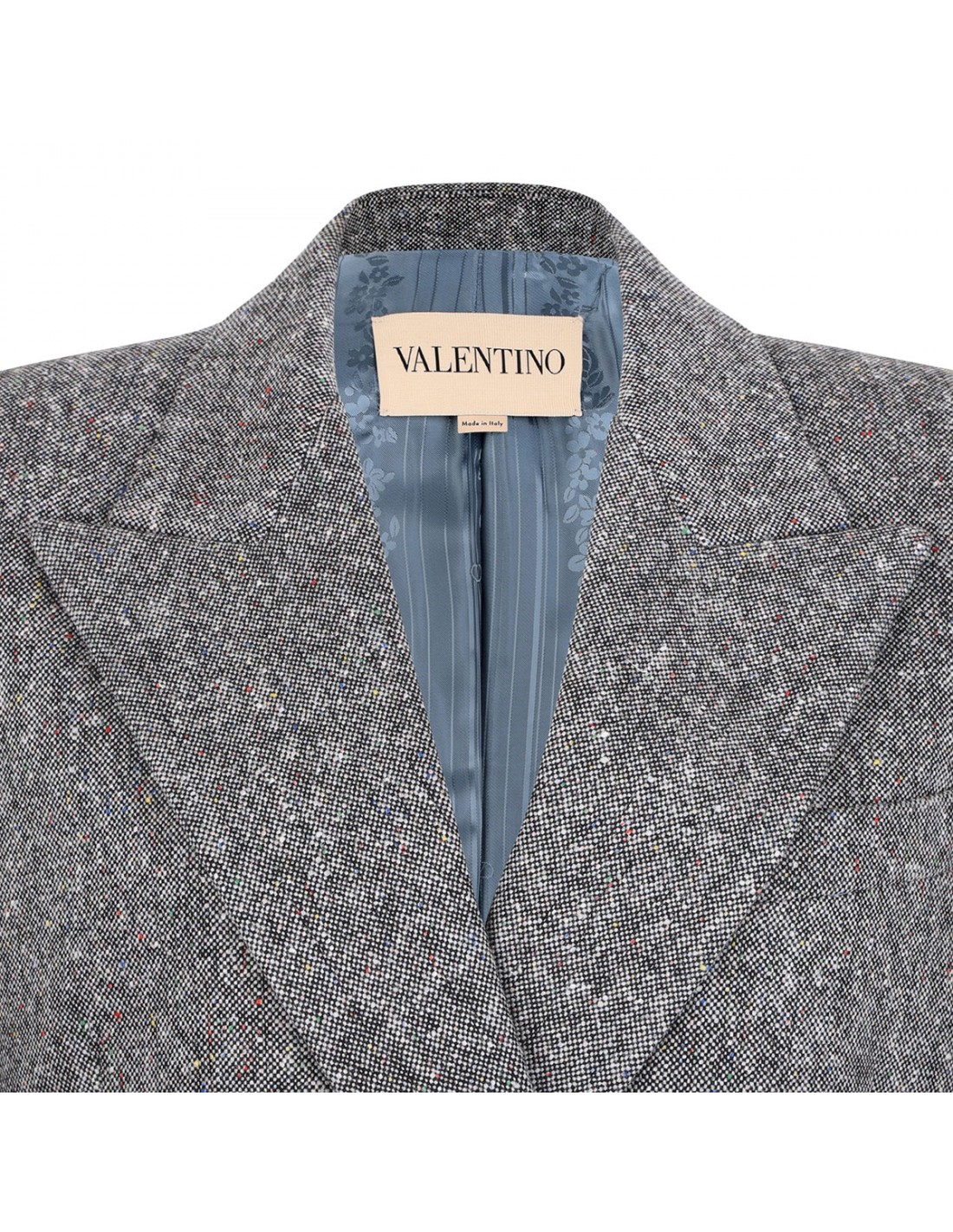 Black and ivory natté Buttoned weave fabric blazer from Valentino featuring double breasted silhouette, button closure, shoulder pads, peak lapels, side flap pockets, flower, stripes and VLogo lining.
