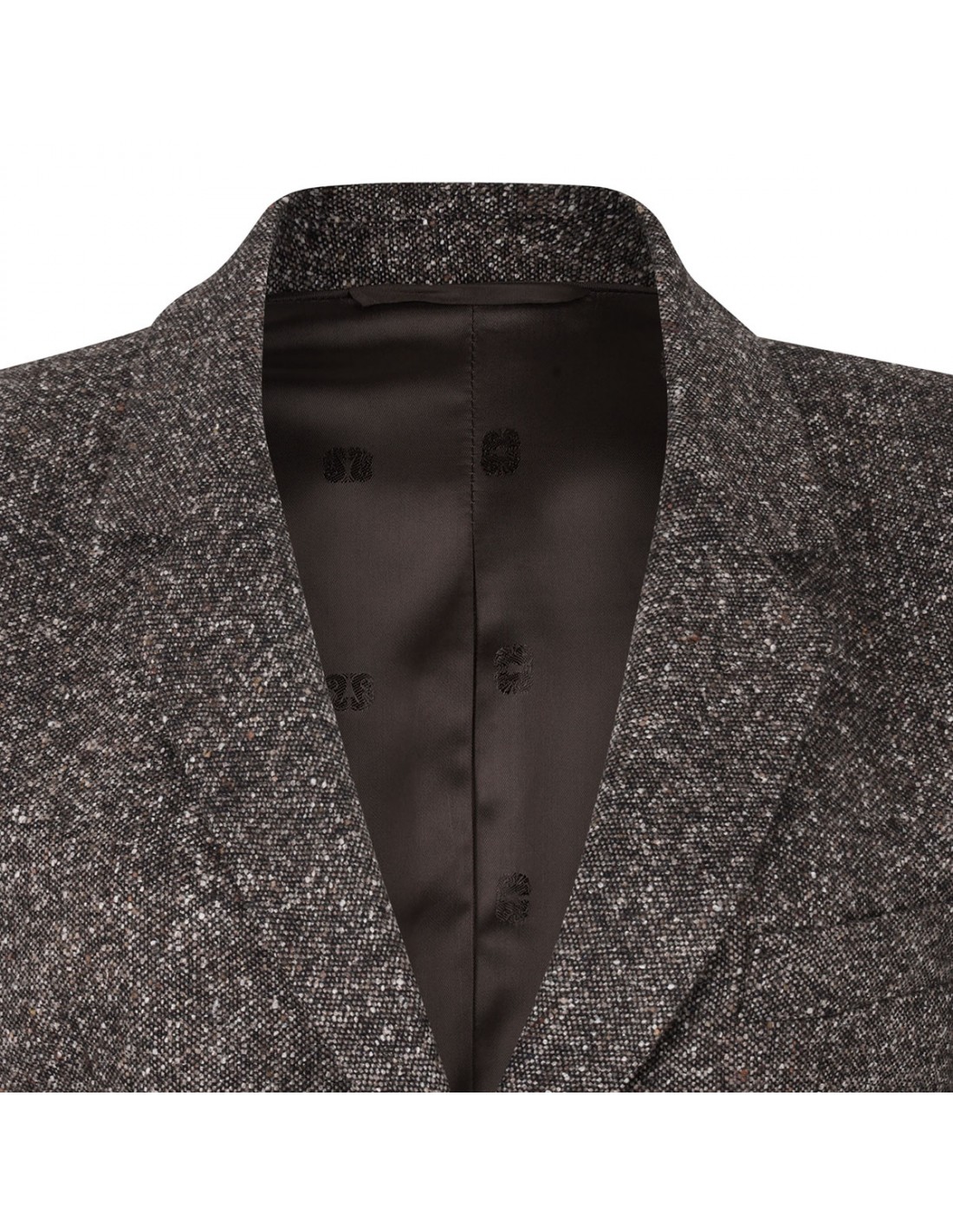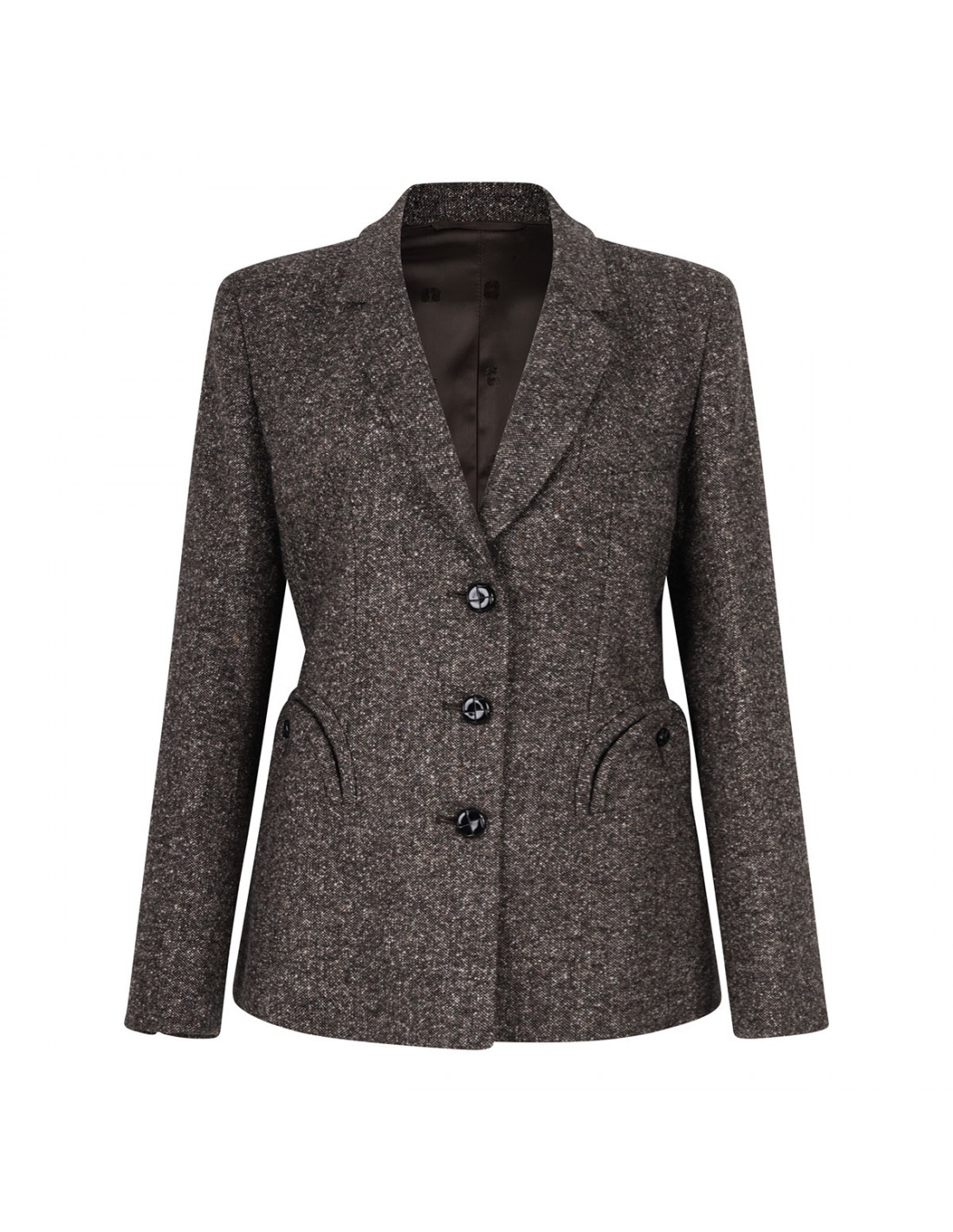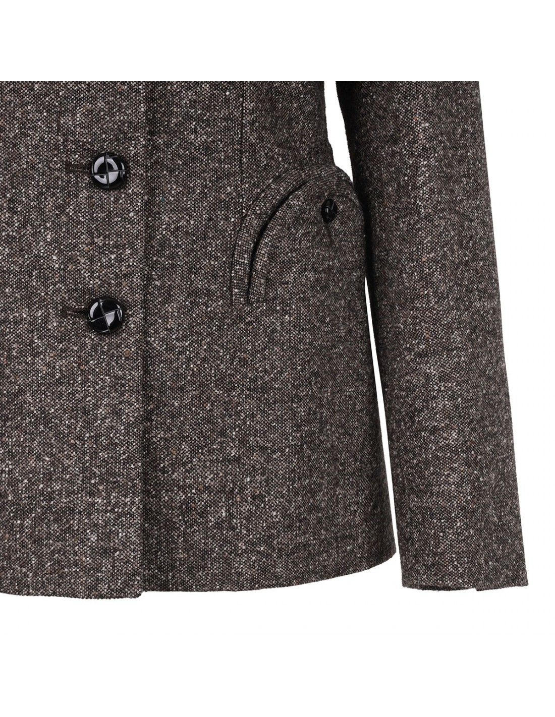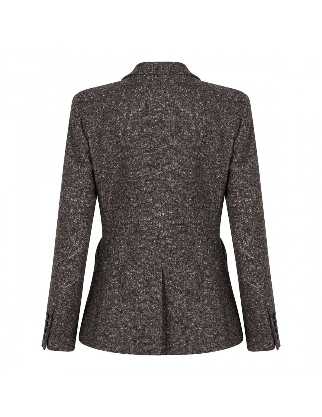 Brown melange wool blend Akira blazer from Blazé Milano featuring hourglass silhouette, single-breasted silhouette, button closure, signature side smiley pockets, small lapel, buttoned cuffs and back vent.
