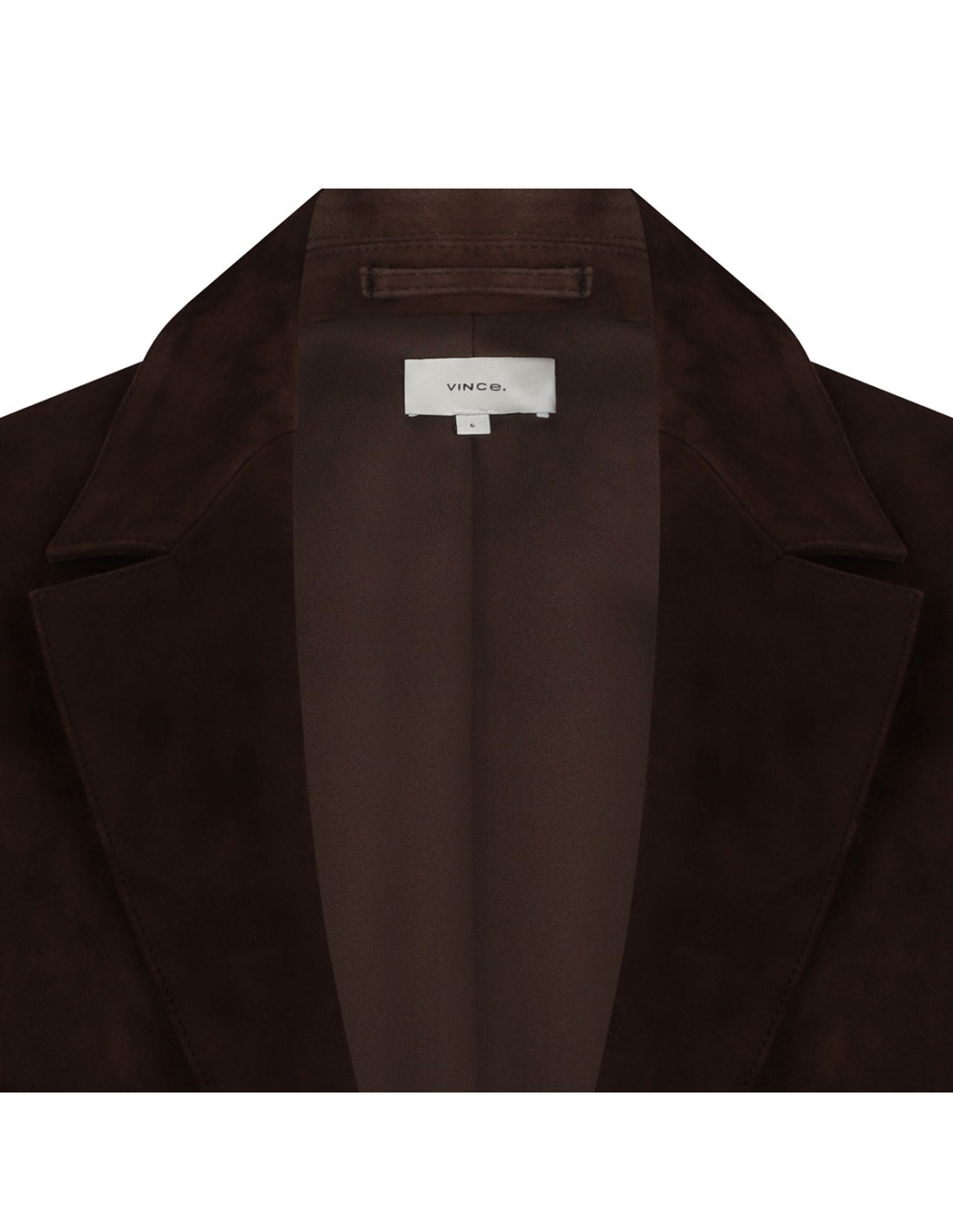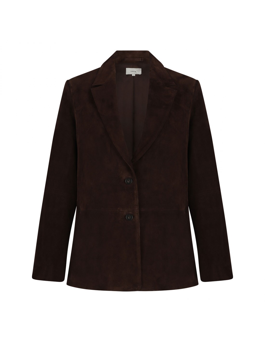 Chocolate brown suede leather blazer from Vince featuring classic lapels, button closure, padded shoulders, side pockets, buttoned cuffs and back vent.