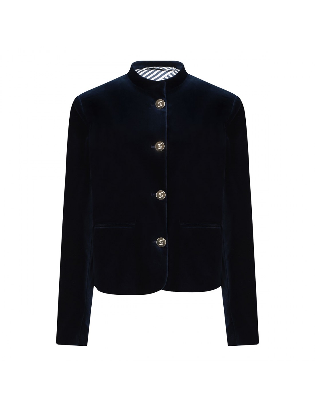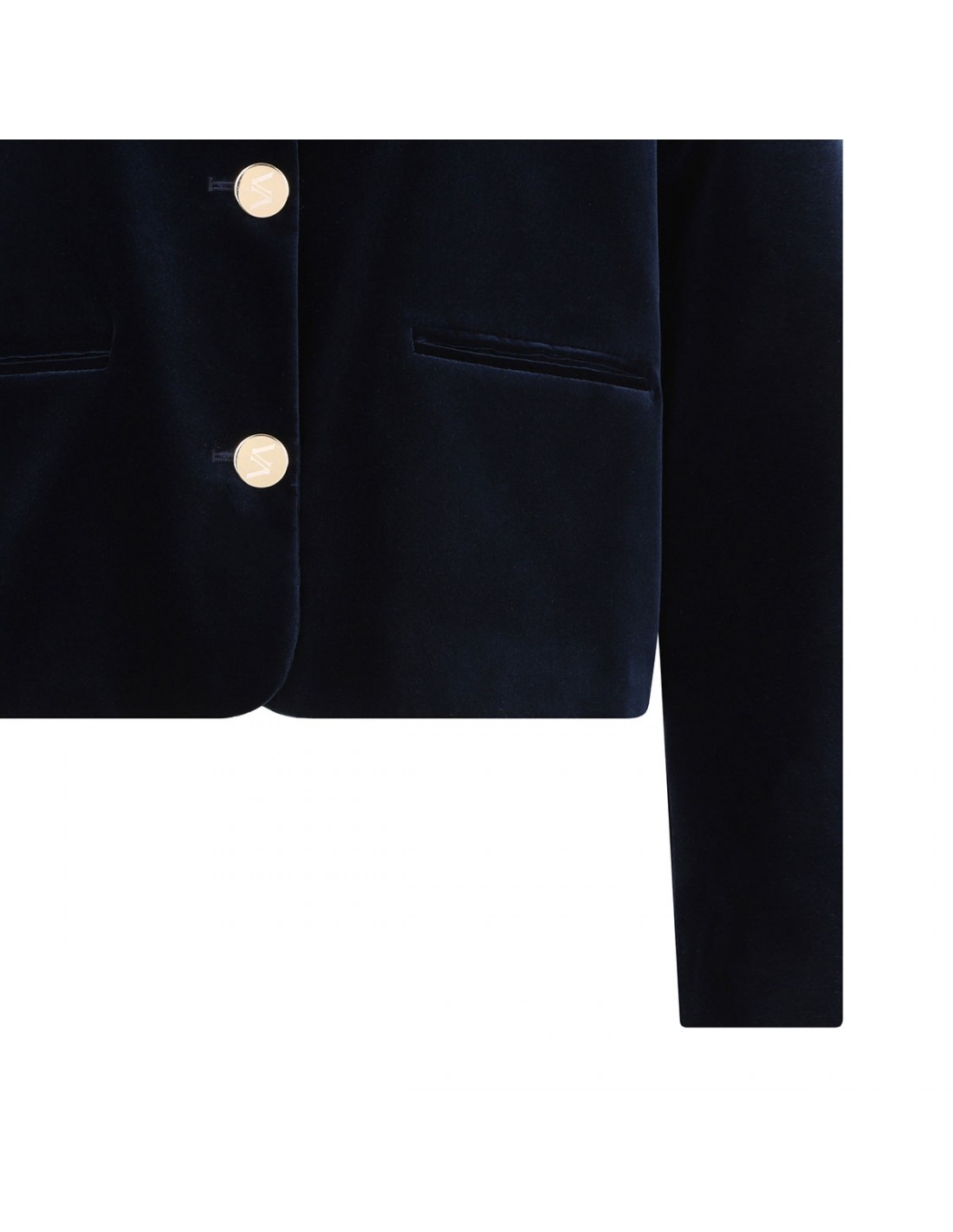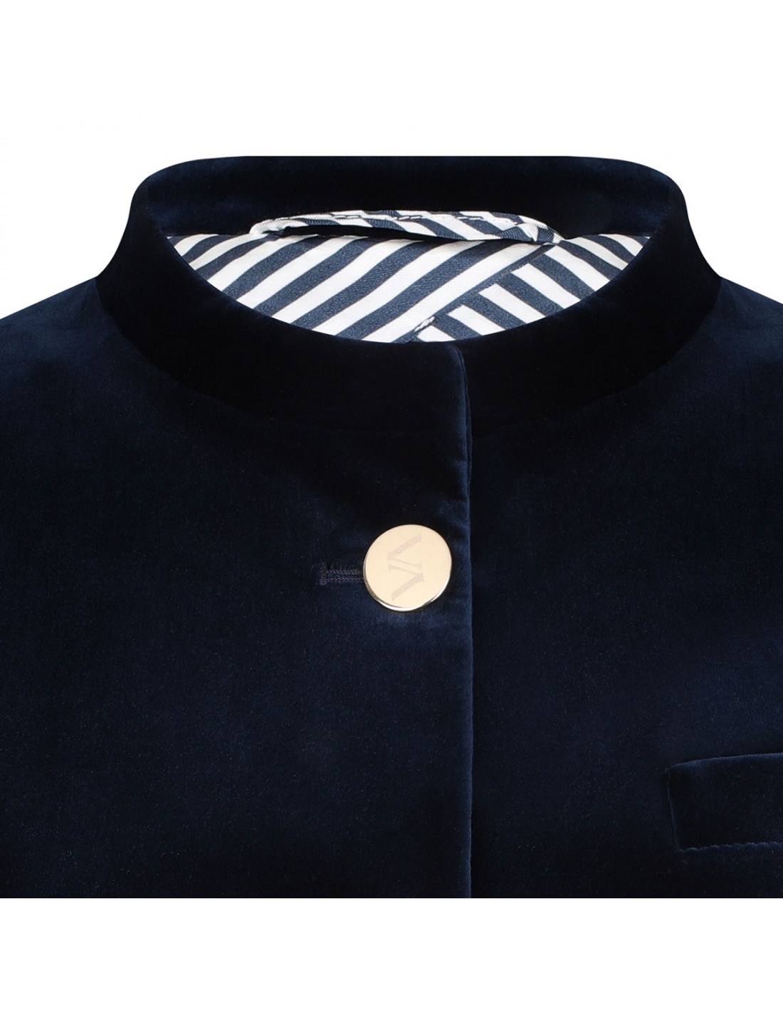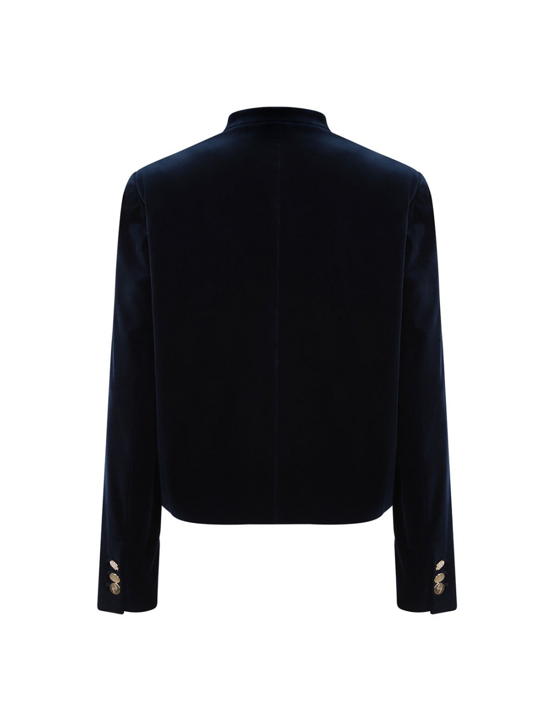 Blue velvet Very blazer from Vitovi featuring stand collar, single-breasted style, golden two-button closure, buttoned cuffs, dropped and unstructured shoulders, two front pockets.