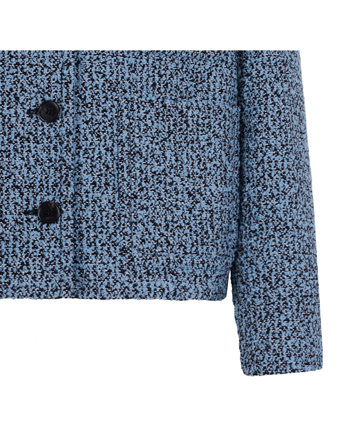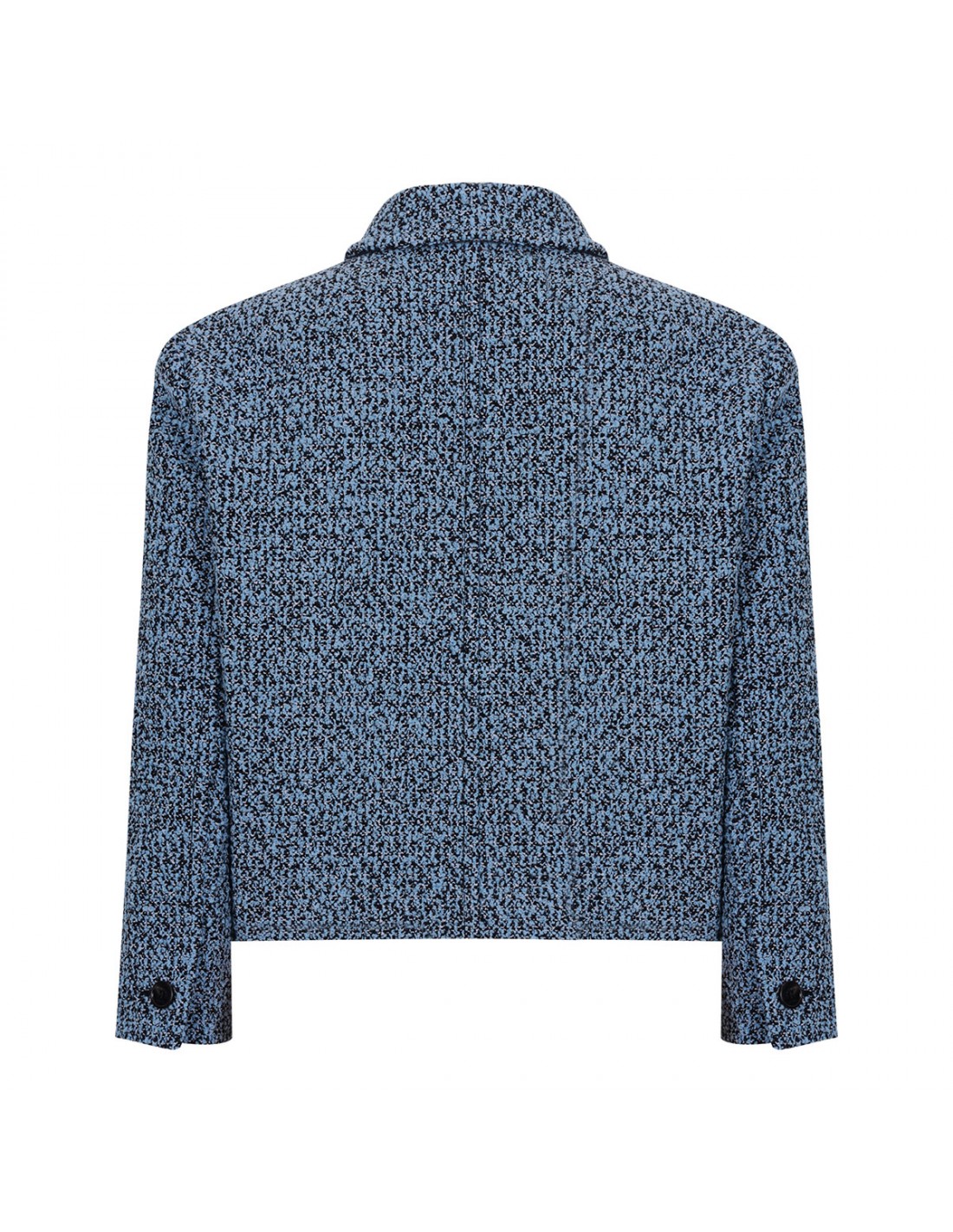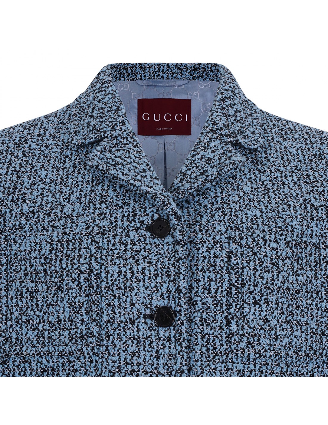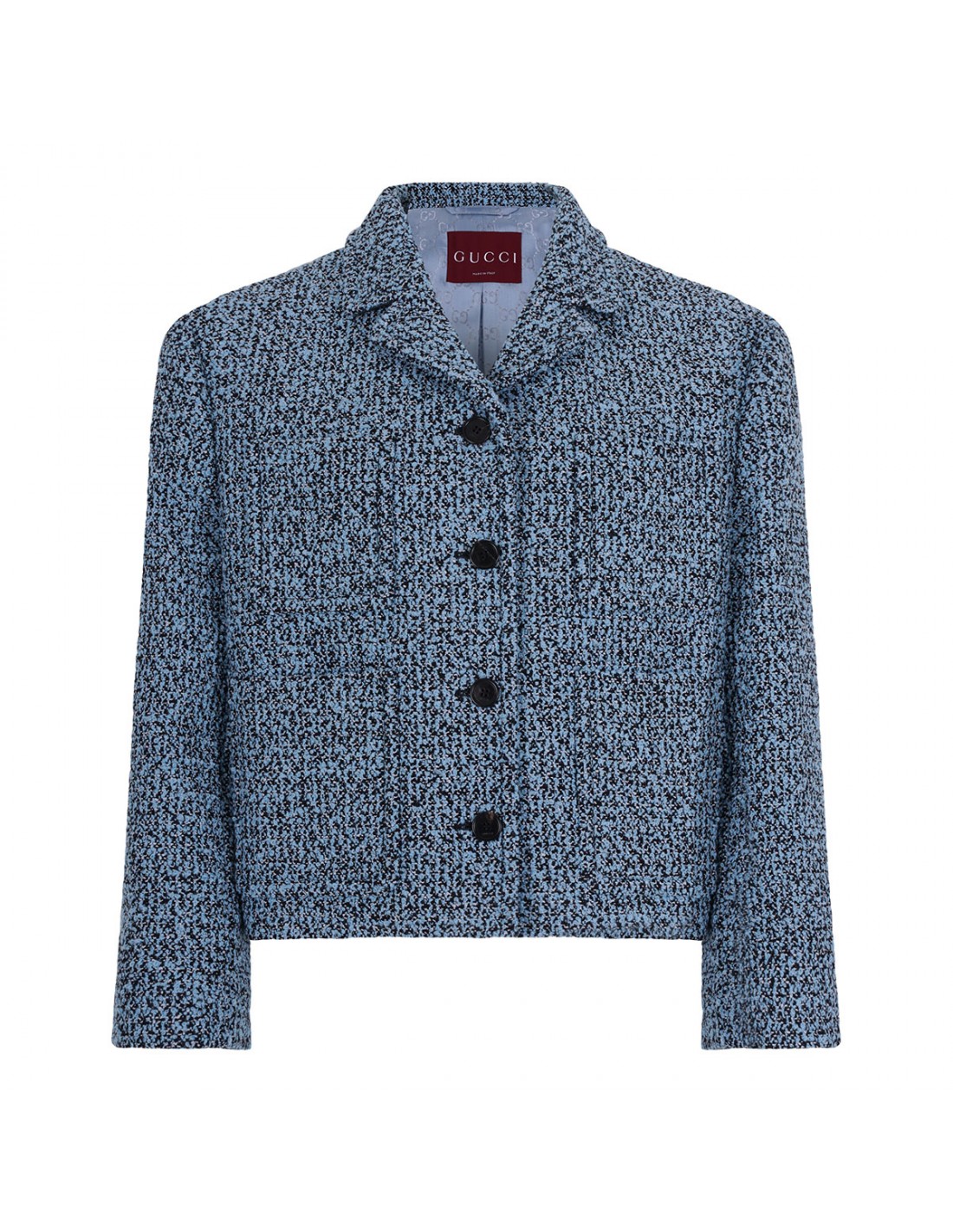 Light blue and black wool cotton bouclé jacket from Gucci featuring peak lapel, four front flap pockets, button closure along front. Fully lined.
