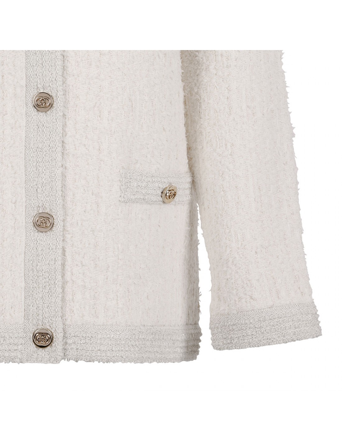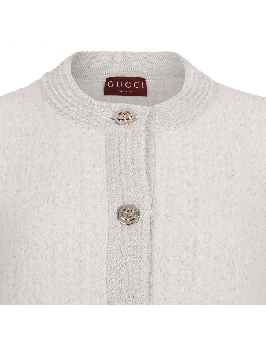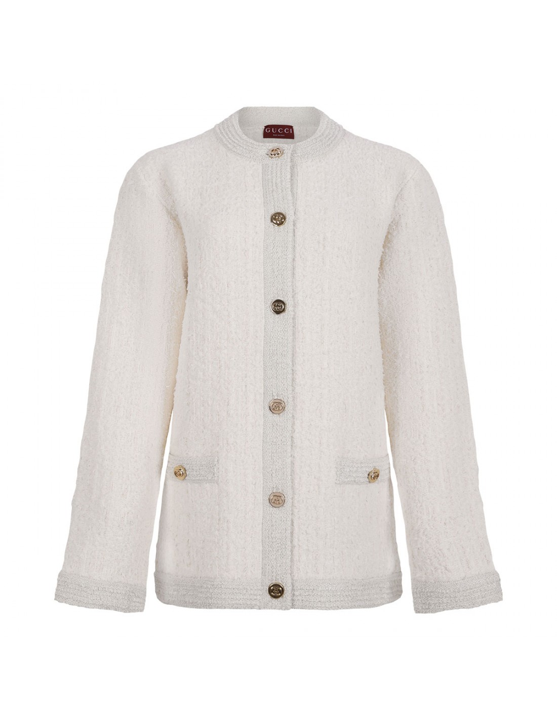 Ivory wool lamé bouclé cardigan from Gucci featuring interlocking G button closure, crewneck, front pockets and long sleeves.
