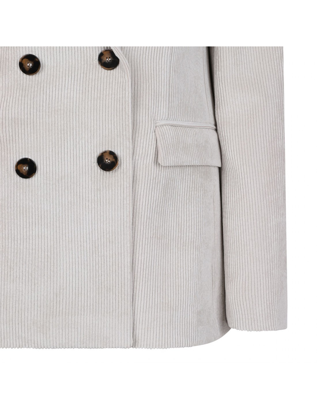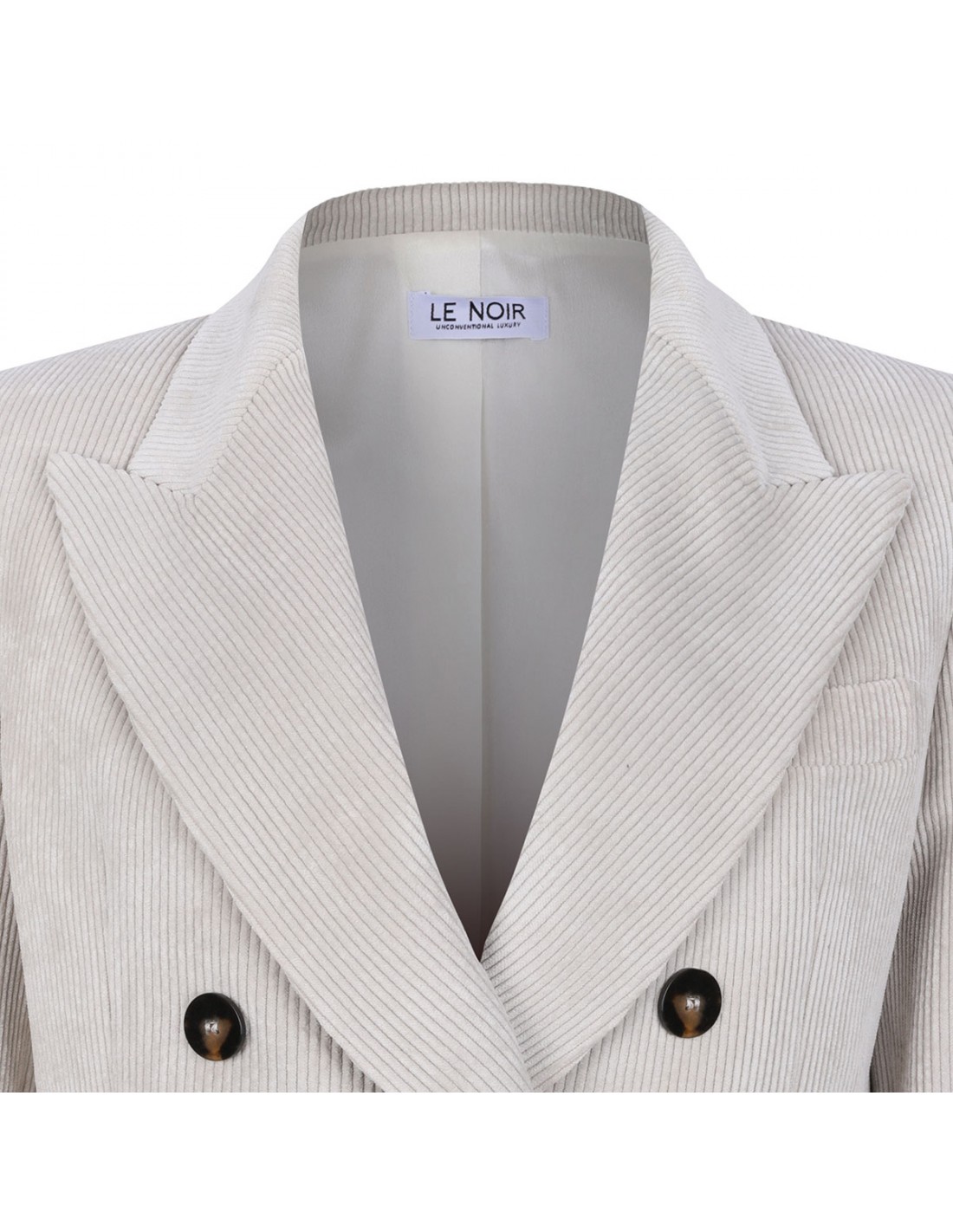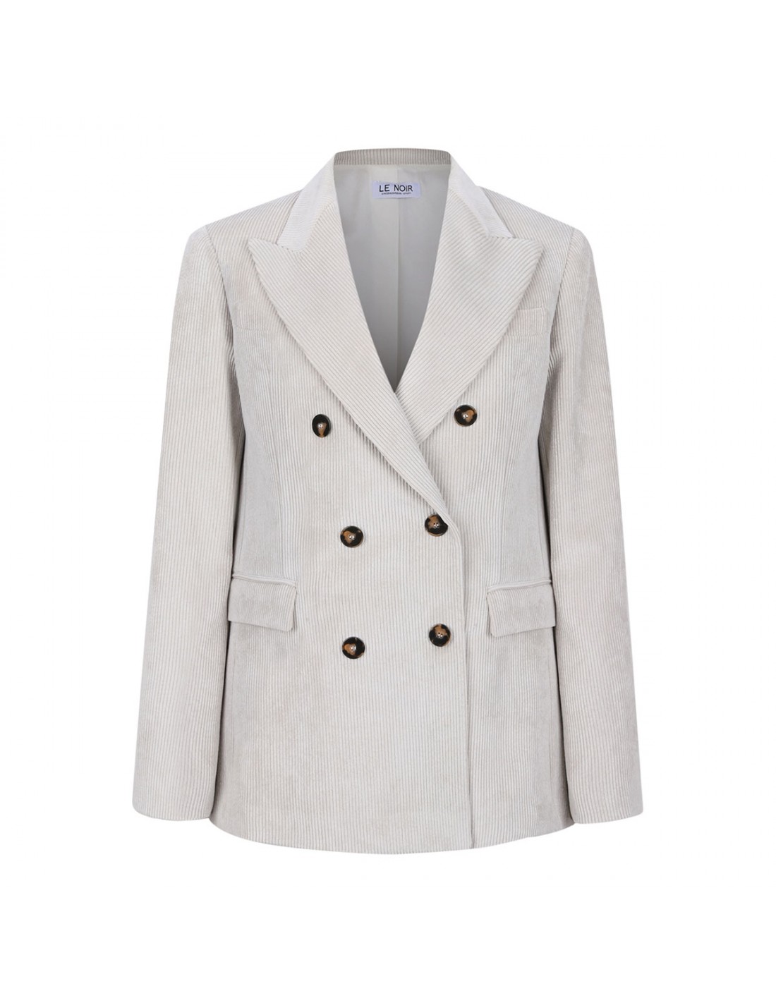 Cream hue corduroy blazer from Le Noir featuring double-breasted style, classic lapel, button closure, side flap pockets, back vent, chest pocket and buttoned cuffs.