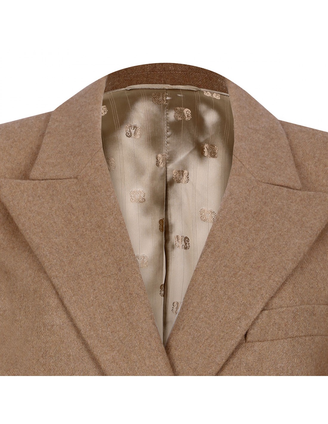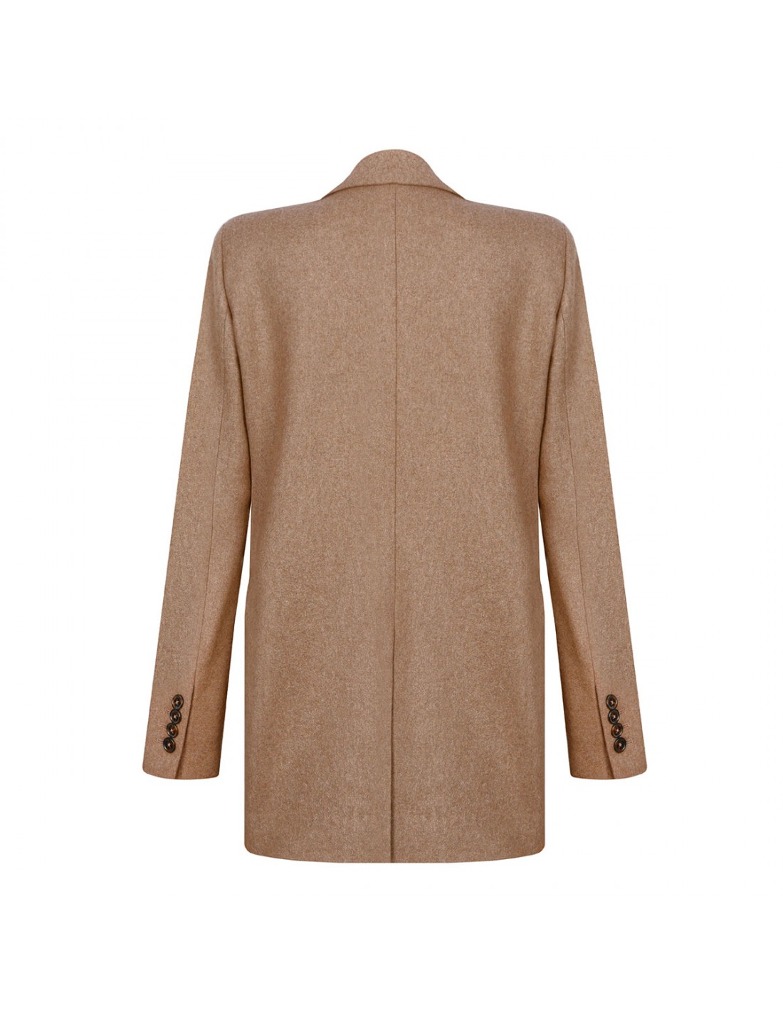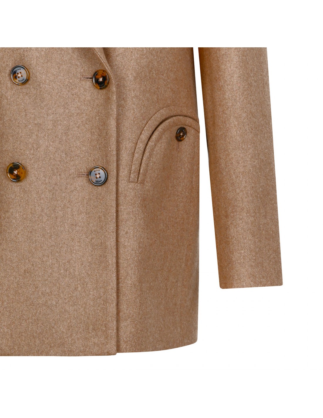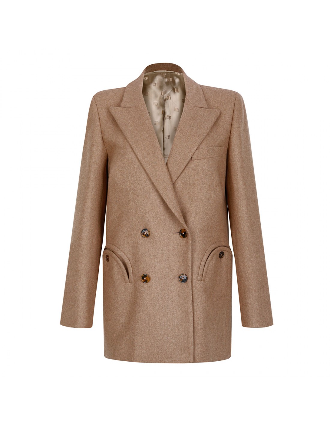 Camel virgin wool and cashmere Cholita everyday blazer from Blazé Milano featuring double-breasted silhouette, marbled acetate button closure, peak lapels, signature smiley pockets with buttons, straight cut, single back vent, camel hue lining.