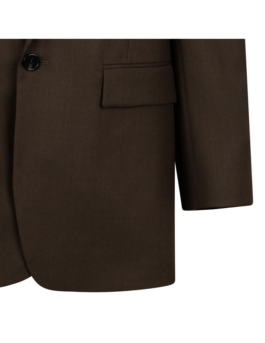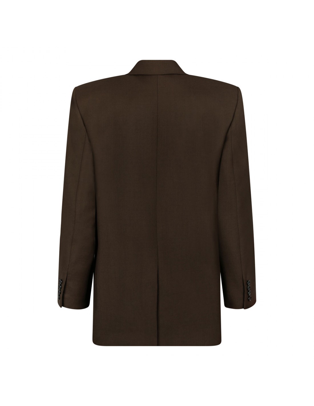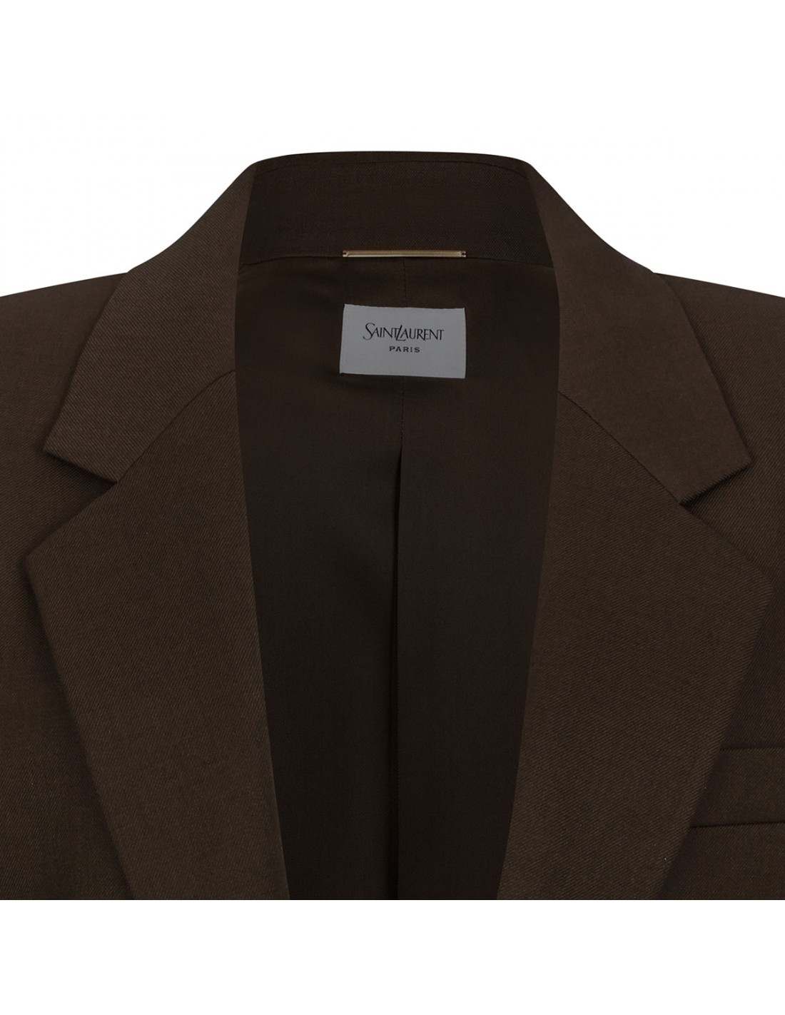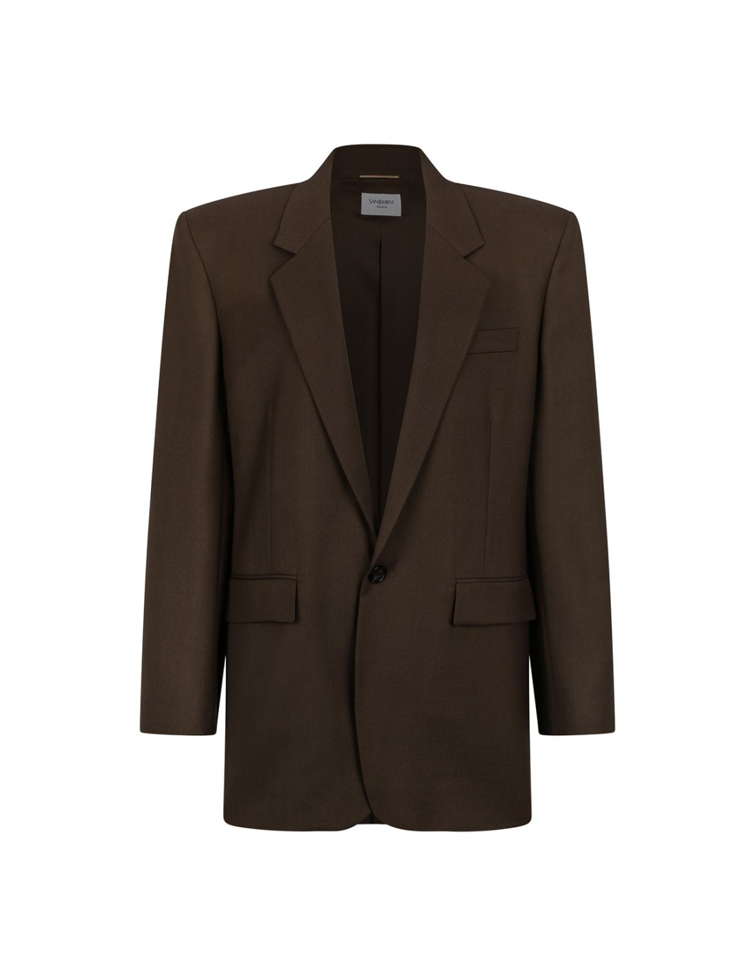 Khaki wool jacket from Saint Laurent featuring single-breasted silhouette, one-button closure, peaked lapel, boxy fit, front flap pockets, welt chest pocket, buttoned cuffs, padded shoulders, back vent.