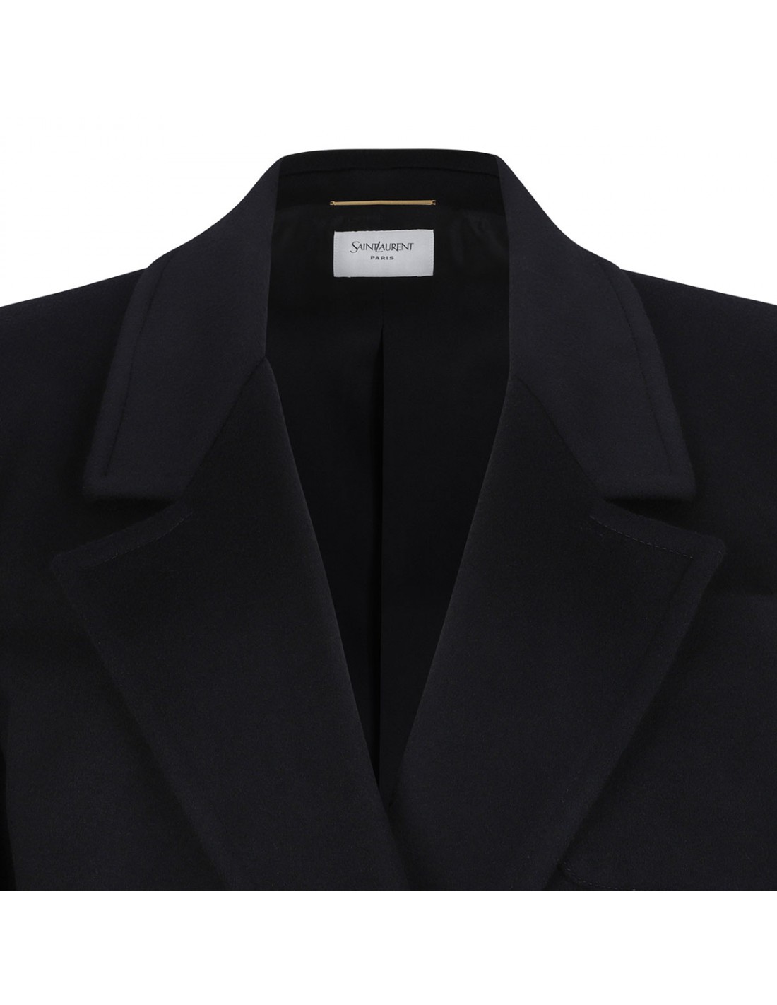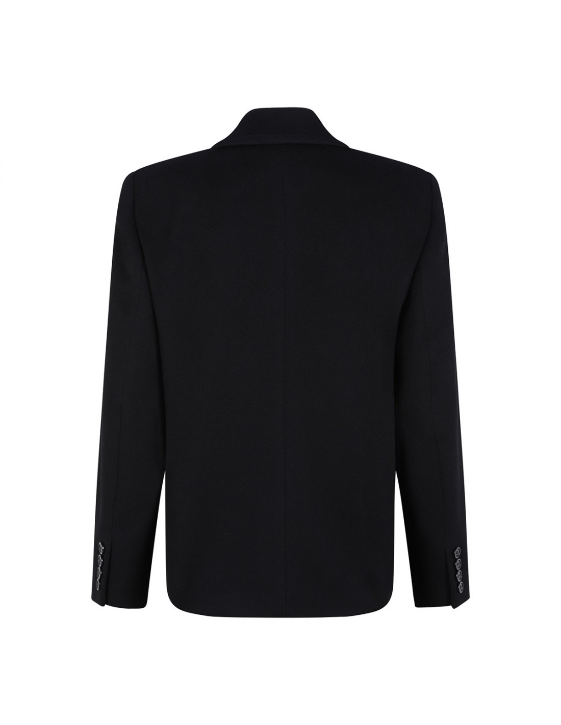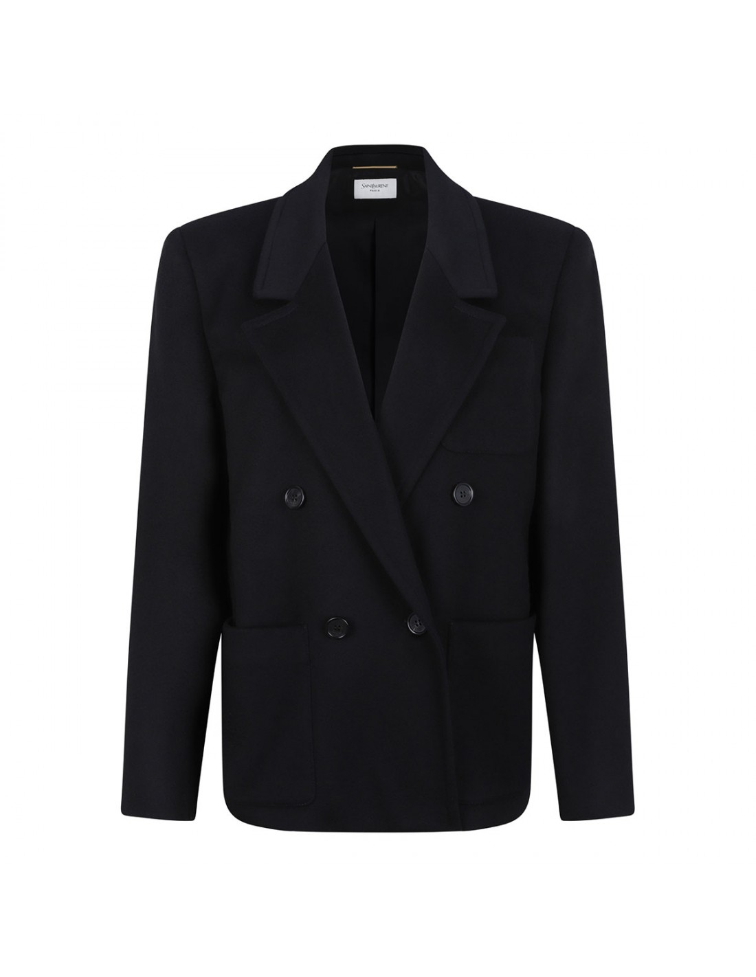 Black wool and cashmere blend jacket from Saint Laurent featuring double-breasted silhouette, button closure, wide lapel, boxy fit, front slit pockets, patch chest pocket, buttoned cuffs, padded shoulders, back vent.